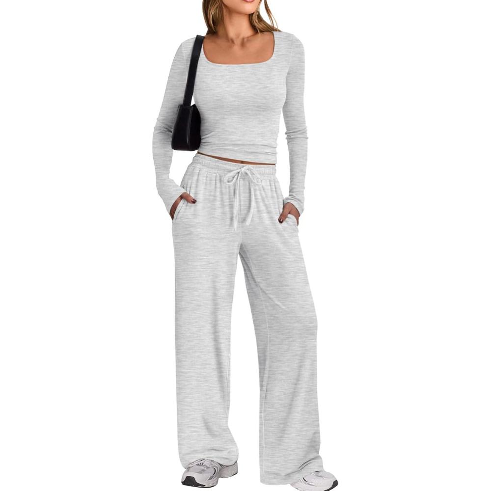 Trendy Queen 2 Piece Scoop Neck Lounge Set Womens Wide Leg Pants Side Ruching Slightly Crop Top Sweatsuit Sets With Pockets(Oatmeal Grey)