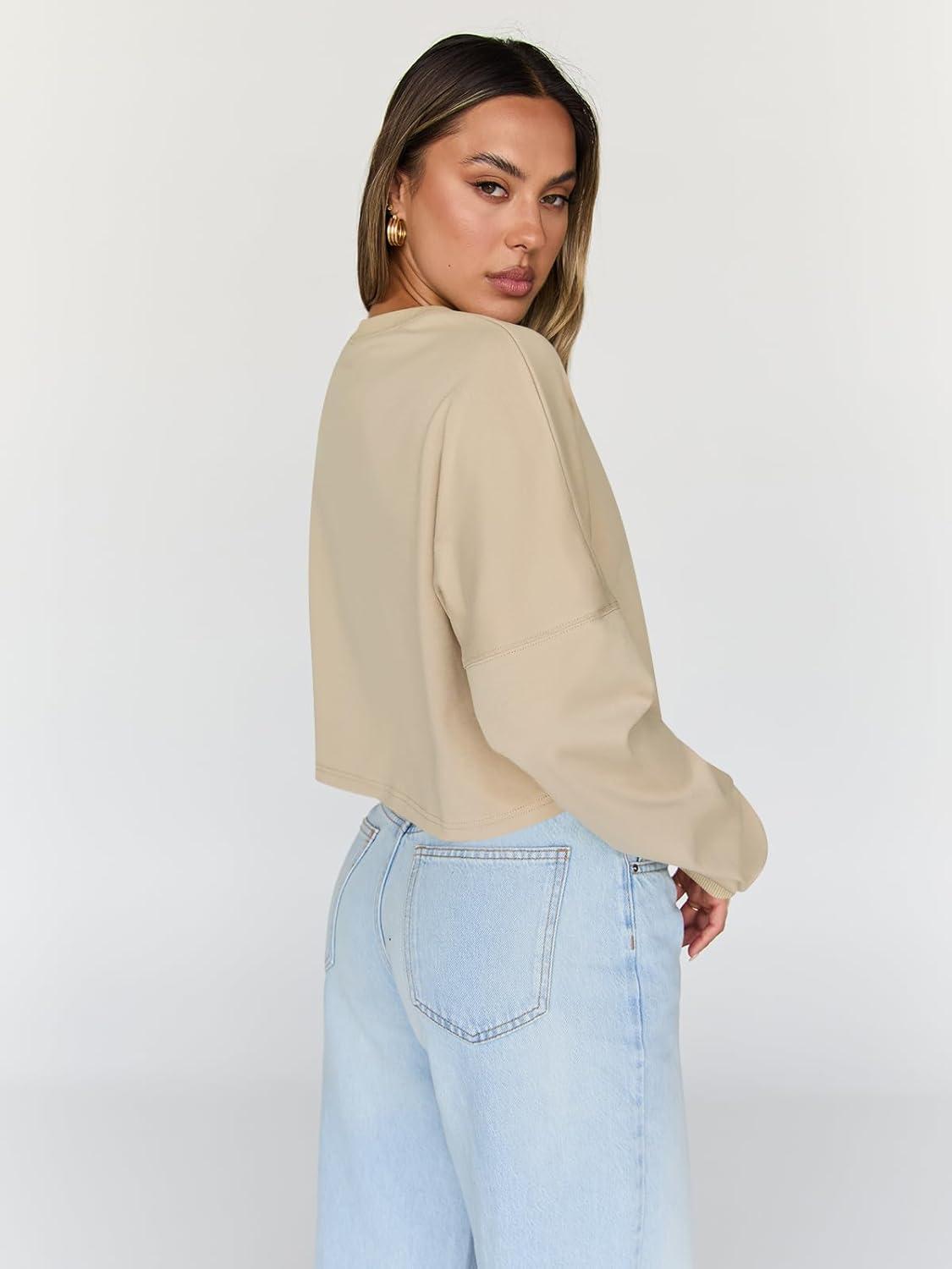 imageTrendy Queen Cropped Sweatshirts for Women Oversized Crewneck Sweaters Long Sleeve Tops Fall Winter Clothes 2025Apricot