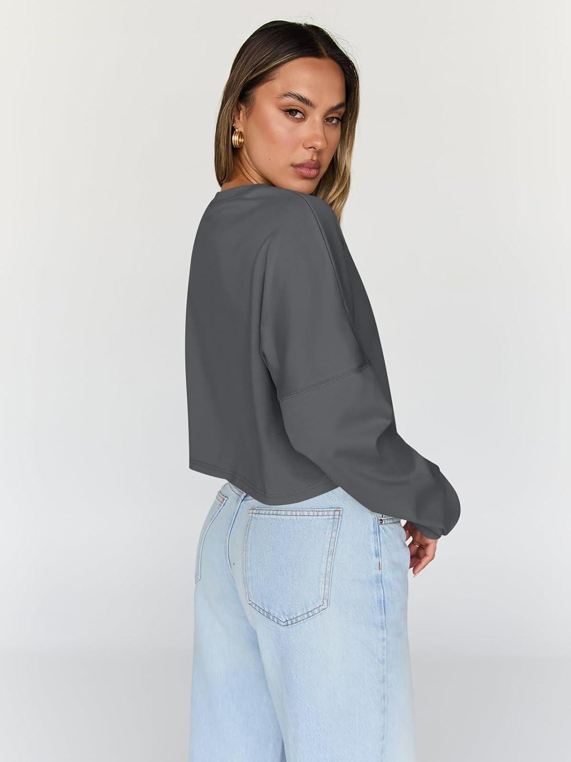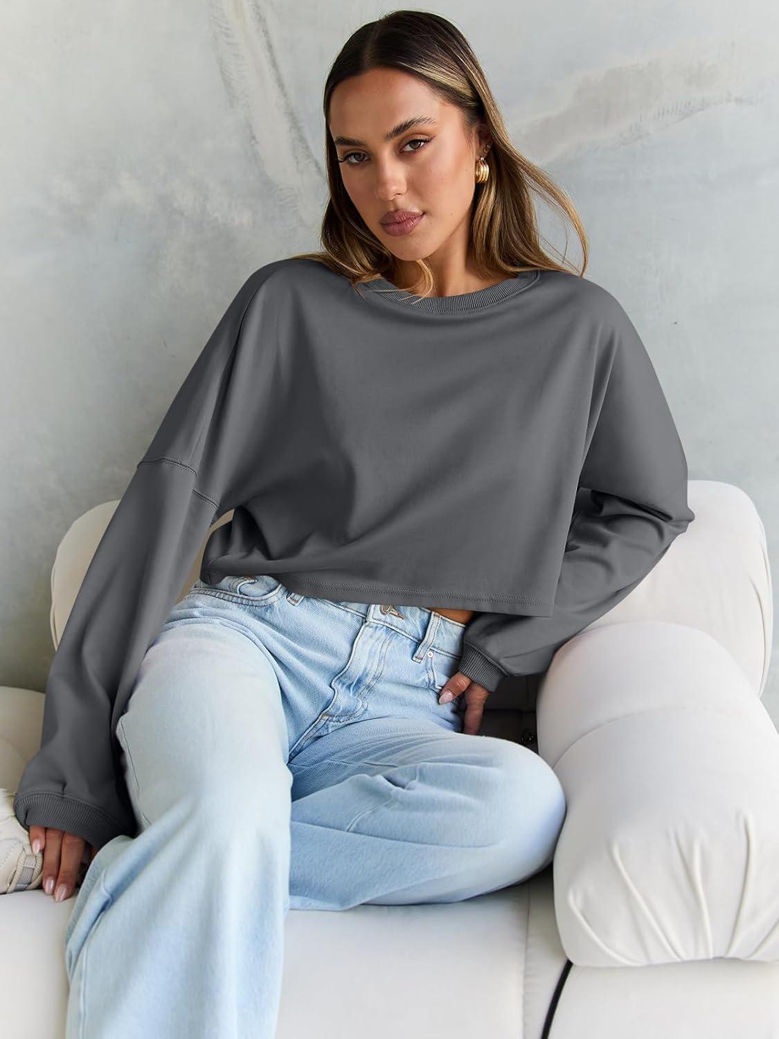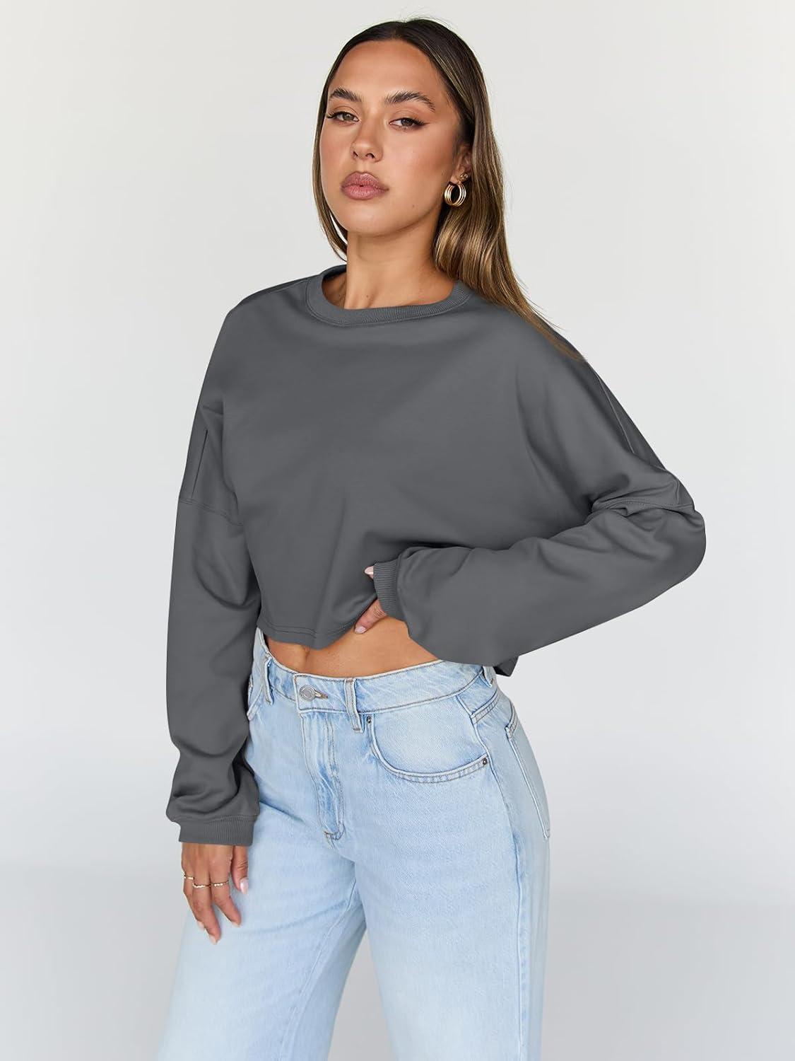 Trendy Queen Cropped Sweatshirts for Women Oversized Crewneck Sweaters Long Sleeve Tops Fall Winter Clothes 2025(Deepgrey)
