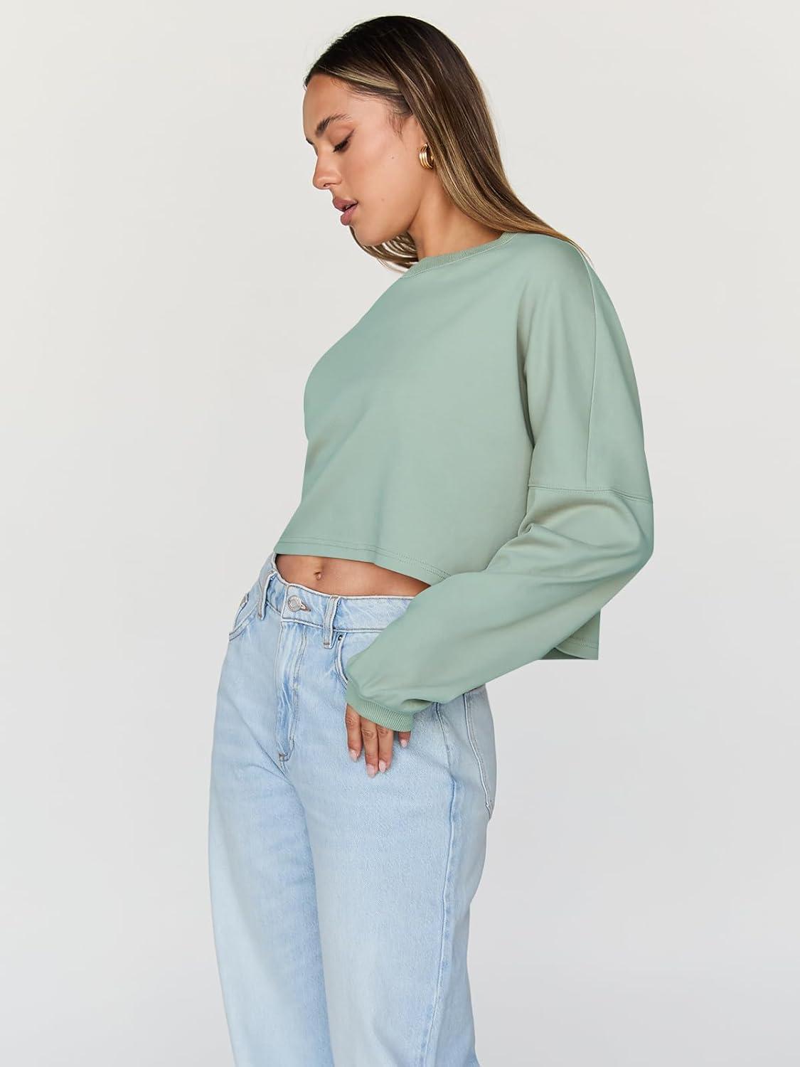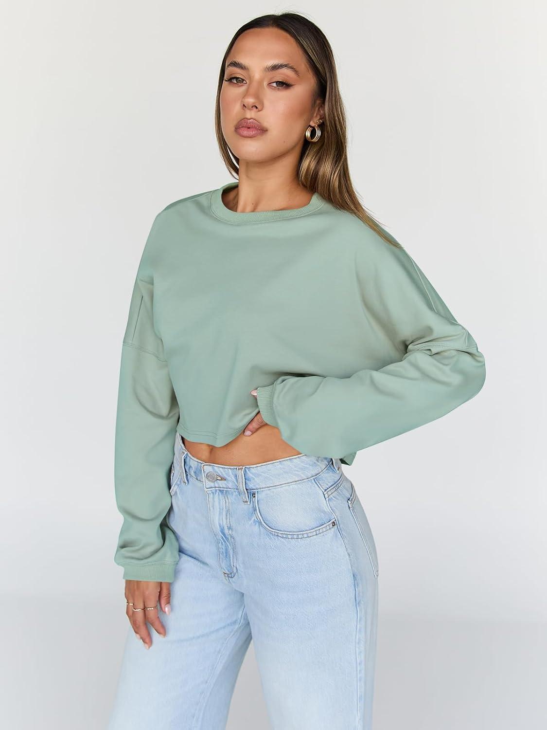 Trendy Queen Cropped Sweatshirts for Women Oversized Crewneck Sweaters Long Sleeve Tops Fall Winter Clothes 2025(Lightgreen)