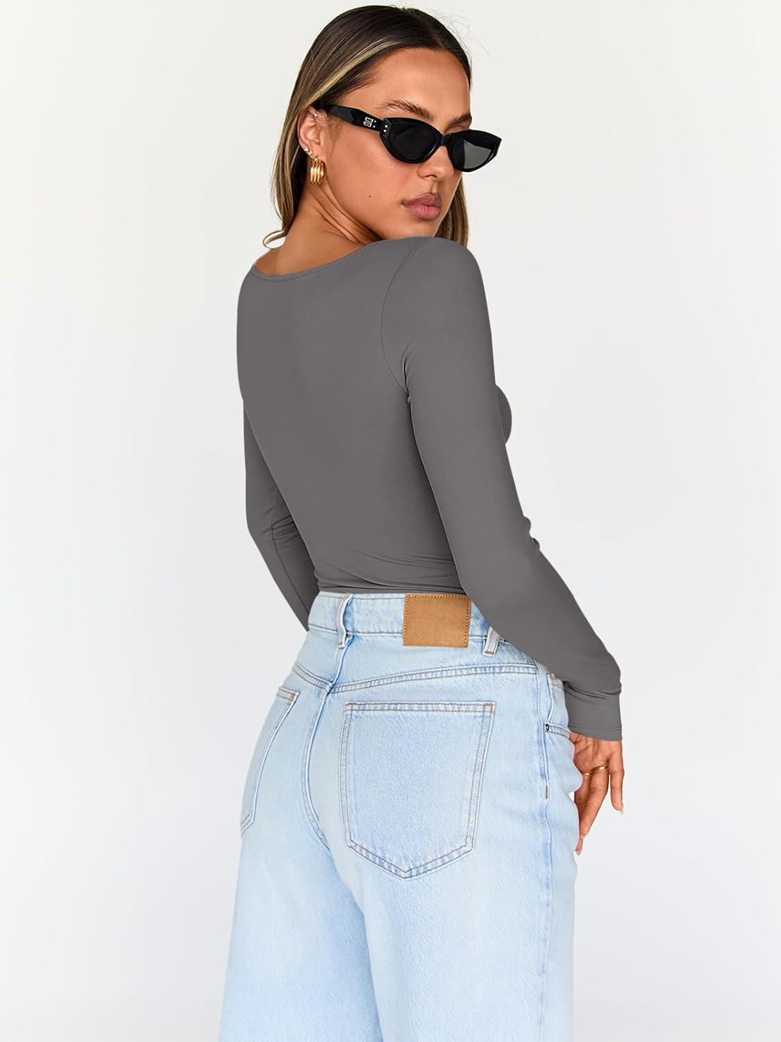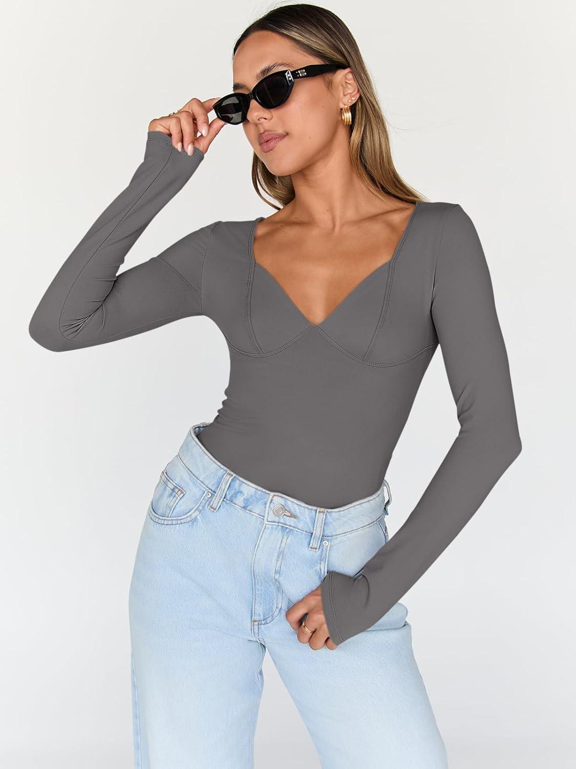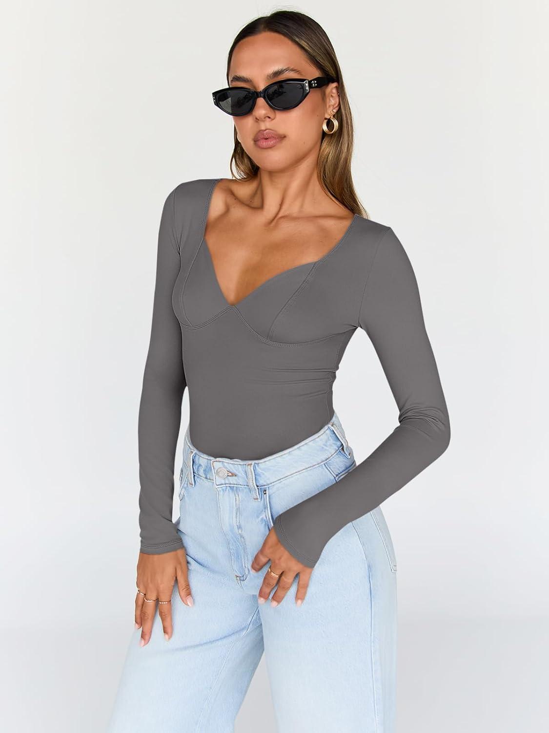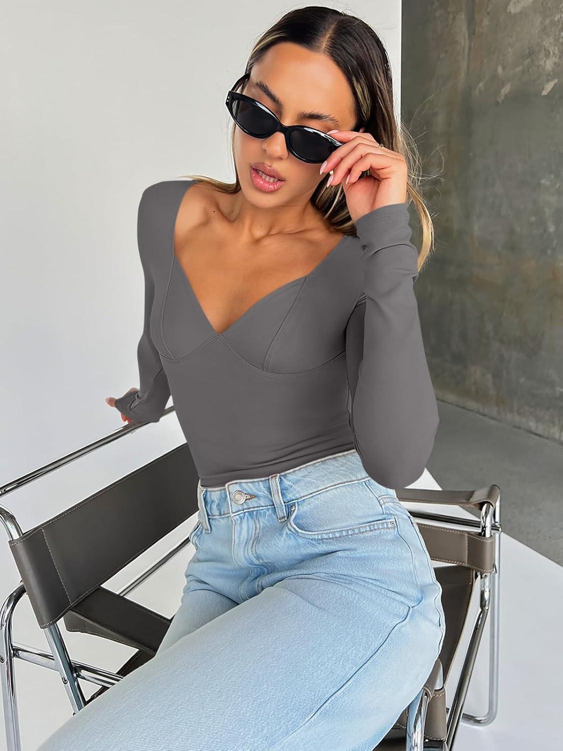 Trendy Queen Going Out Tops for Women Trendy Long Sleeve Shirts Fashion Clothing V Neck Basic Y2K Clothes Cute Shirt Corset(Grey)