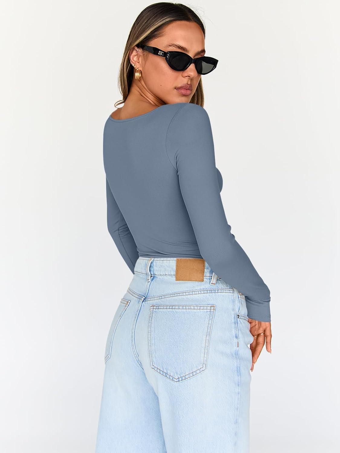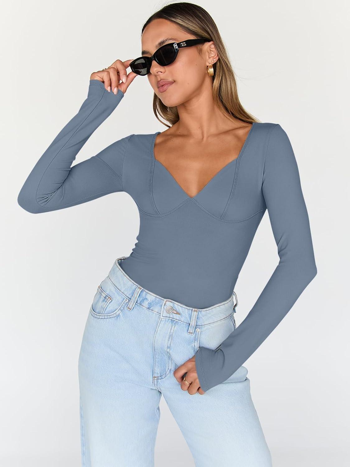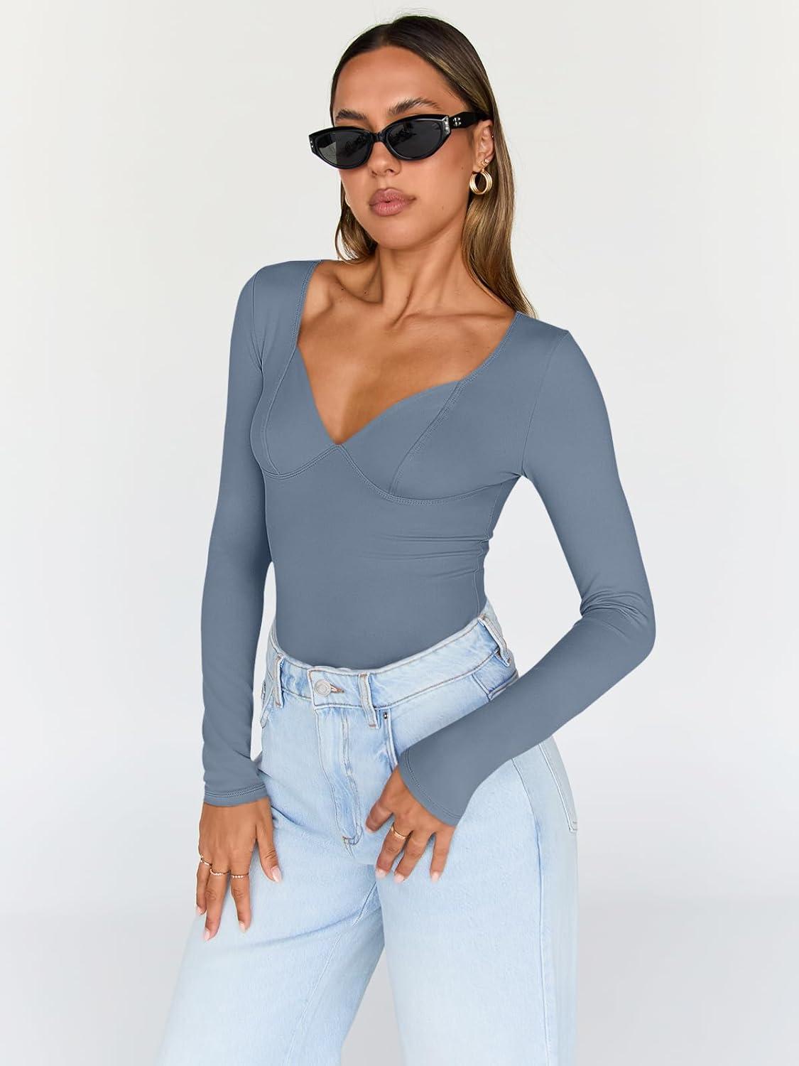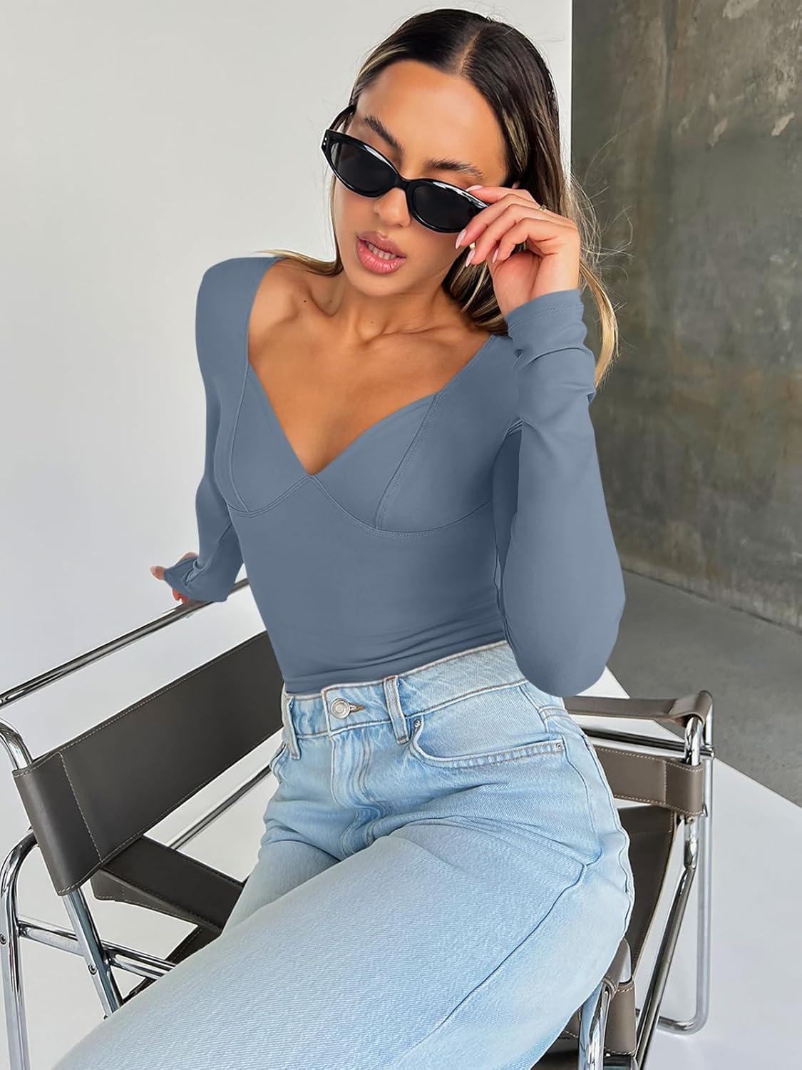 Trendy Queen Going Out Tops for Women Trendy Long Sleeve Shirts Fashion Clothing V Neck Basic Y2K Clothes Cute Shirt Corset(Haze Blue)