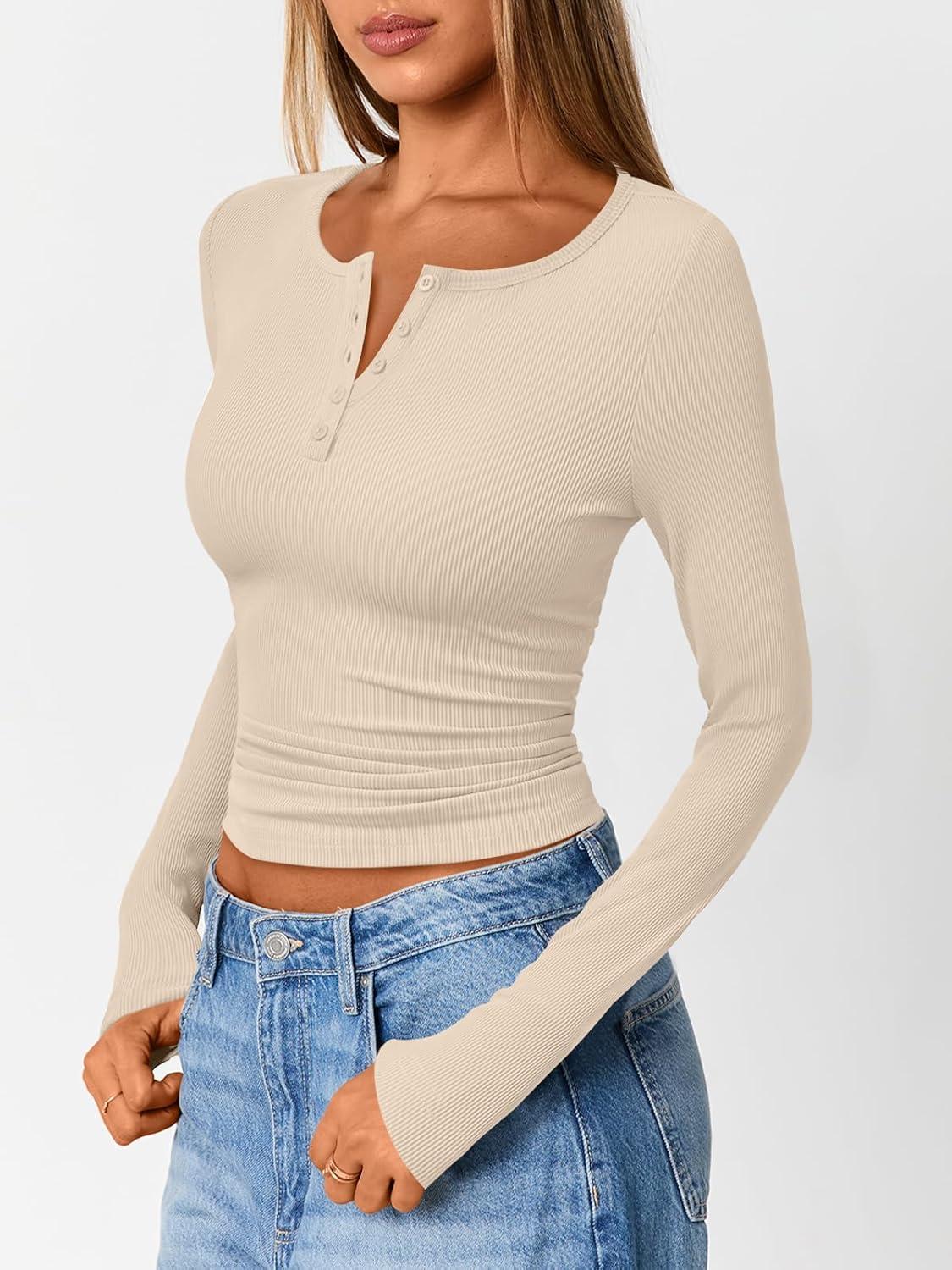 Trendy Queen Long Sleeve Henley Shirts for Women Fall Winter Ribbed Thermal Tops Casual Blouses Basics Tees Cute Sweaters(Apricot)