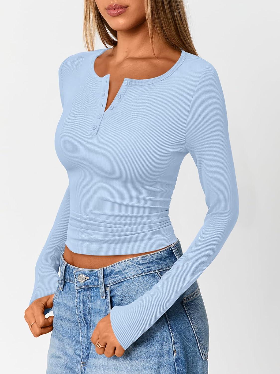 Trendy Queen Long Sleeve Henley Shirts for Women Fall Winter Ribbed Thermal Tops Casual Blouses Basics Tees Cute Sweaters(Blue)