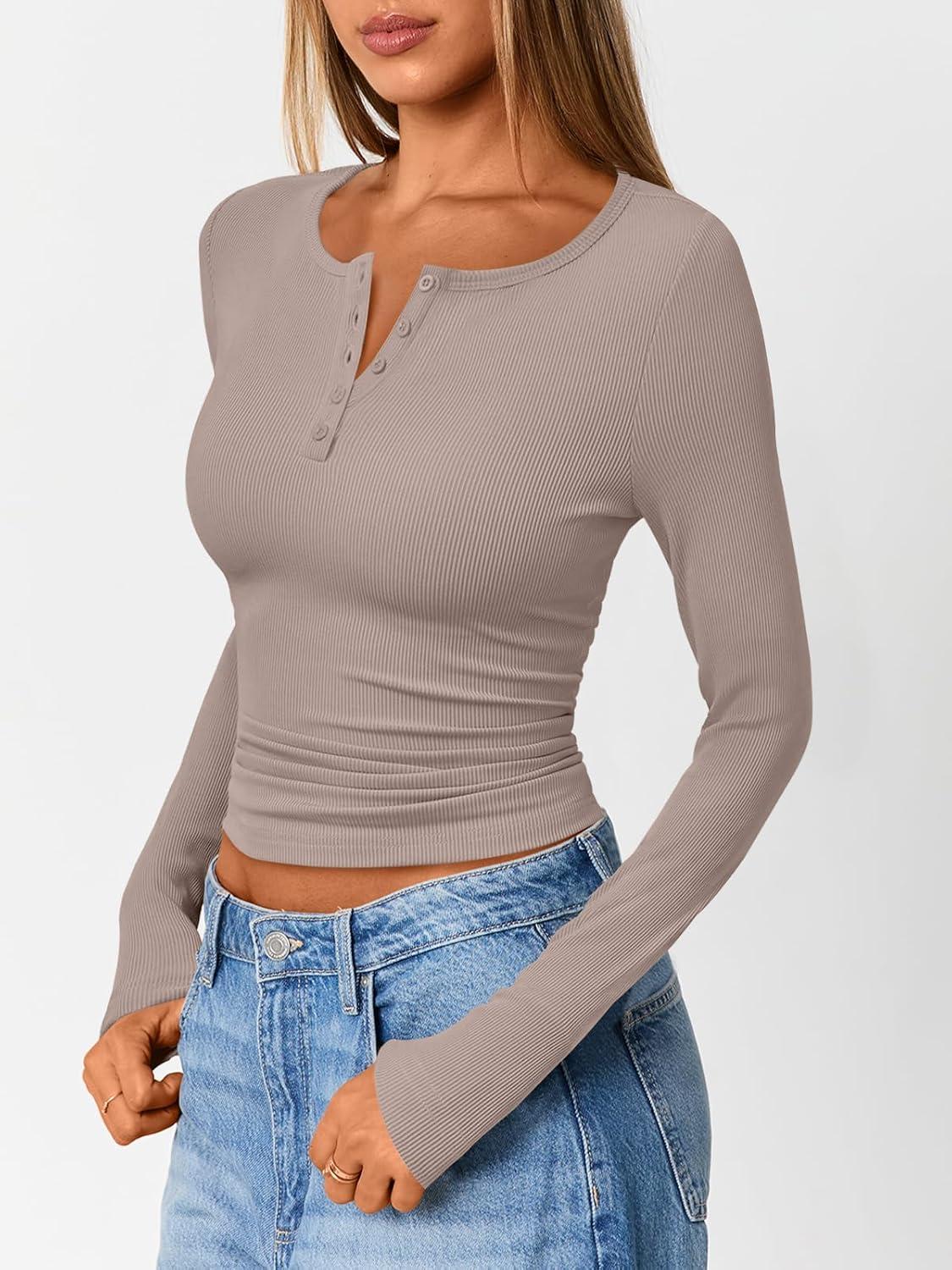 Trendy Queen Long Sleeve Henley Shirts for Women Fall Winter Ribbed Thermal Tops Casual Blouses Basics Tees Cute Sweaters(Taupe)