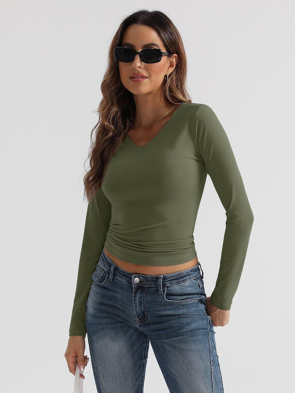 Trendy Queen Long Sleeve Shirts for Women 2025 Fall Fashion V Neck Basics Crop Tops Slim Fitted Y2K Tops Outfits Clothes(Army Green)
