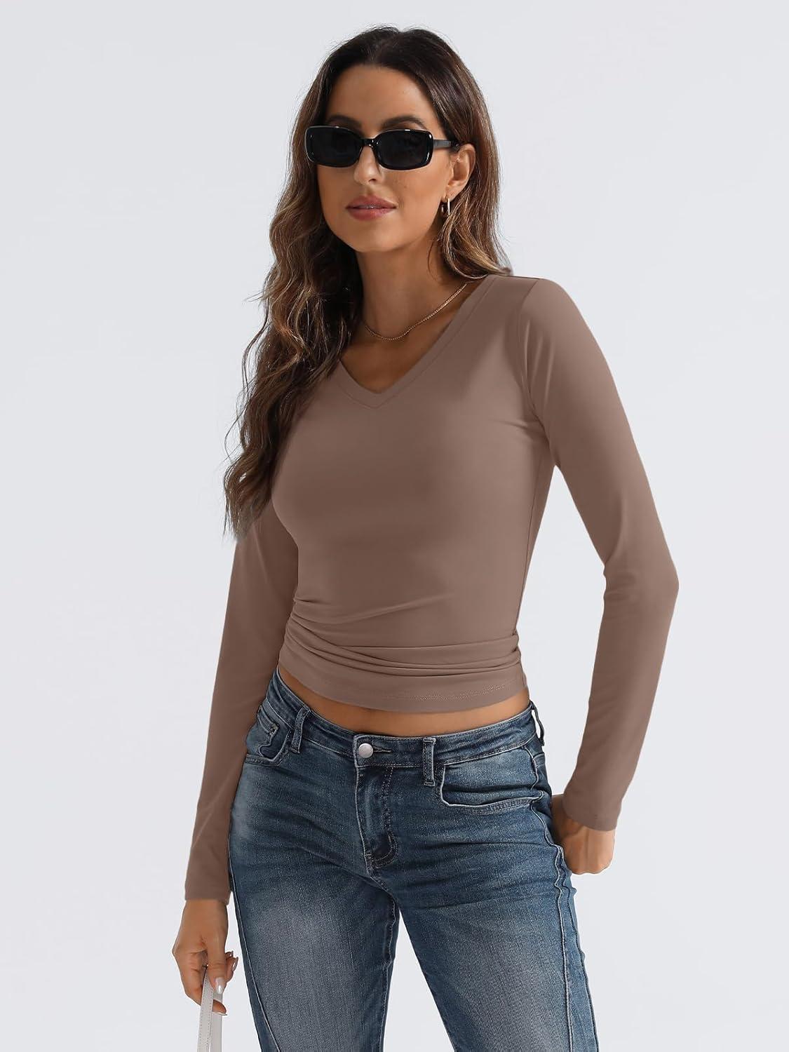 Trendy Queen Long Sleeve Shirts for Women 2025 Fall Fashion V Neck Basics Crop Tops Slim Fitted Y2K Tops Outfits Clothes(Coffee Grey)