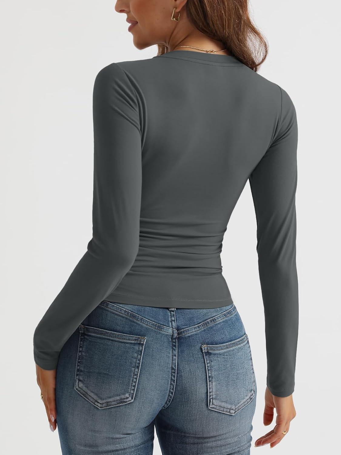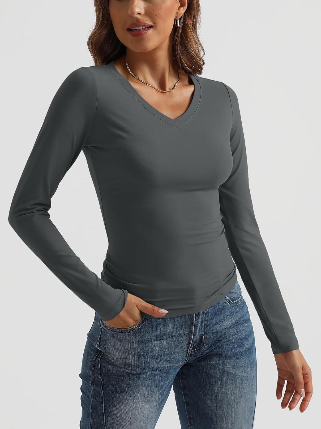Trendy Queen Long Sleeve Shirts for Women 2025 Fall Fashion V Neck Basics Crop Tops Slim Fitted Y2K Tops Outfits Clothes(Gray)
