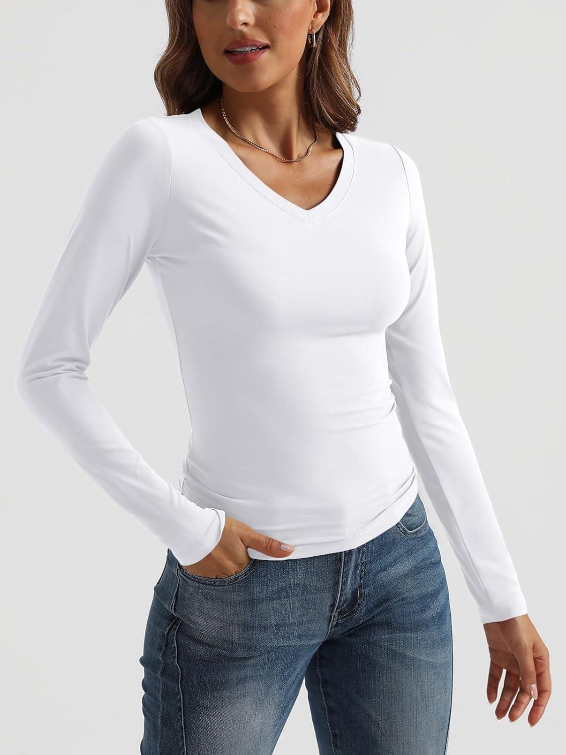 Trendy Queen Long Sleeve Shirts for Women 2025 Fall Fashion V Neck Basics Crop Tops Slim Fitted Y2K Tops Outfits Clothes(White)