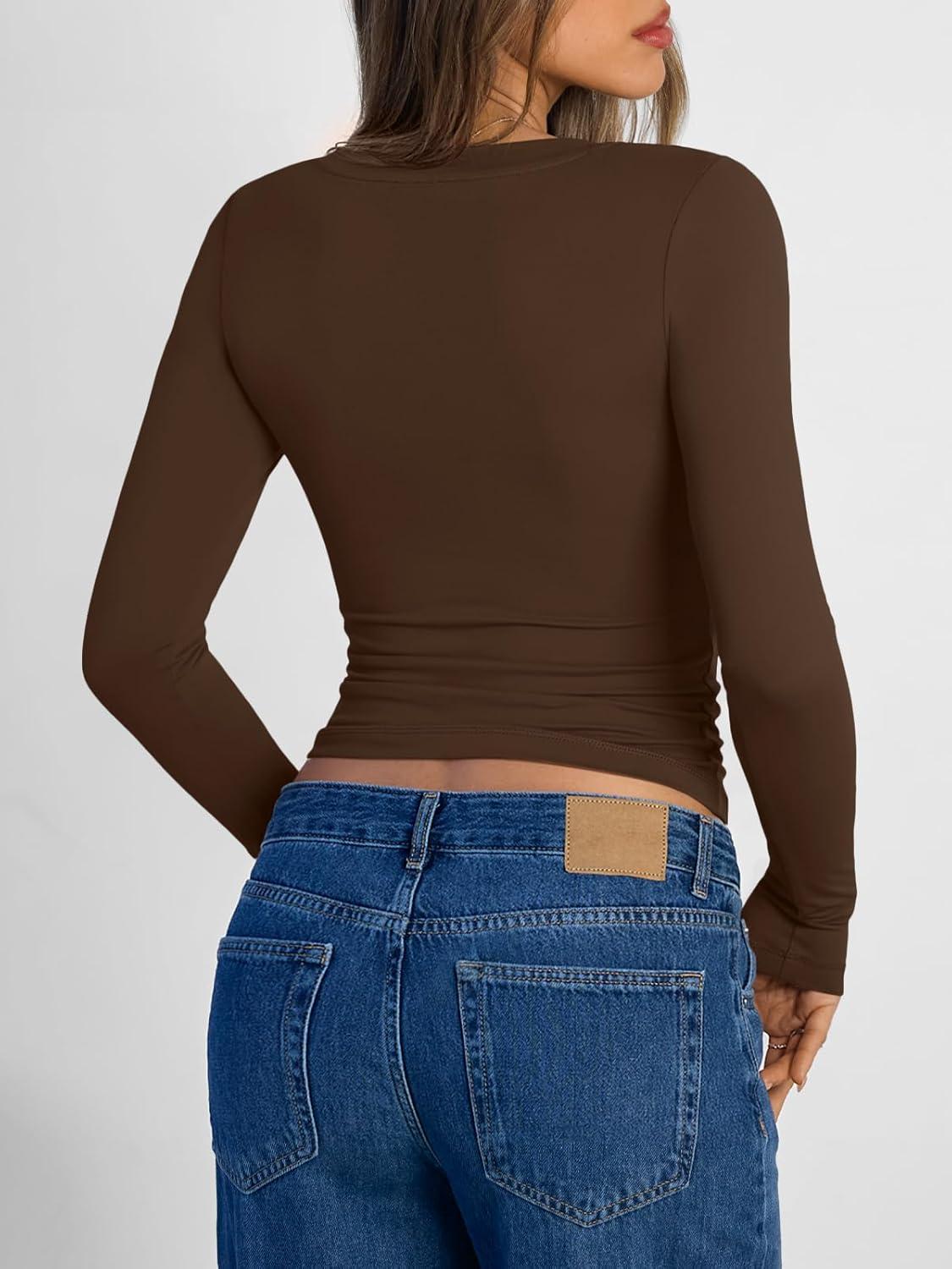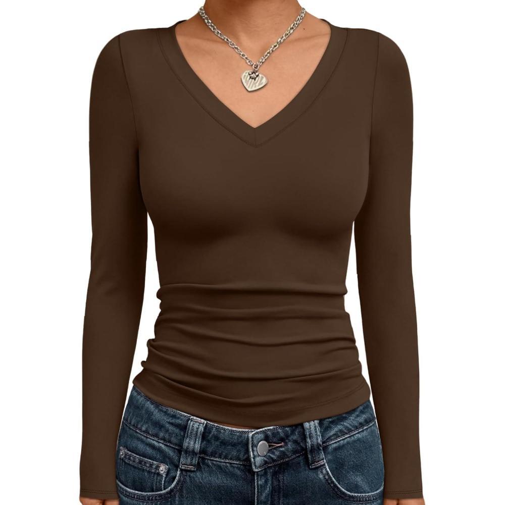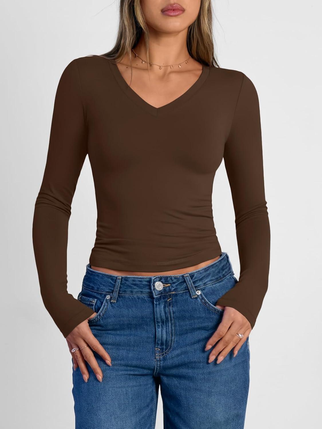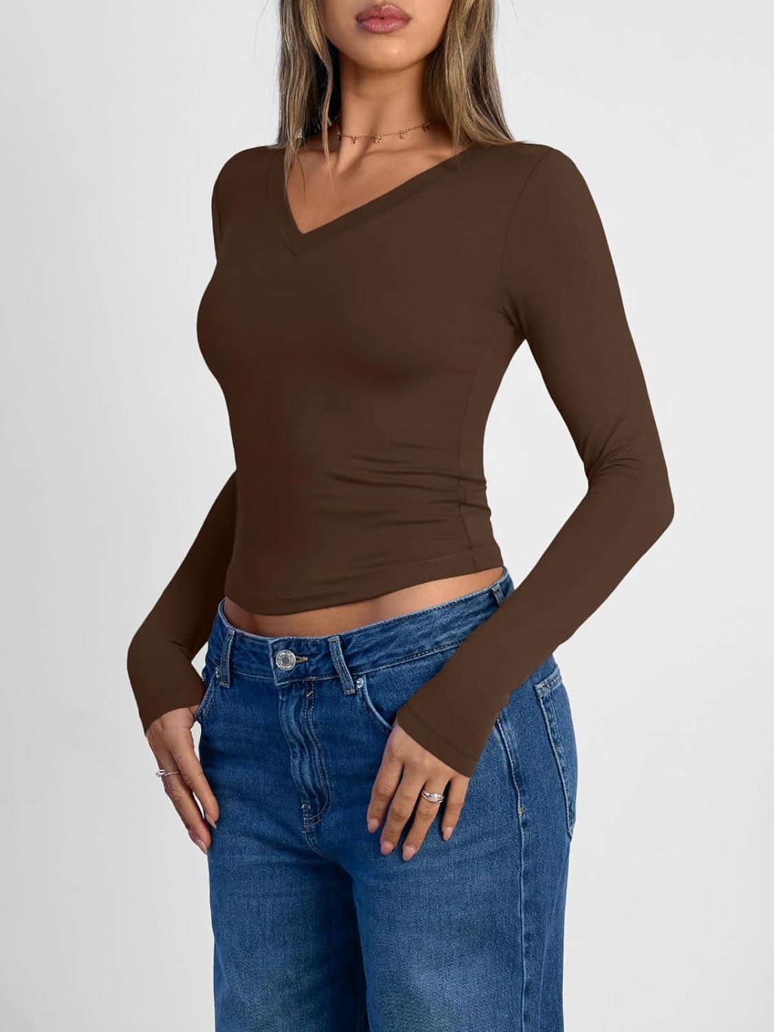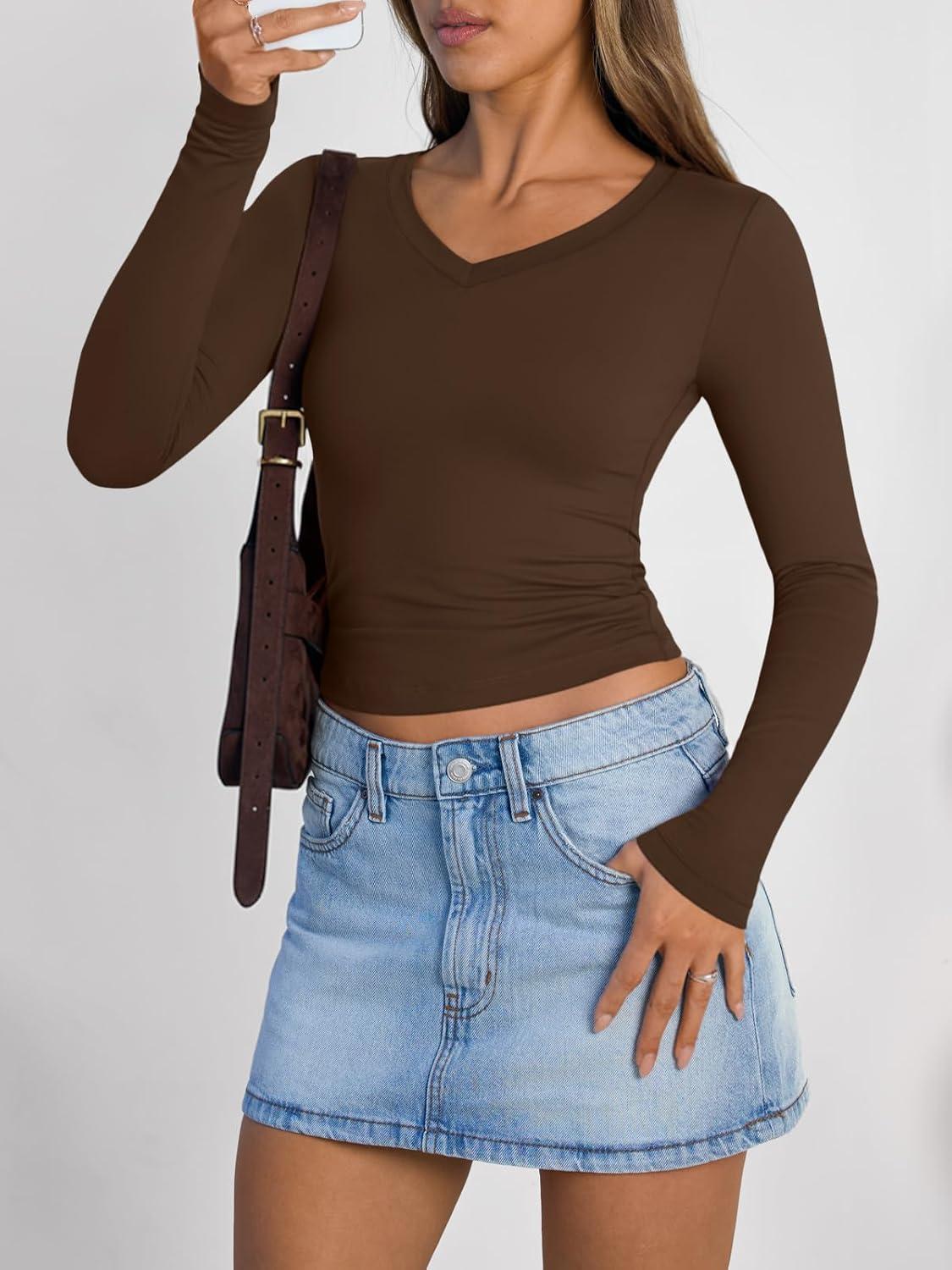 Trendy Queen Long Sleeve Shirts for Women 2026 Fall Fashion V Neck Basics Crop Tops Slim Fitted Y2K Tops Outfits Clothes(Chocolate Brown)