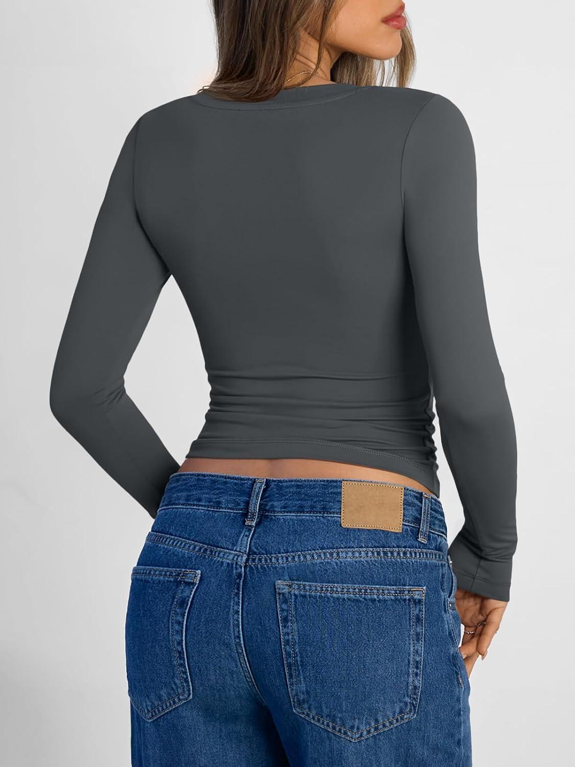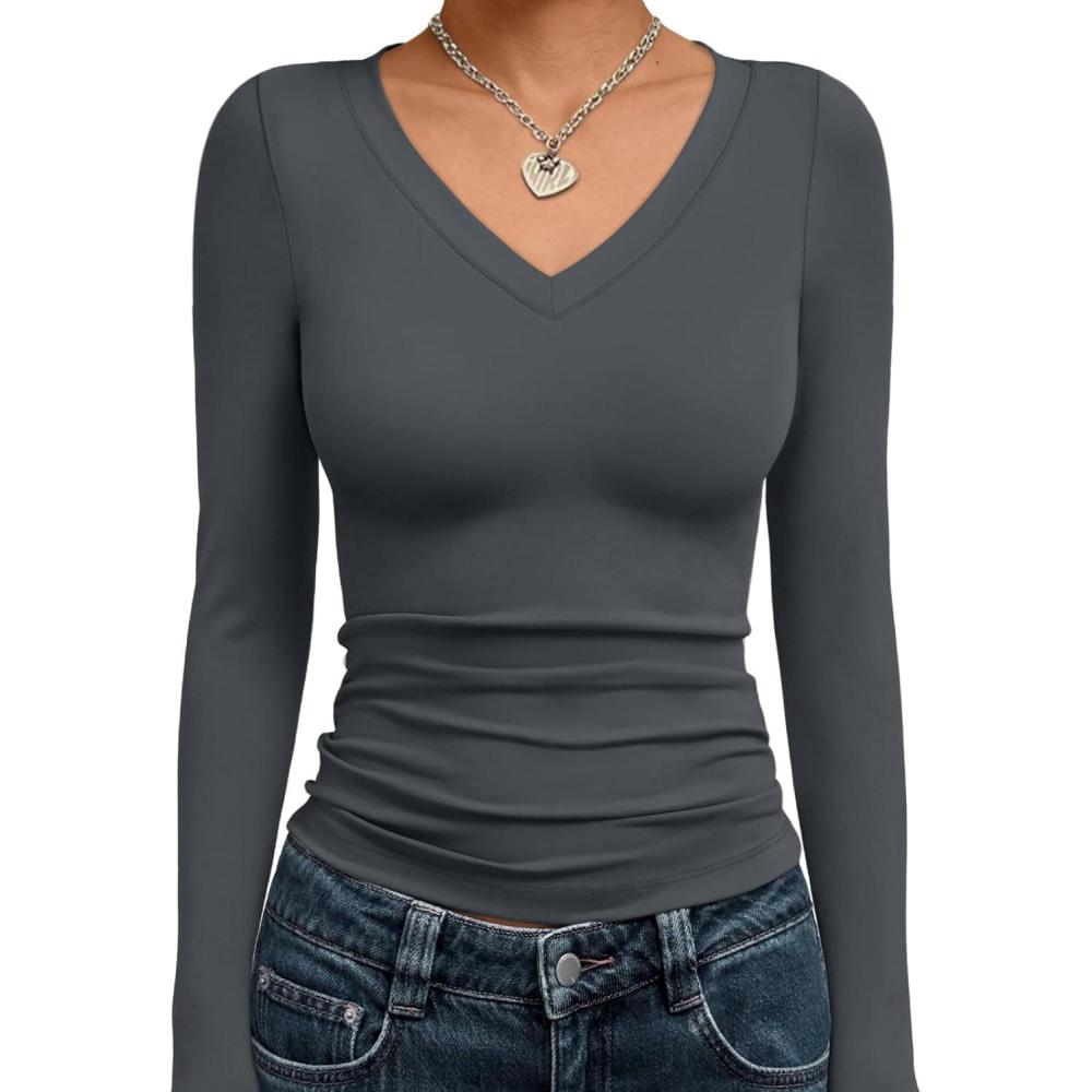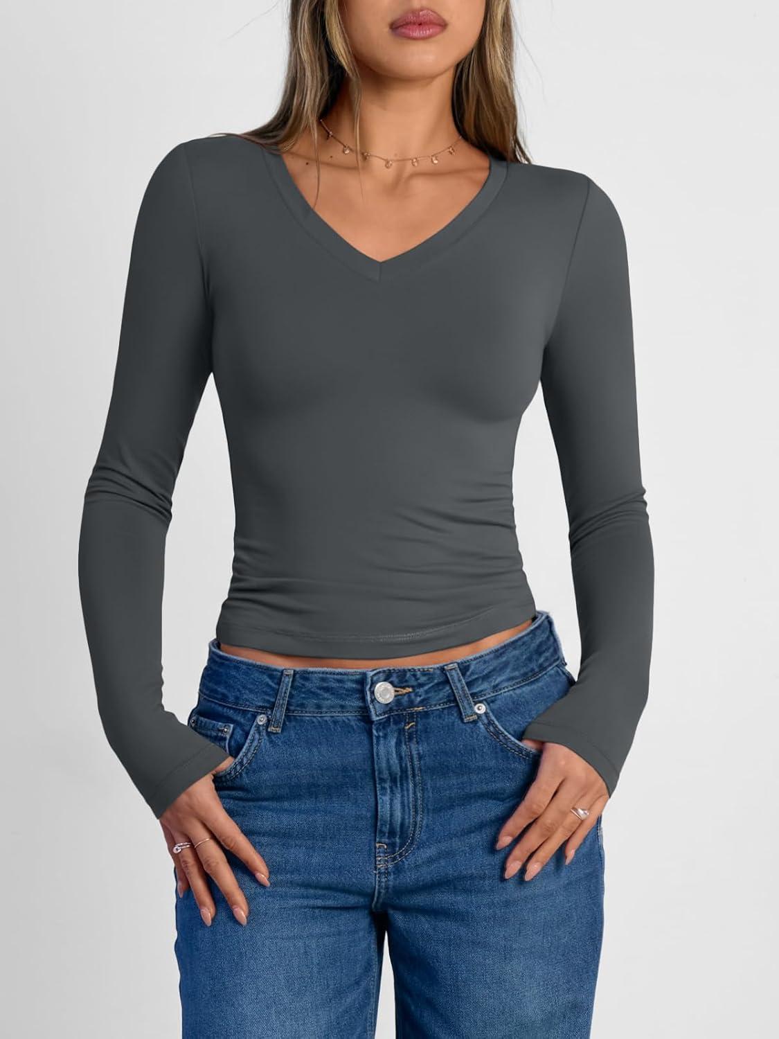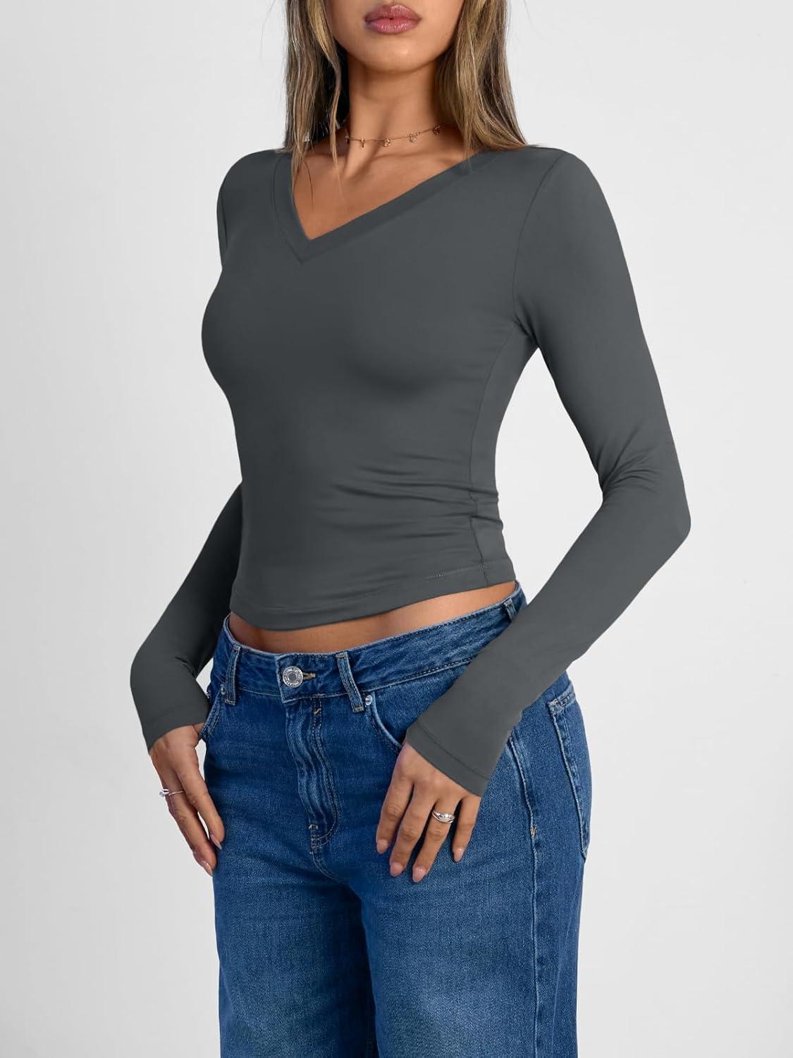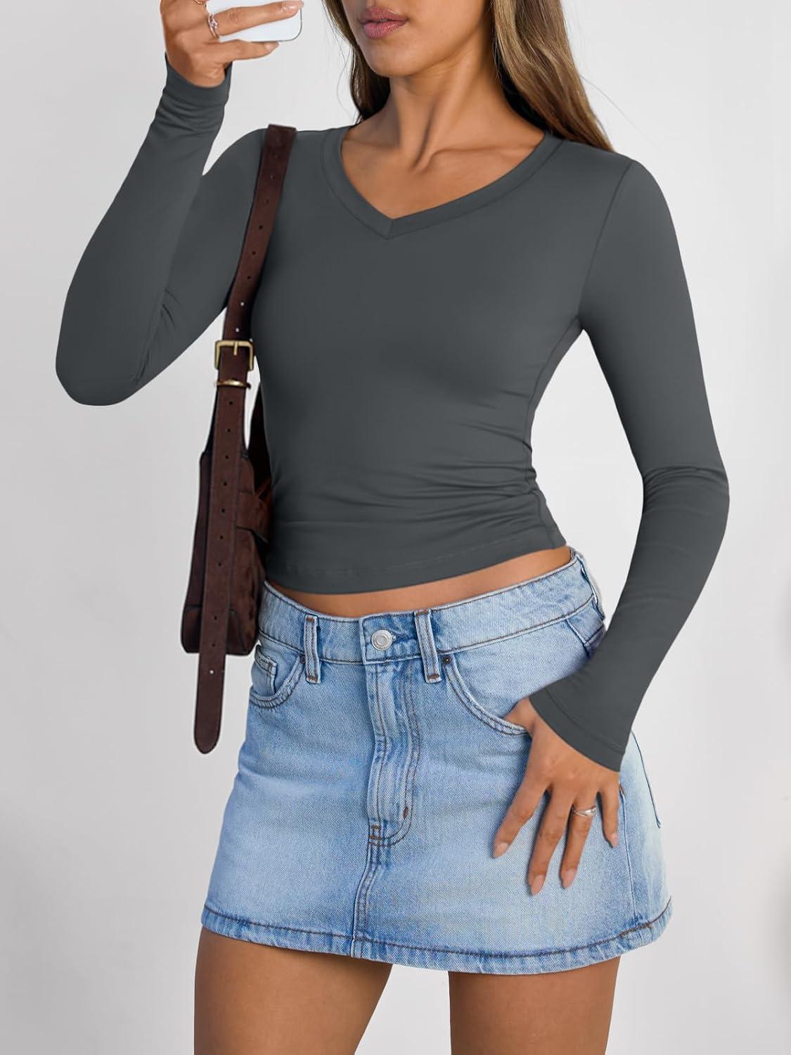 Trendy Queen Long Sleeve Shirts for Women 2026 Fall Fashion V Neck Basics Crop Tops Slim Fitted Y2K Tops Outfits Clothes(Gray)