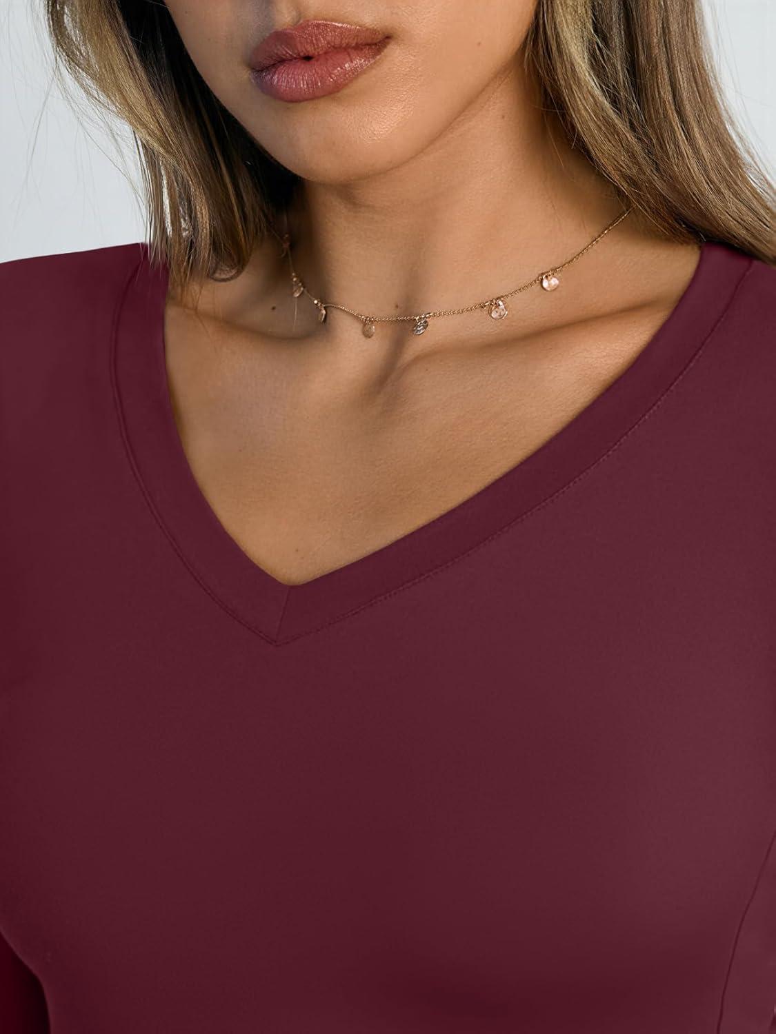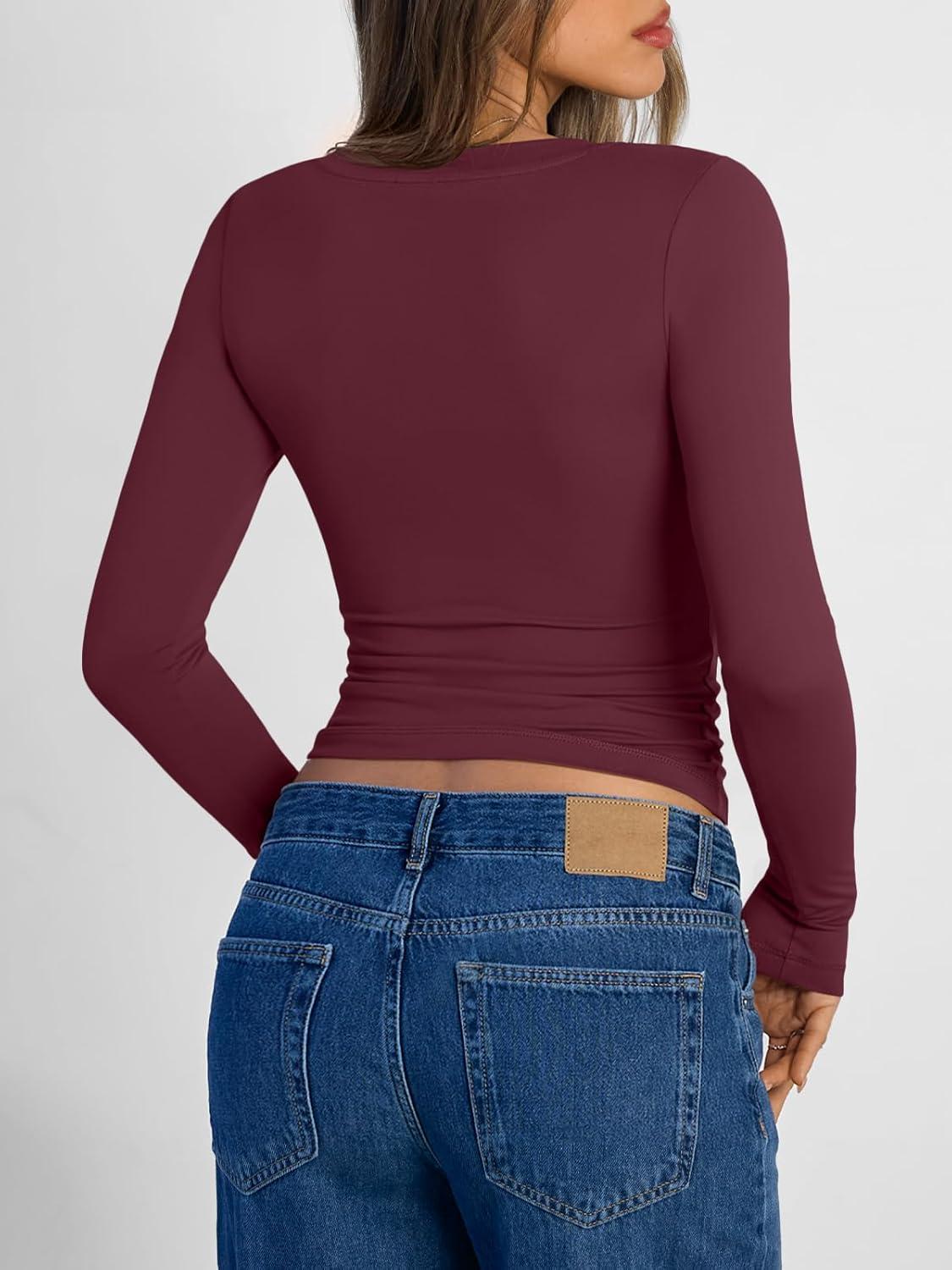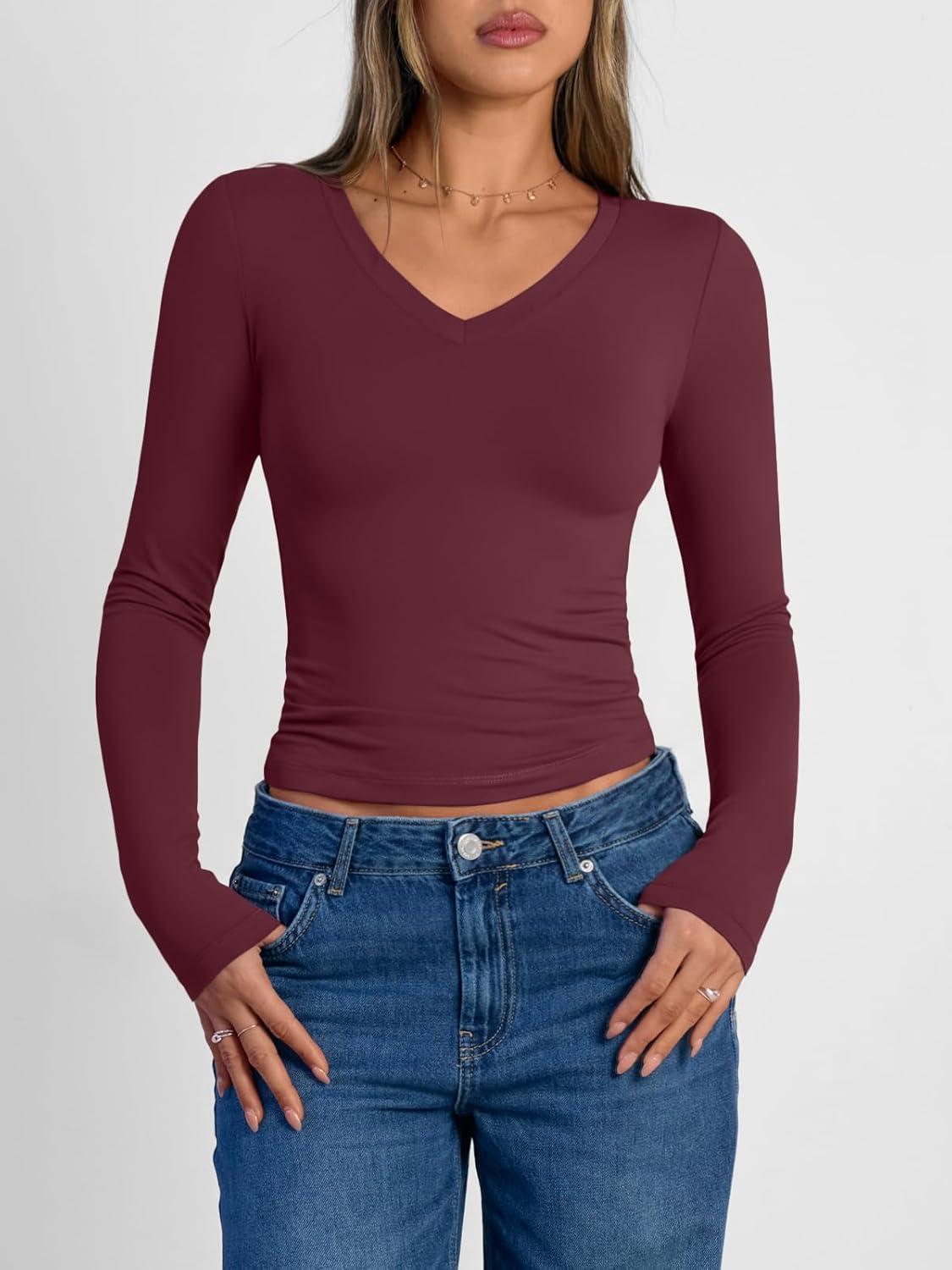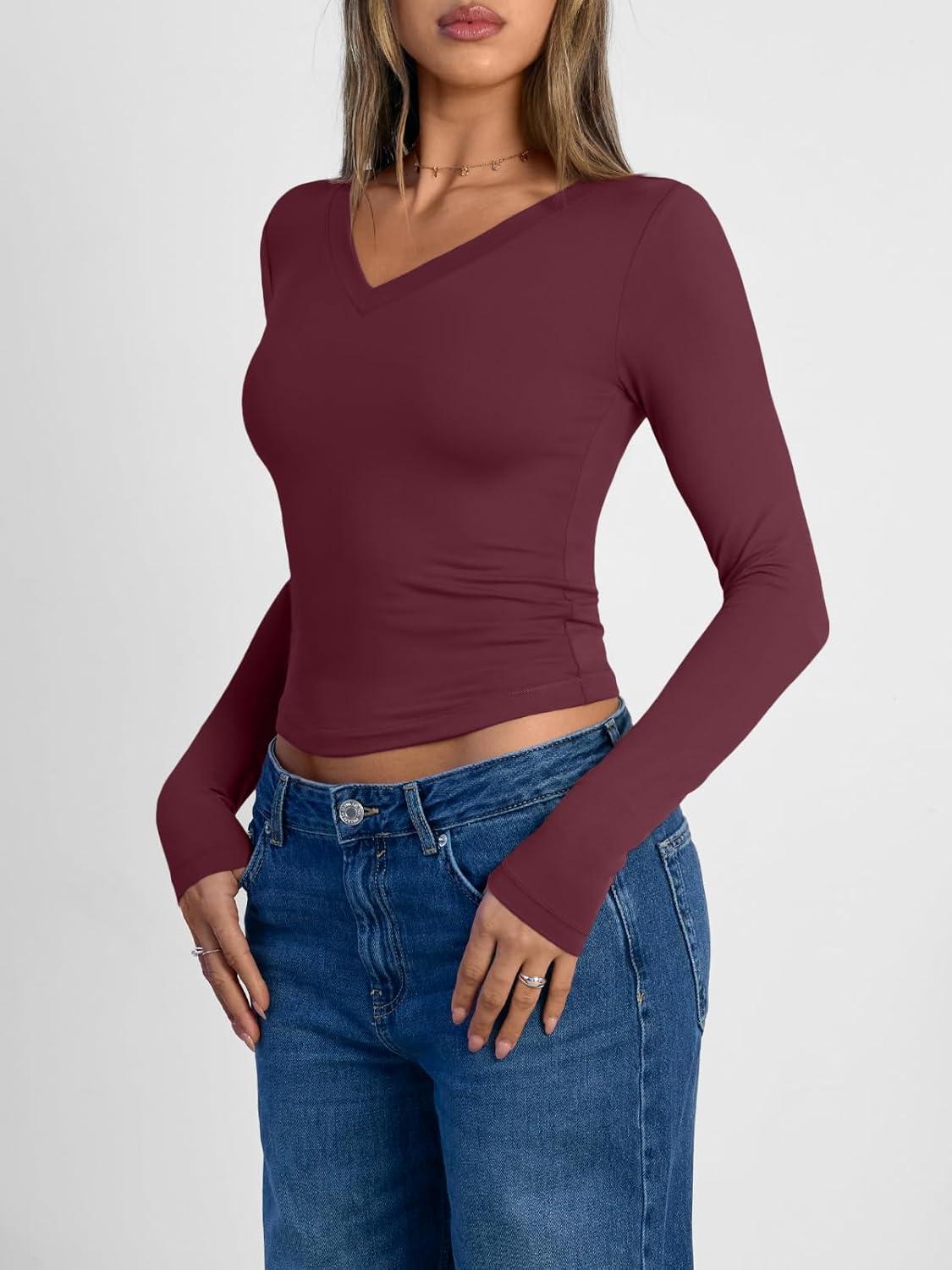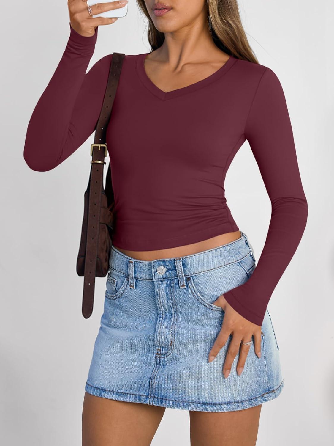Trendy Queen Long Sleeve Shirts for Women 2026 Fall Fashion V Neck Basics Crop Tops Slim Fitted Y2K Tops Outfits Clothes(Wine Red)