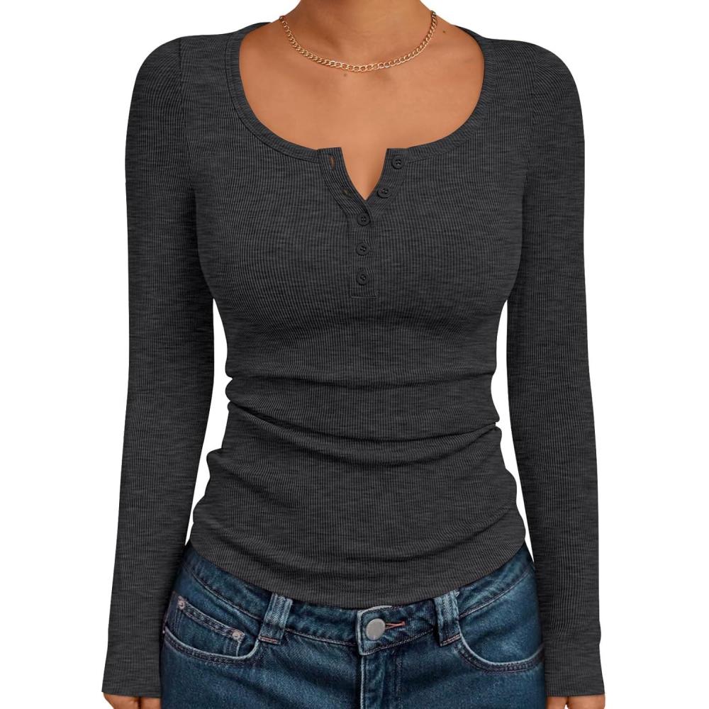 Trendy Queen Long Sleeve Shirts for Women Henley Ribbed Fall Tops Dressy Business Casual Teen Girl Winter Cute Basic Tees(Dark Grey)
