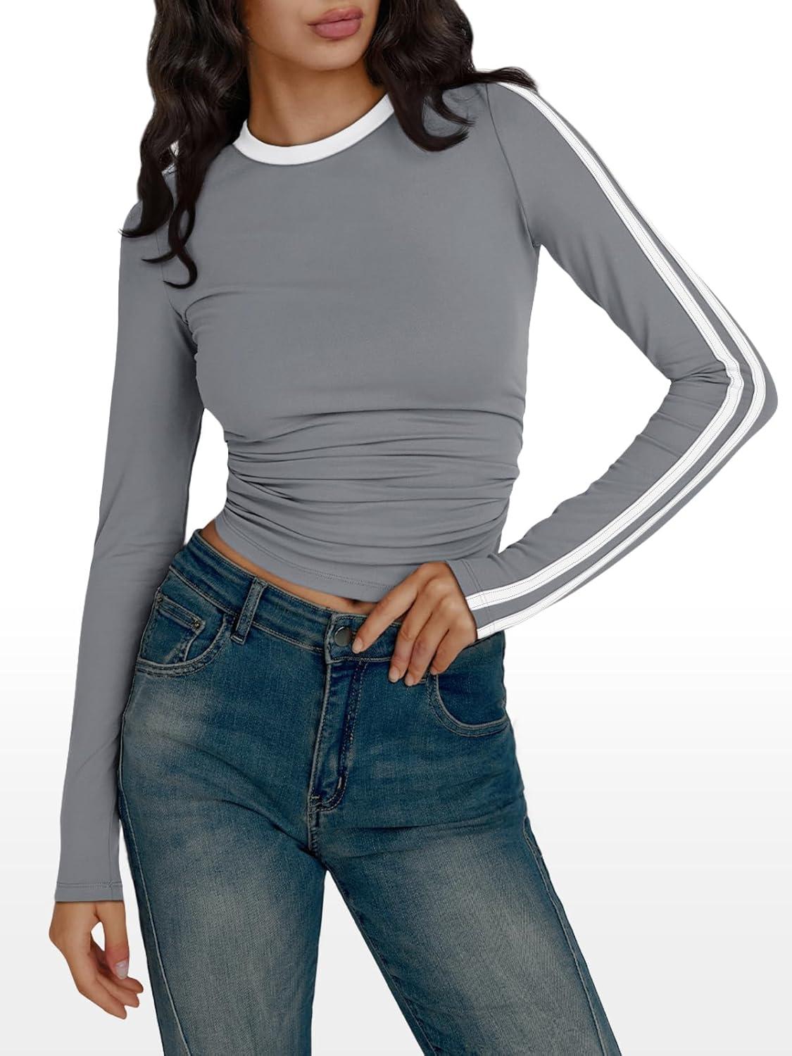 Trendy Queen Long Sleeve Workout Tops for Women Y2K Fitted Athletic Gym Shirt Trendy Color Block 2025 Fall Outfits(Gray)