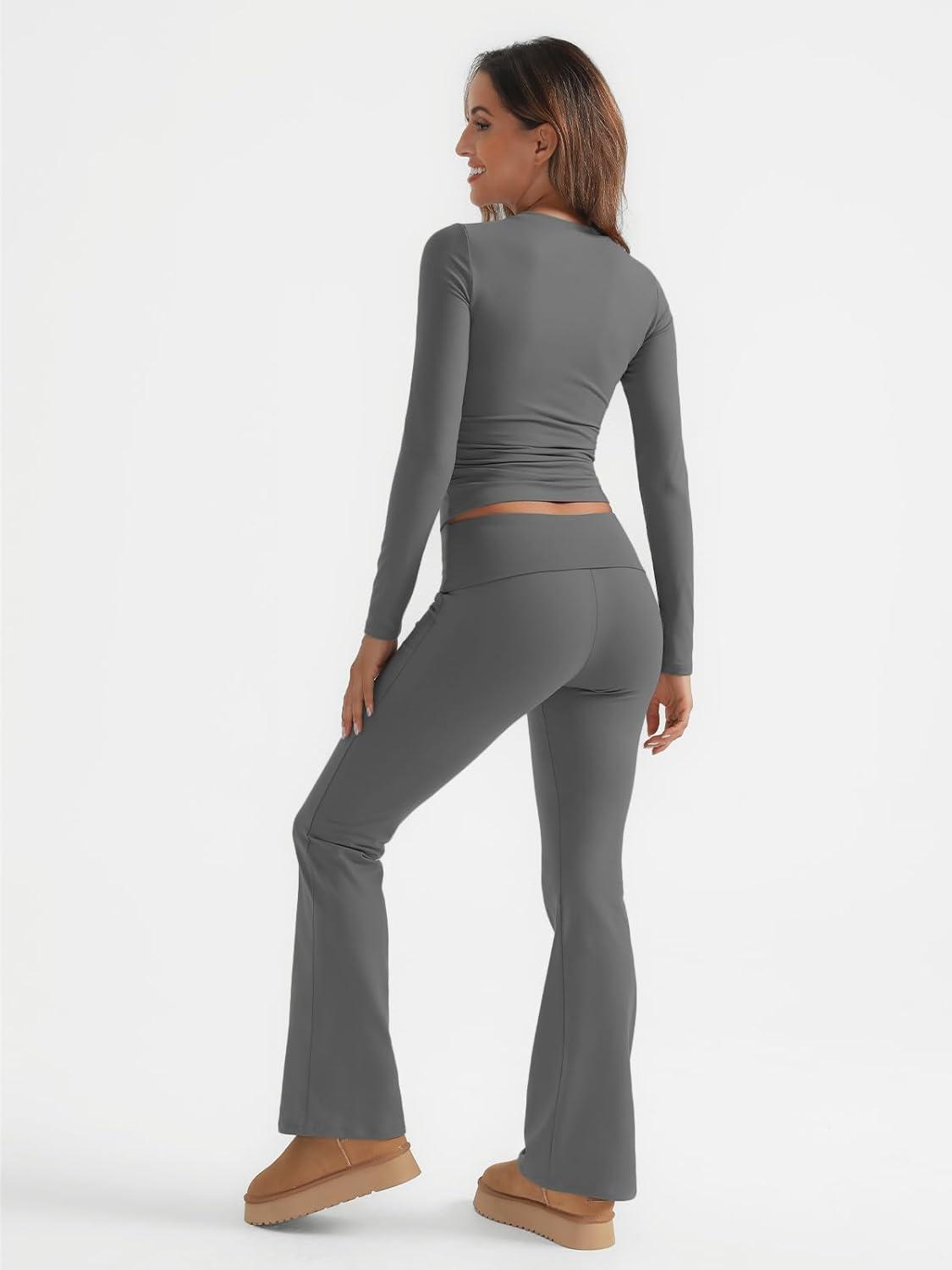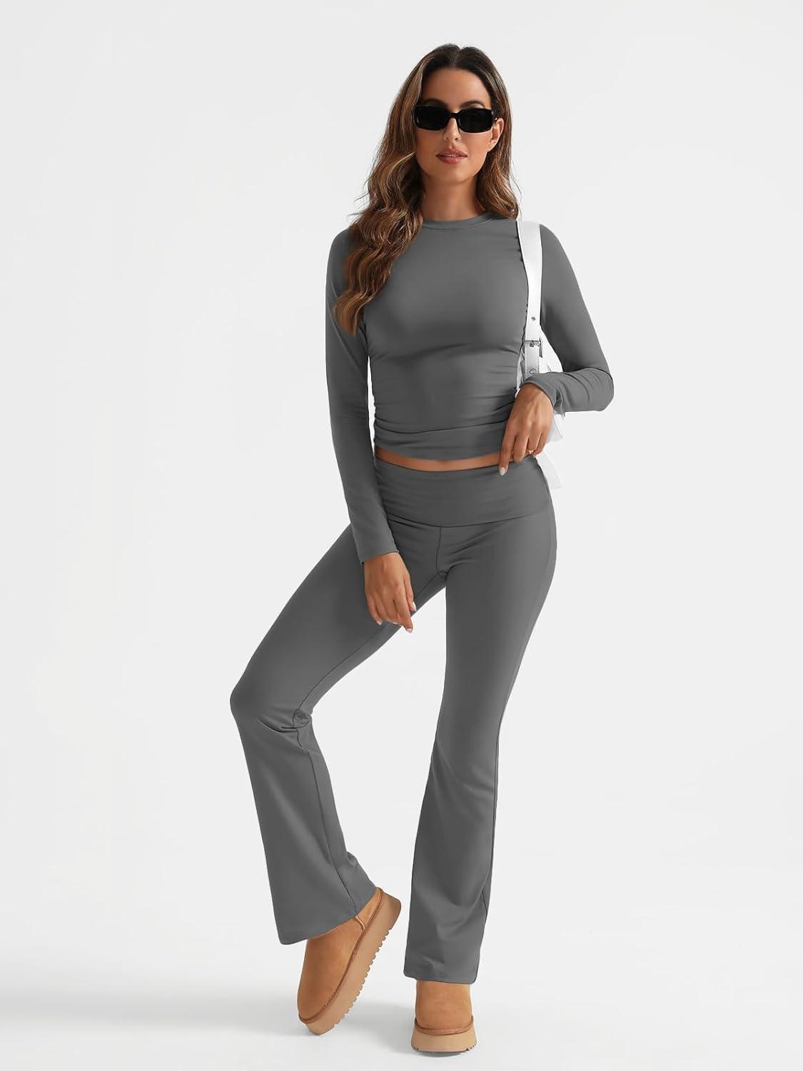 Trendy Queen Lounge Sets For Women 2 Piece Outfits Long Sleeve Shirts and Fold Over Yoga Pants Two Piece Workout Sets(Dark Grey)