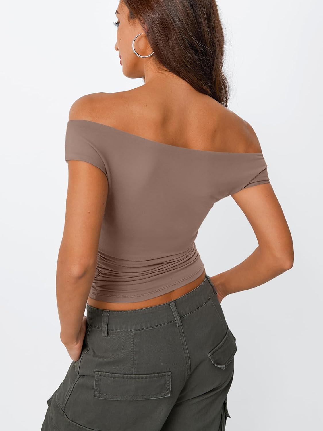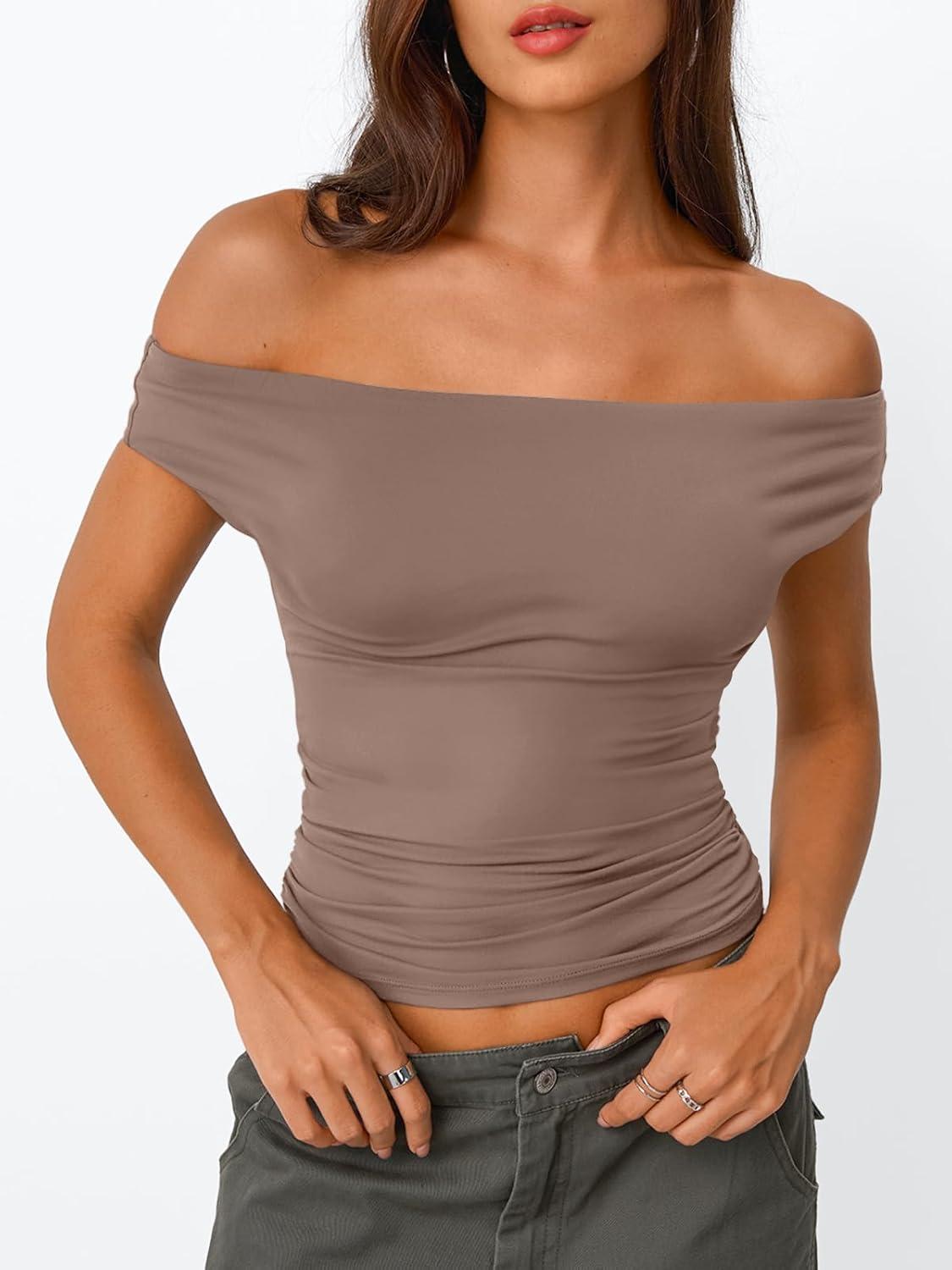 Trendy Queen Off The Shoulder Tops for Women Going Out Y2K Summer Cute Shirts Sexy 2026 Double Lined Date Club Outfits(Coffeegrey)