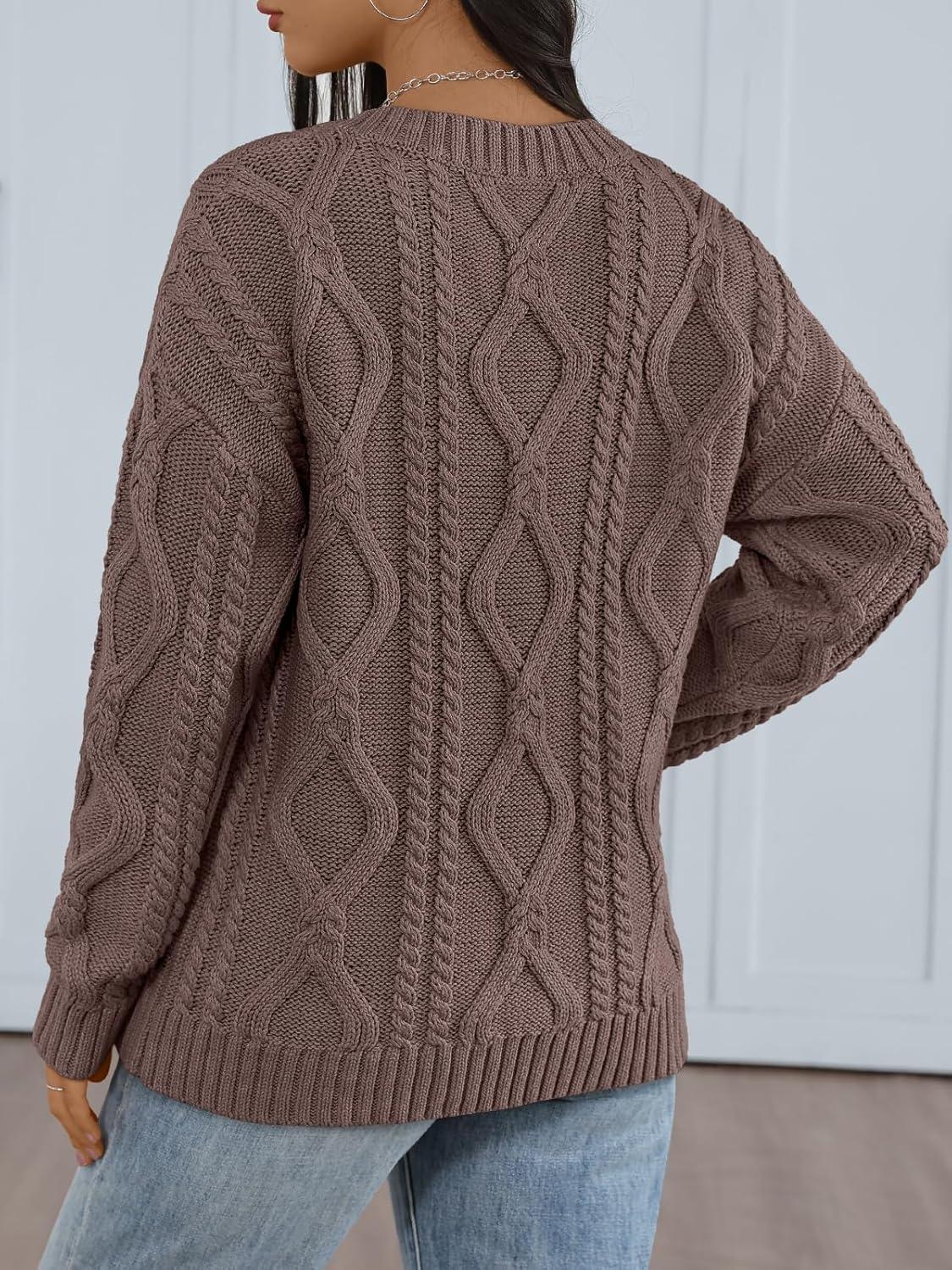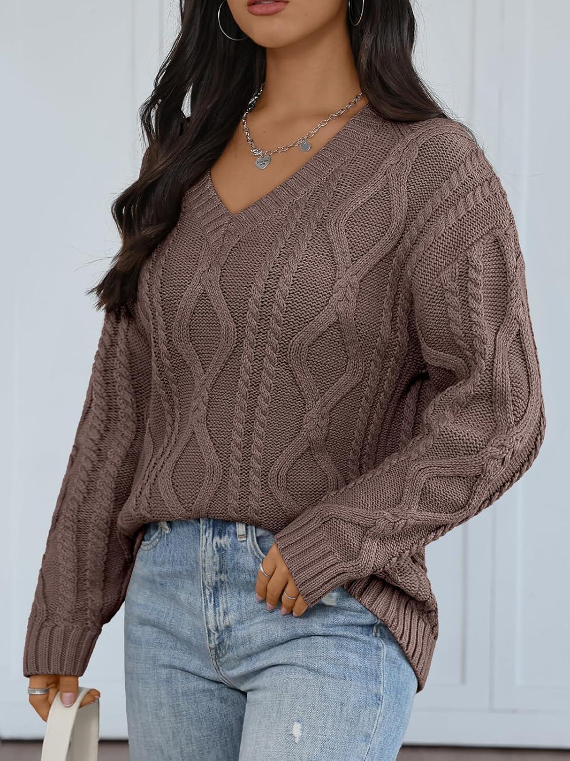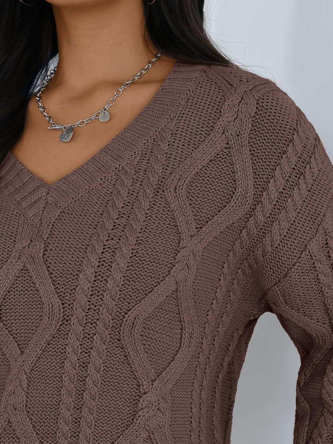 Trendy Queen Oversized Cable Knit Sweaters for Women 2025 Cozy Pullover Knit Fall Outfits V Neck Cute Winter Clothing(Brown)