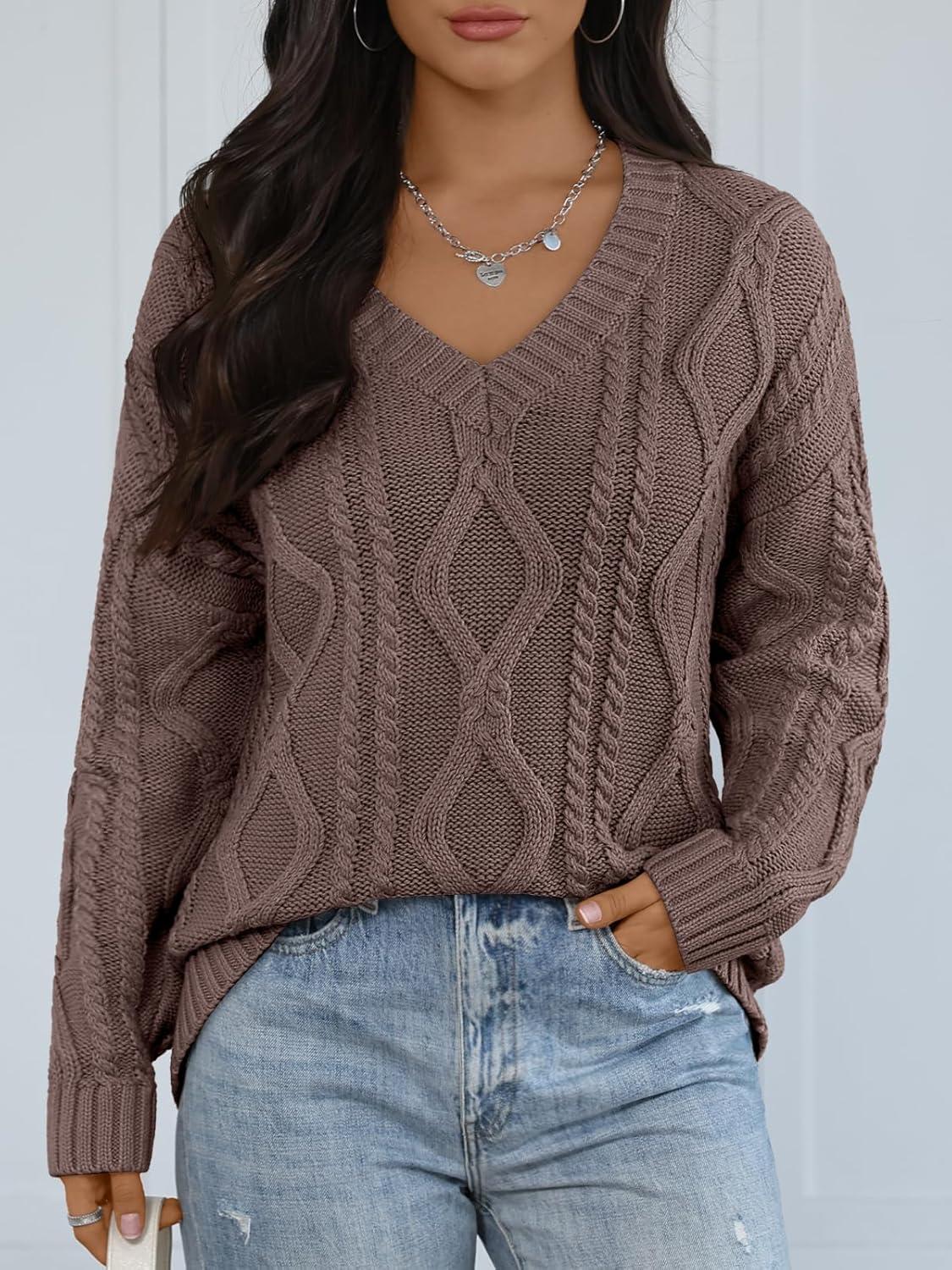 imageTrendy Queen Oversized Cable Knit Sweaters for Women 2025 Cozy Pullover Knit Fall Outfits V Neck Cute Winter ClothingBrown