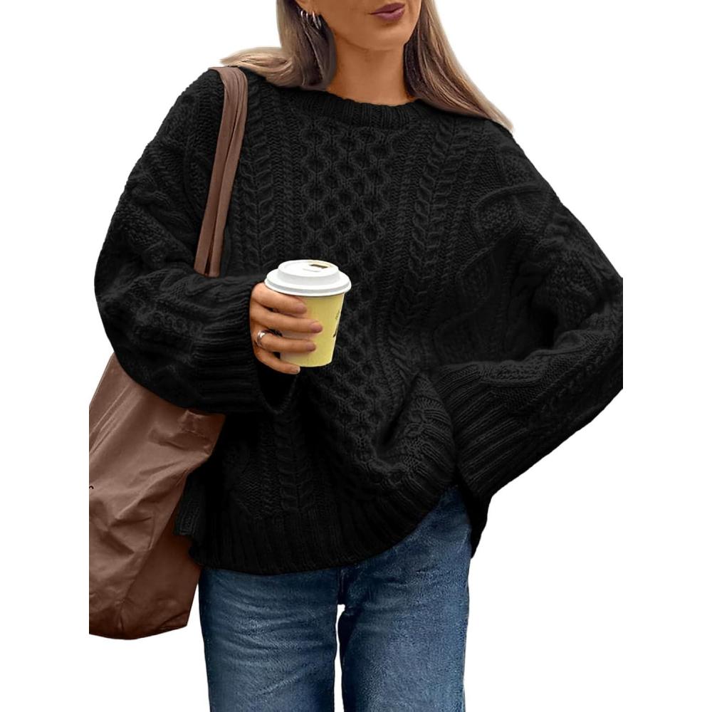 Trendy Queen Oversized Cable Knit Sweaters for Women Trendy 2025 Fall Fashion Outfits Pullover Crewneck Sweaters Tops(Black)