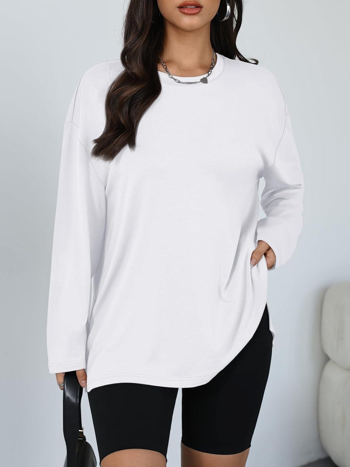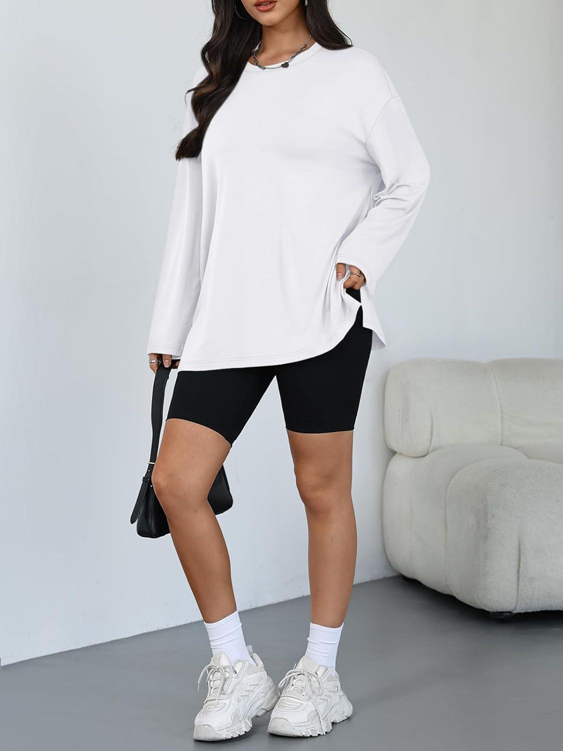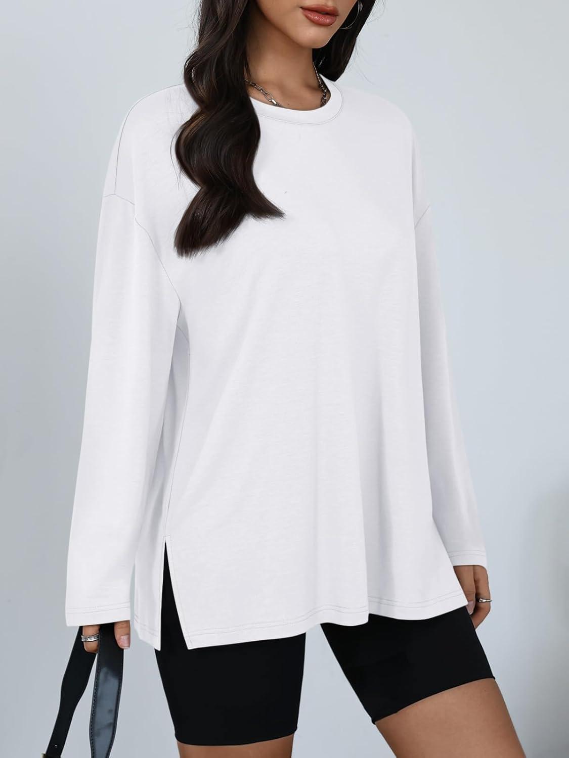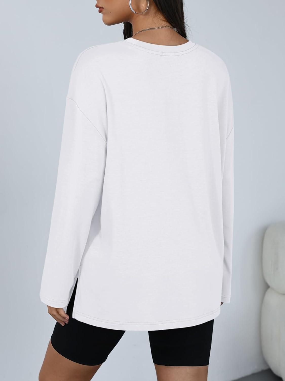 Trendy Queen Oversized Side Slit Tshirts for Women Long Sleeve Workout Tops Fall Fashion Gym Casual Tees Basic Y2K Clothes(White)