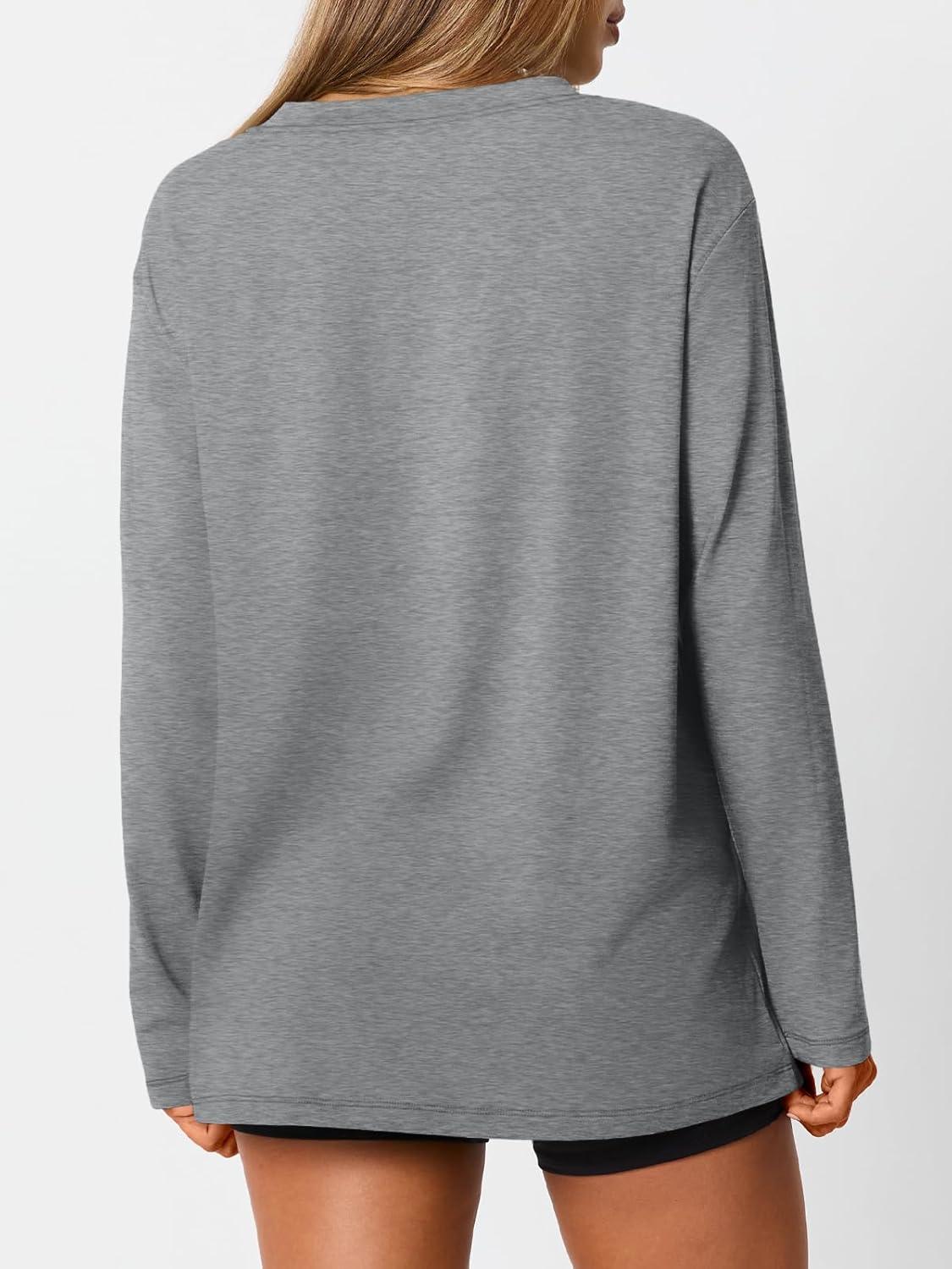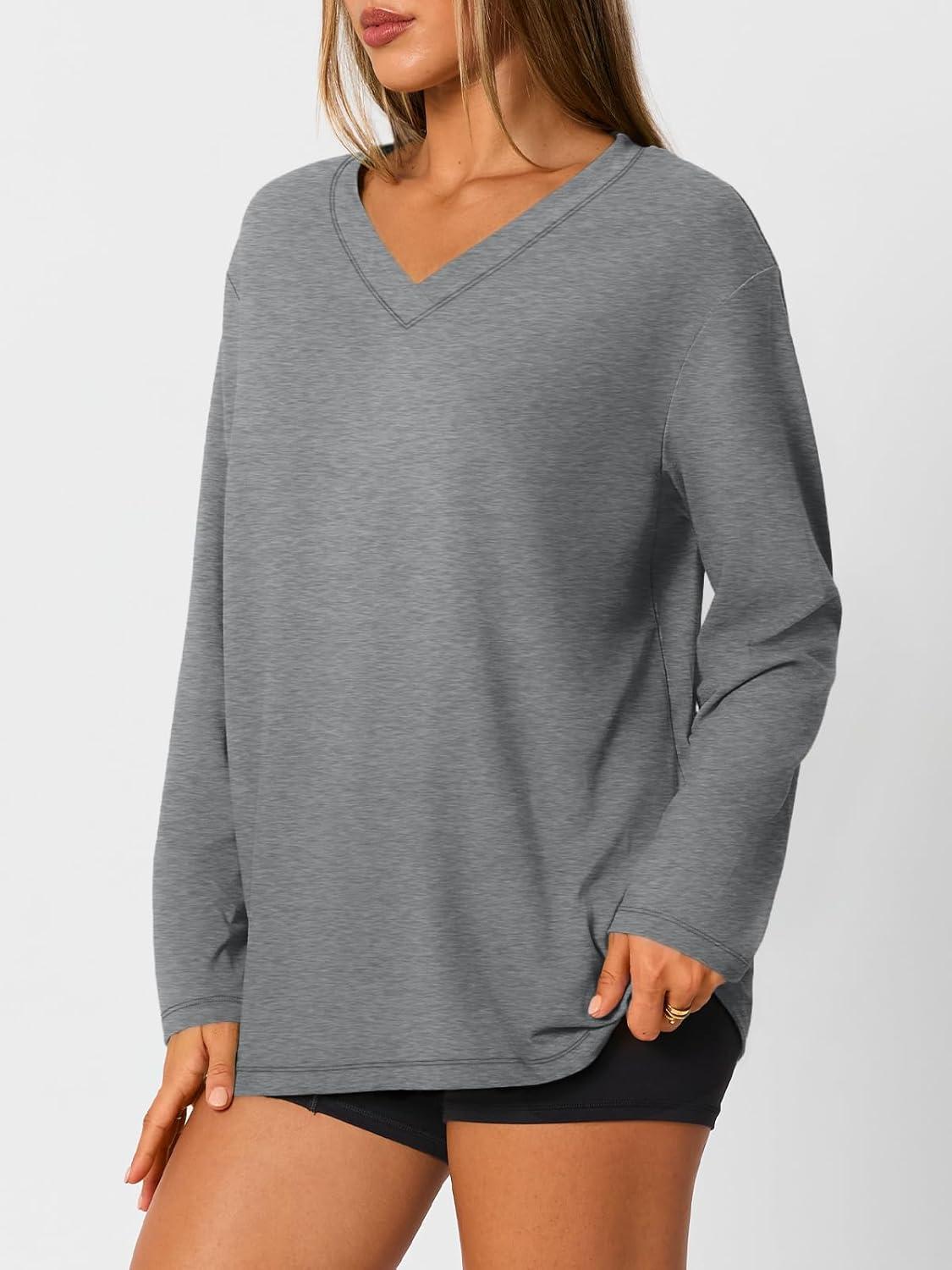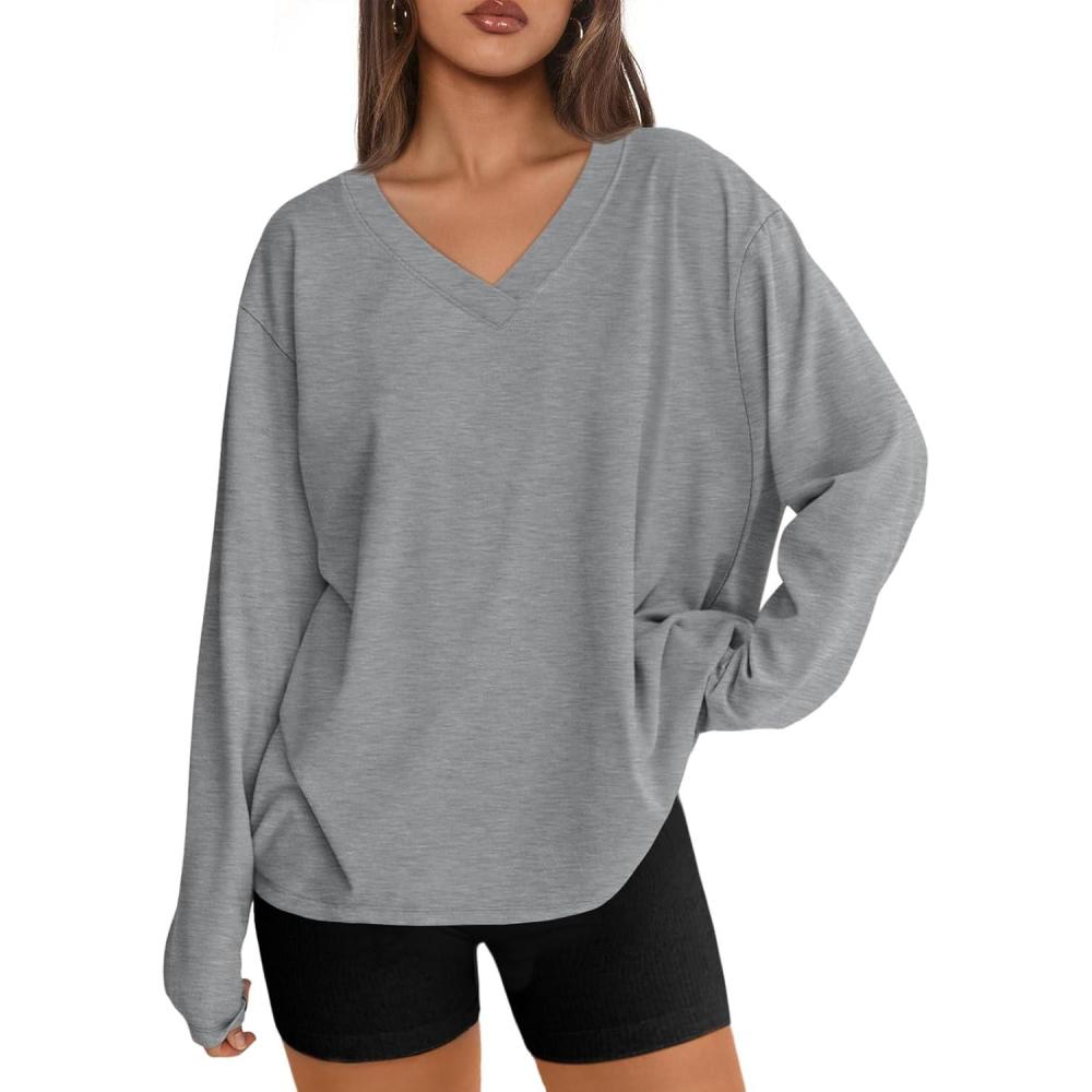 Trendy Queen Oversized Tshirts for Women Workout Plus Size Gym Tops V Neck Long Sleeve T Shirts Spring Casual Basic Tees(Light Grey)