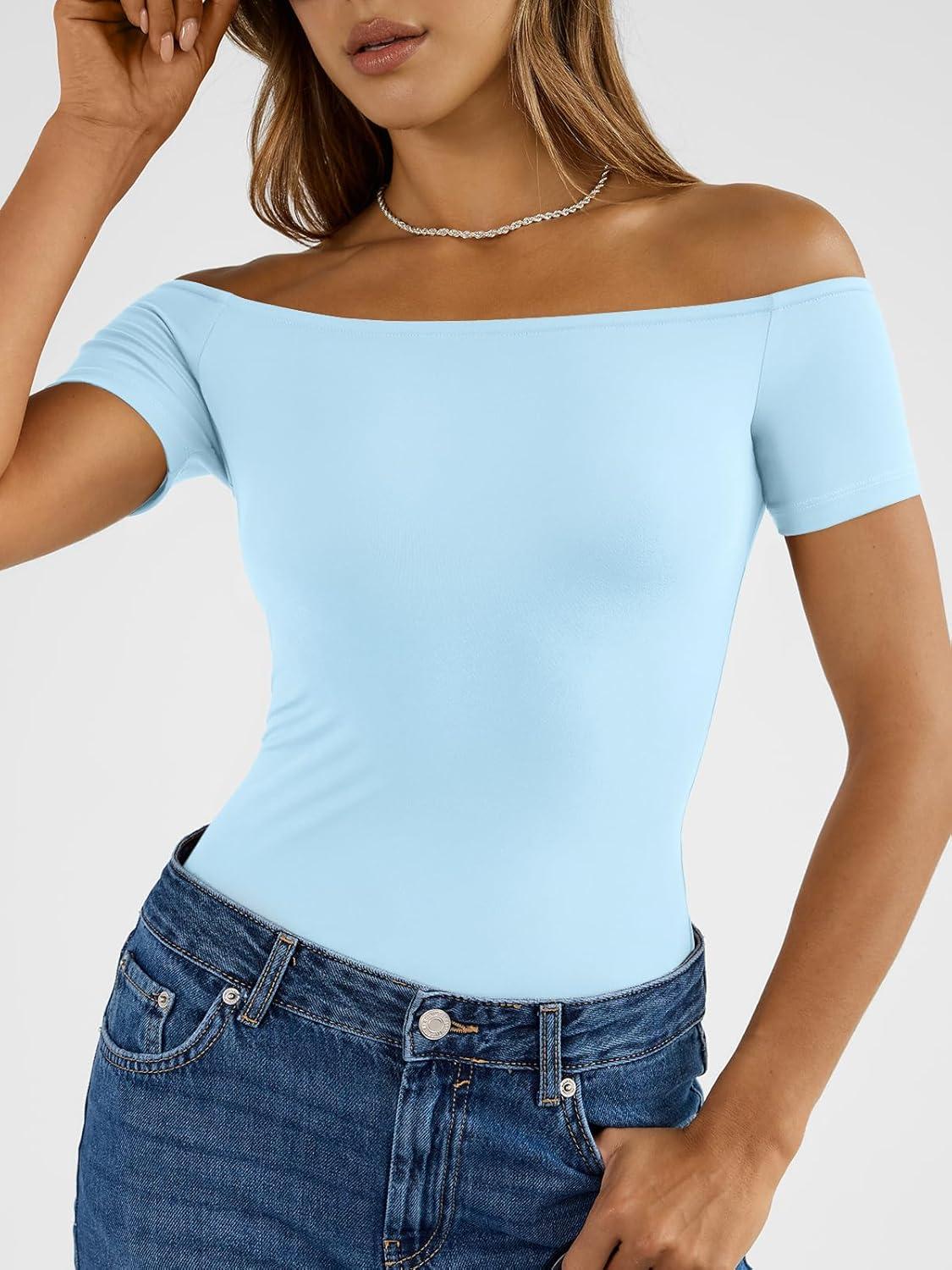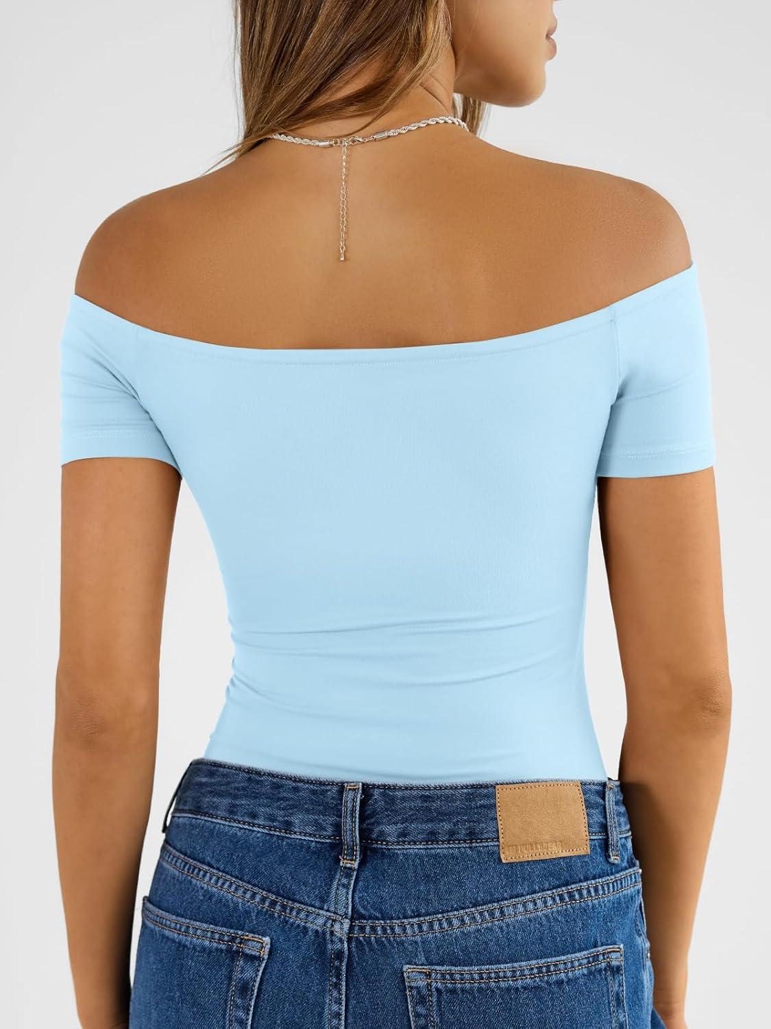 Trendy Queen Summer Off The Shoulder Tops for Women Going Out Short Sleeve Shirts Cute Y2K Sexy Basic Clothes 2026 Fashion(Baby Blue)