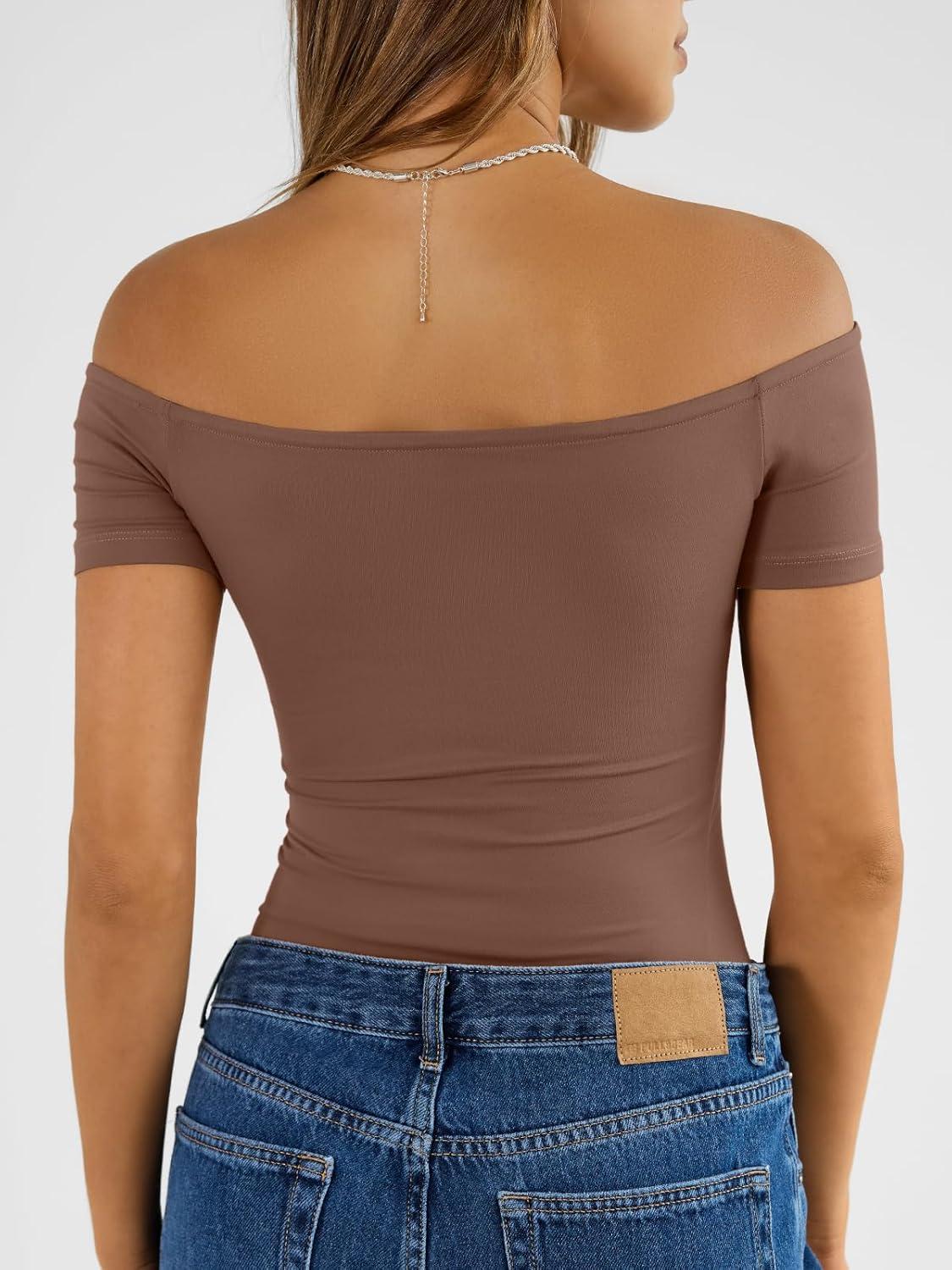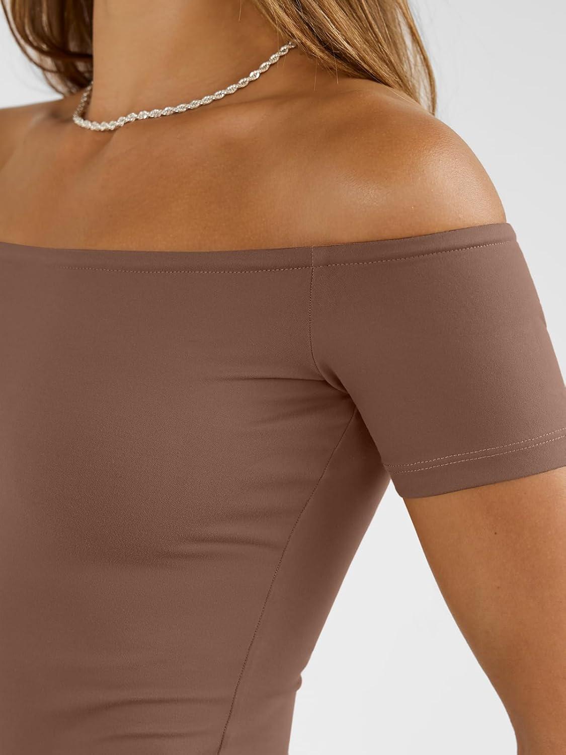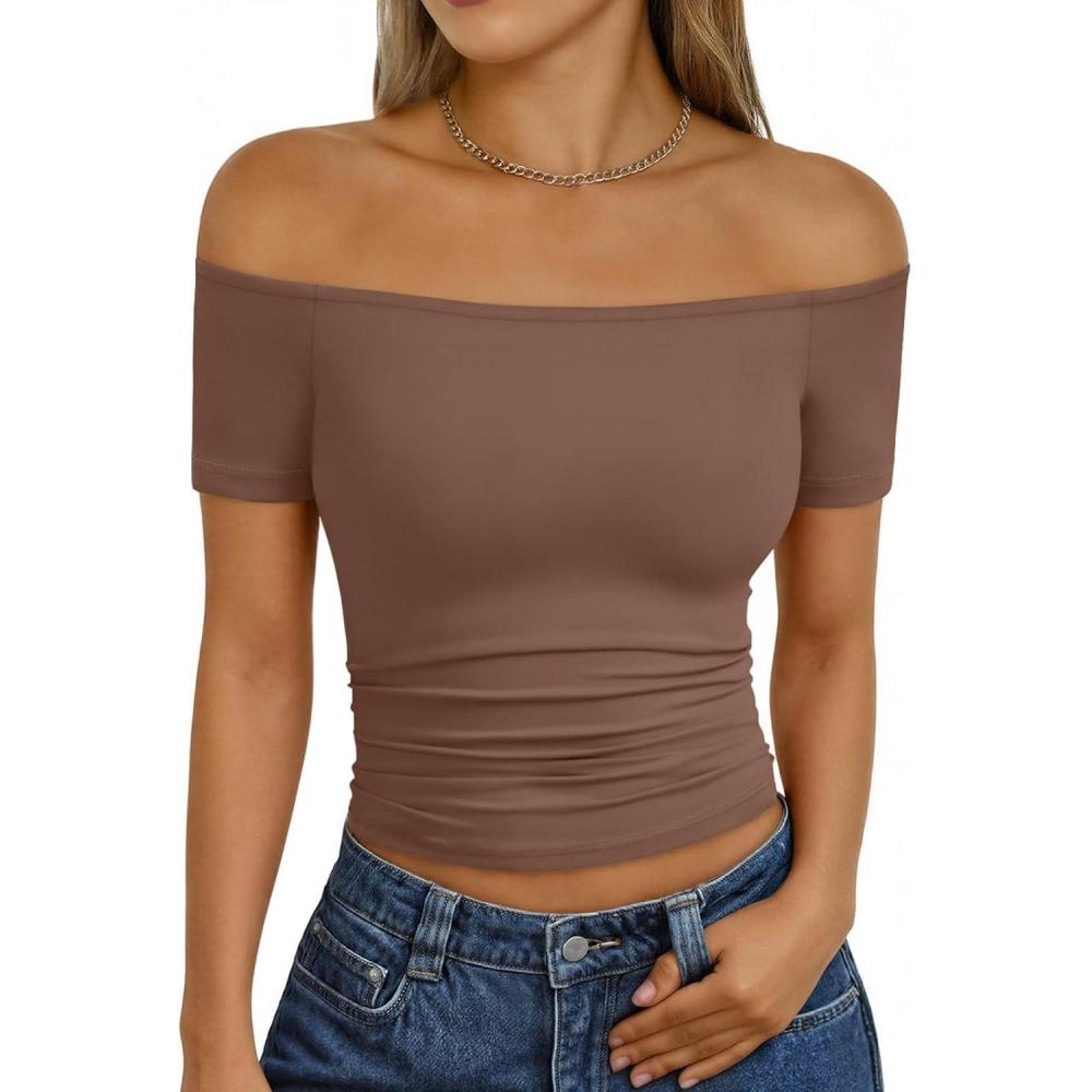 Trendy Queen Summer Off The Shoulder Tops for Women Going Out Short Sleeve Shirts Cute Y2K Sexy Basic Clothes 2026 Fashion(Chocolate)