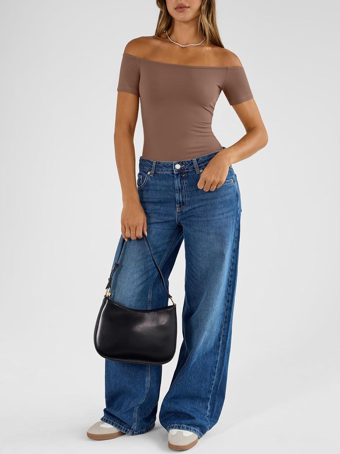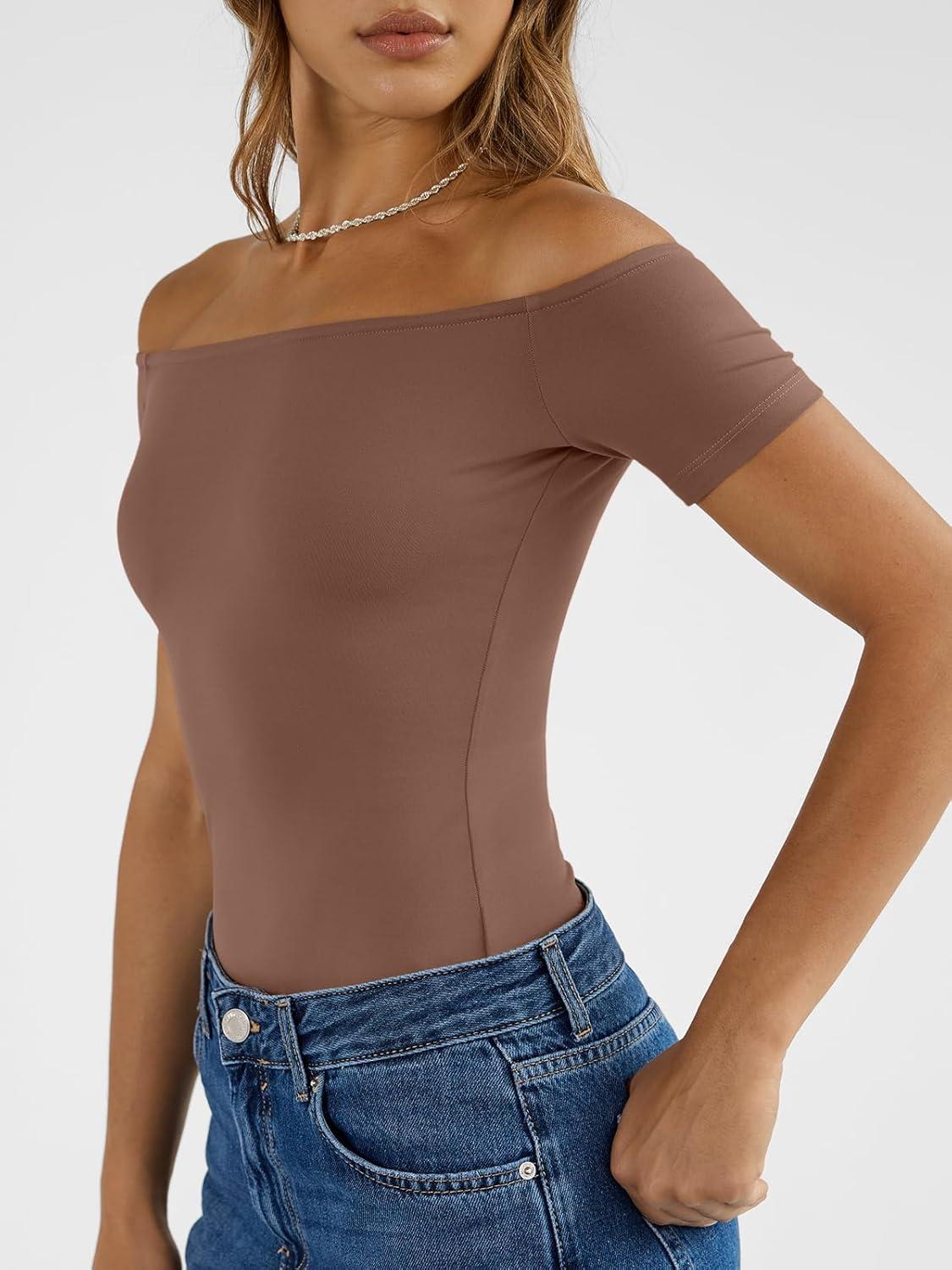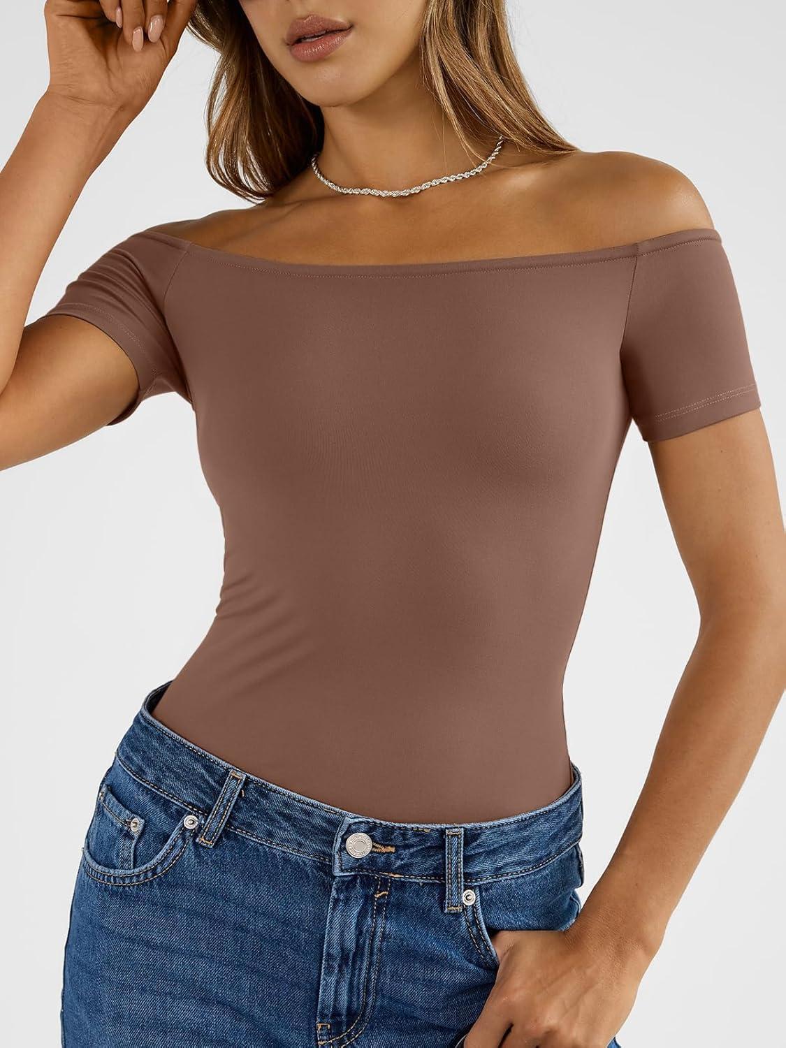 Trendy Queen Summer Off The Shoulder Tops for Women Going Out Short Sleeve Shirts Cute Y2K Sexy Basic Clothes 2026 Fashion(Chocolate)