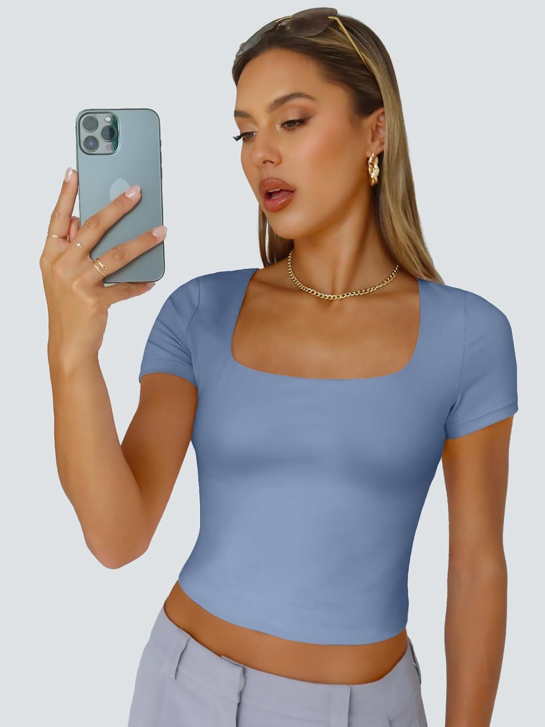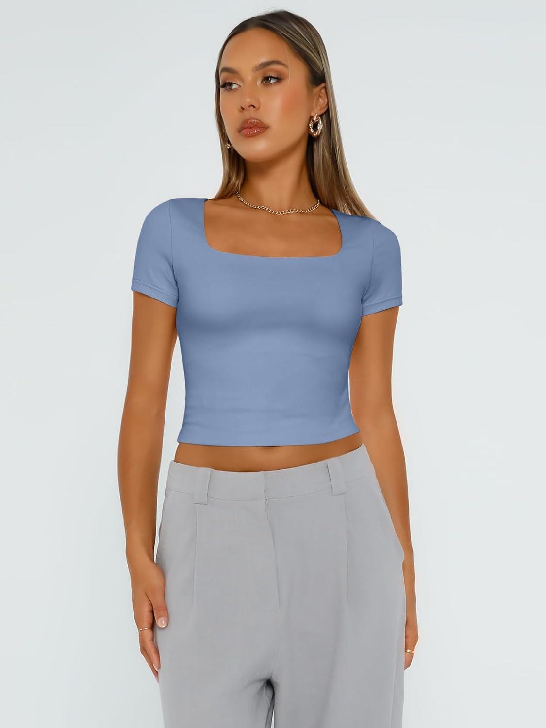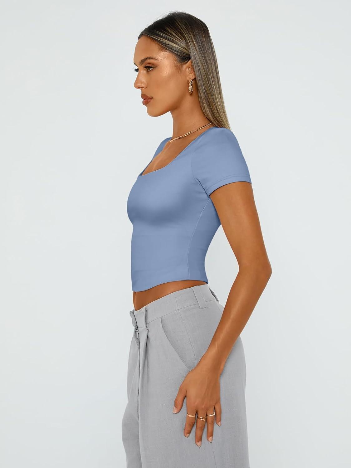 Trendy Queen Tshirts Shirts for Women Double Lined Going Out Crop Tops 2025 Spring Summer Workout Y2k Clothes Beach Fashion(Blue)