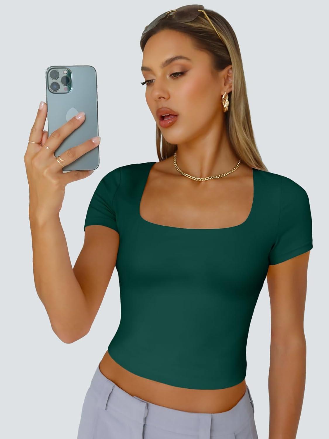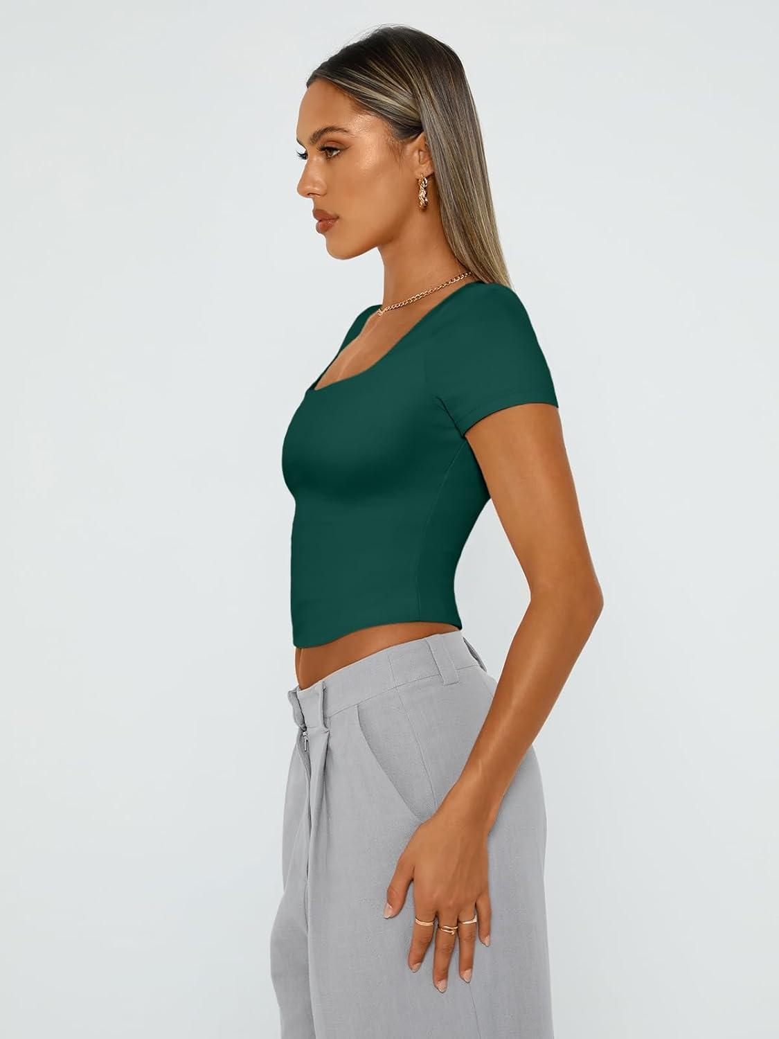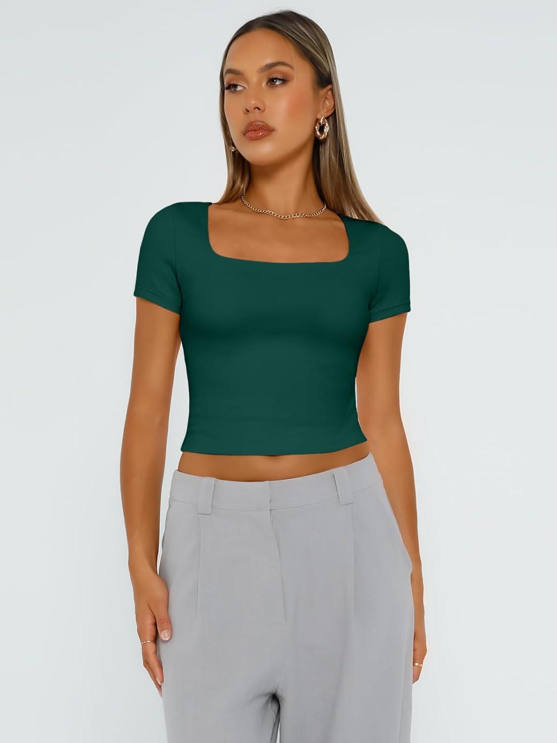 Trendy Queen Tshirts Shirts for Women Double Lined Going Out Crop Tops 2025 Spring Summer Workout Y2k Clothes Beach Fashion(Darkgreen)