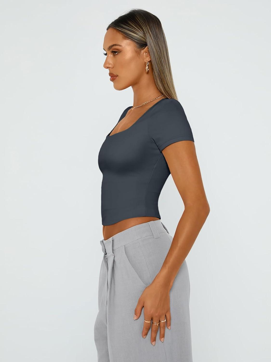 Trendy Queen Tshirts Shirts for Women Double Lined Going Out Crop Tops 2025 Spring Summer Workout Y2k Clothes Beach Fashion(Darkgrey)