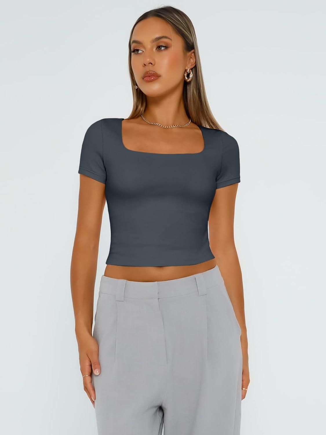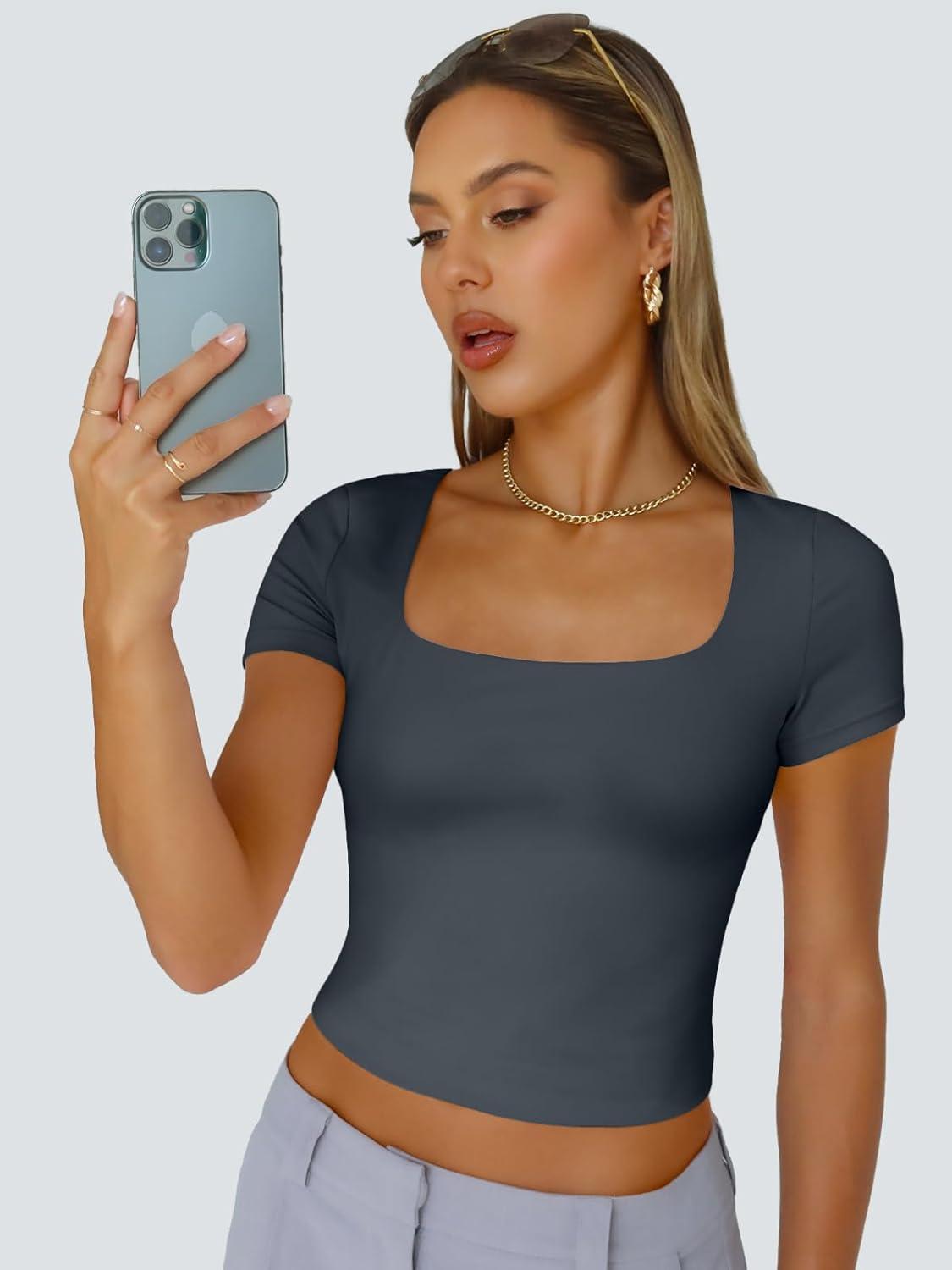 Don’t miss out on our limited-time offer: buy Trendy Queen Tshirts Shirts for Women Double Lined Going Out Crop Tops 2025 Spring Summer Workout Y2k Clothes Beach Fashion(Darkgrey), get a free {accessory}!