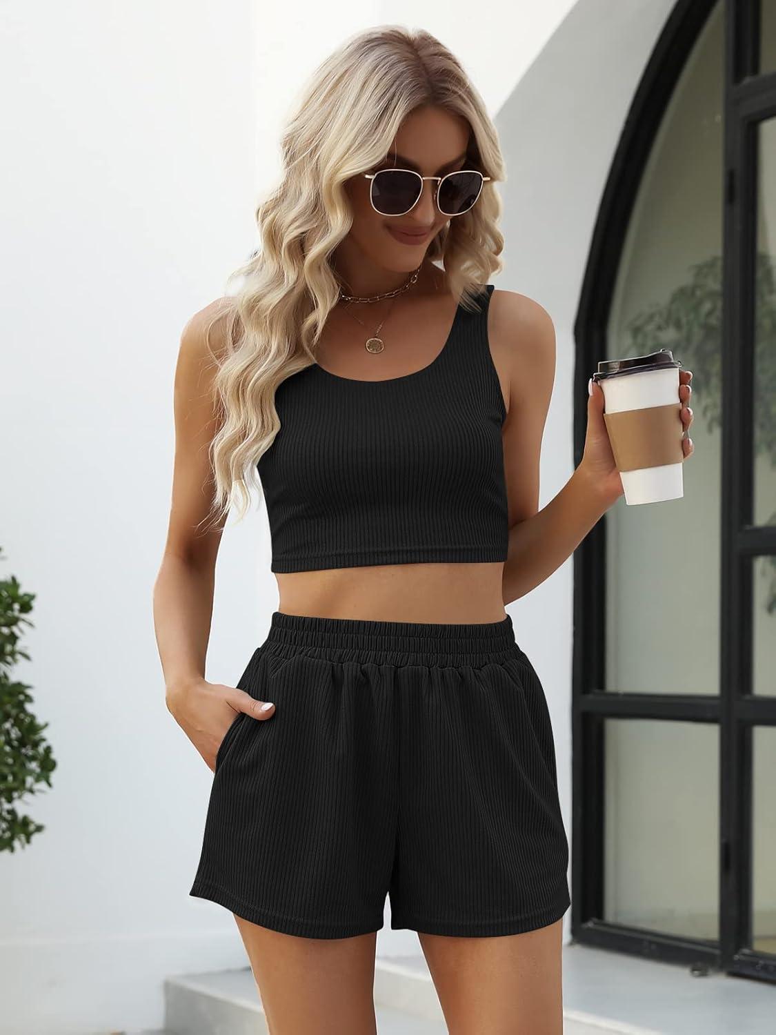 Get more for your money with our exclusive bundle deals on Trendy Queen Two Piece Summer Outfits 2 Piece Sets 2025 Sleeveless Matching Lounge Crop Top High Waisted Short(Black) and accessories.