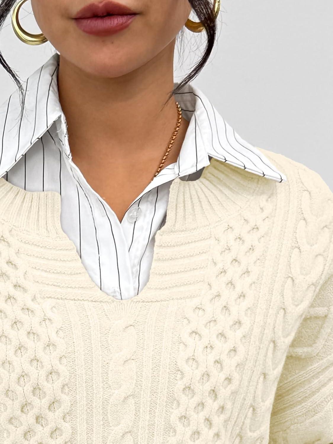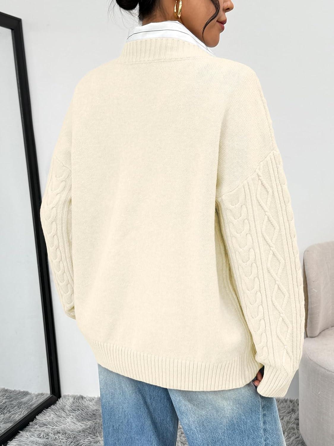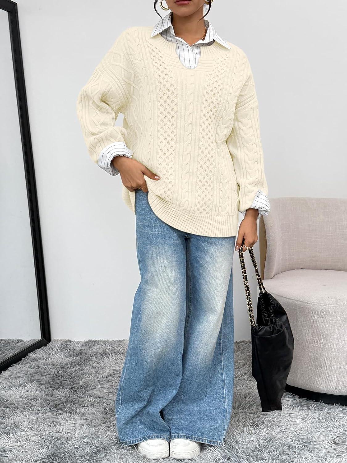 Trendy Queen V Neck Oversized Cable Knit Sweaters for Women Trendy 2025 Fall Fashion Outfits Clothes Winter Clothing(Beige)