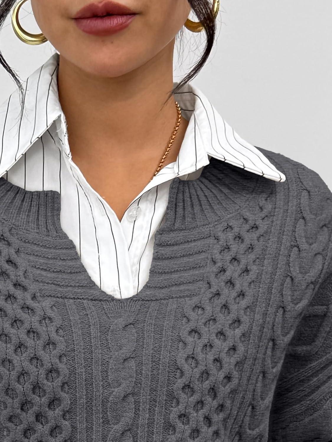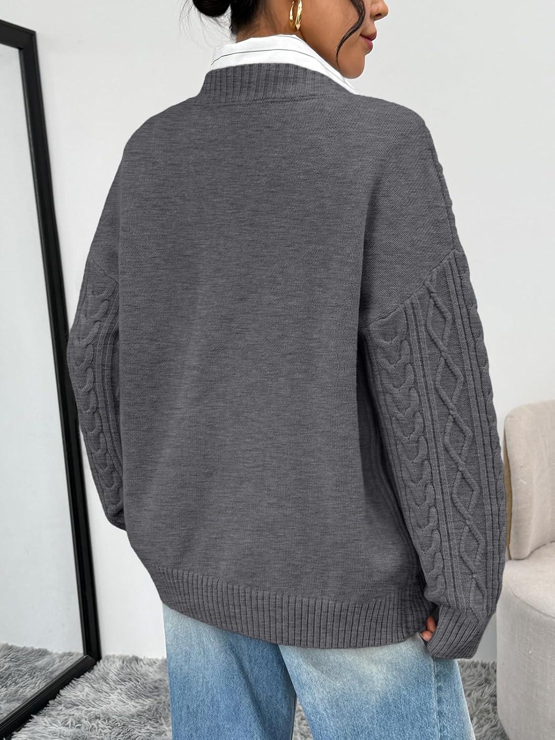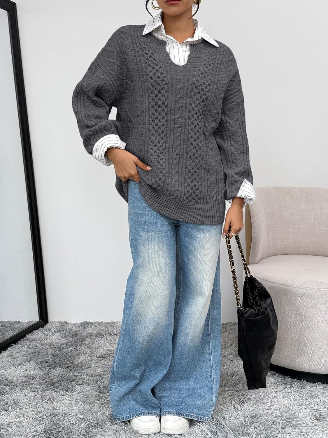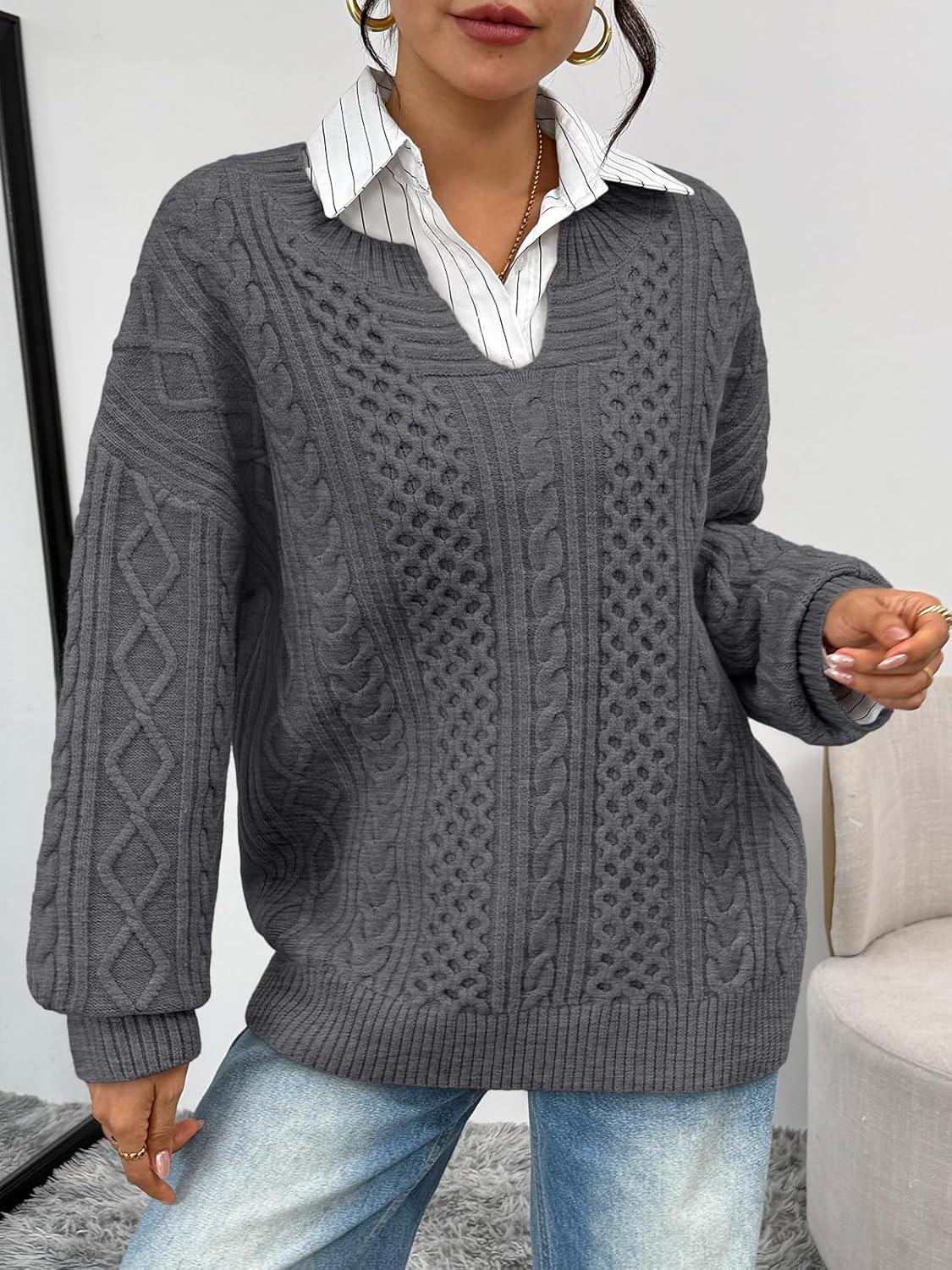 Trendy Queen V Neck Oversized Cable Knit Sweaters for Women Trendy 2025 Fall Fashion Outfits Clothes Winter Clothing(Darkgrey)