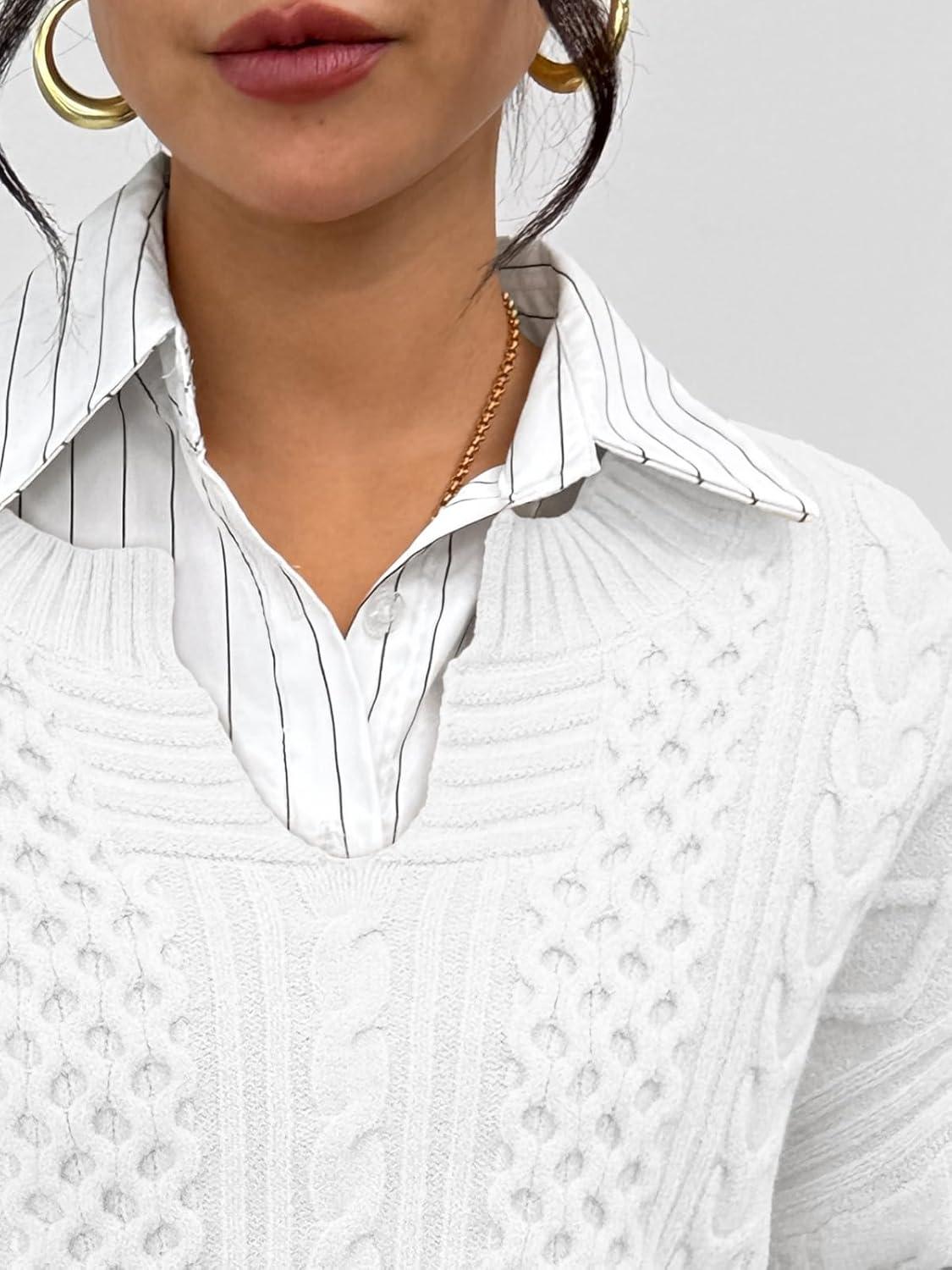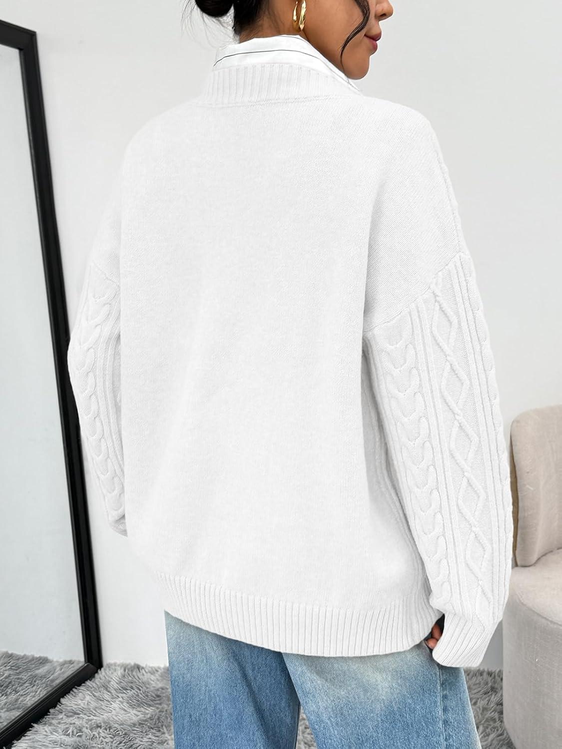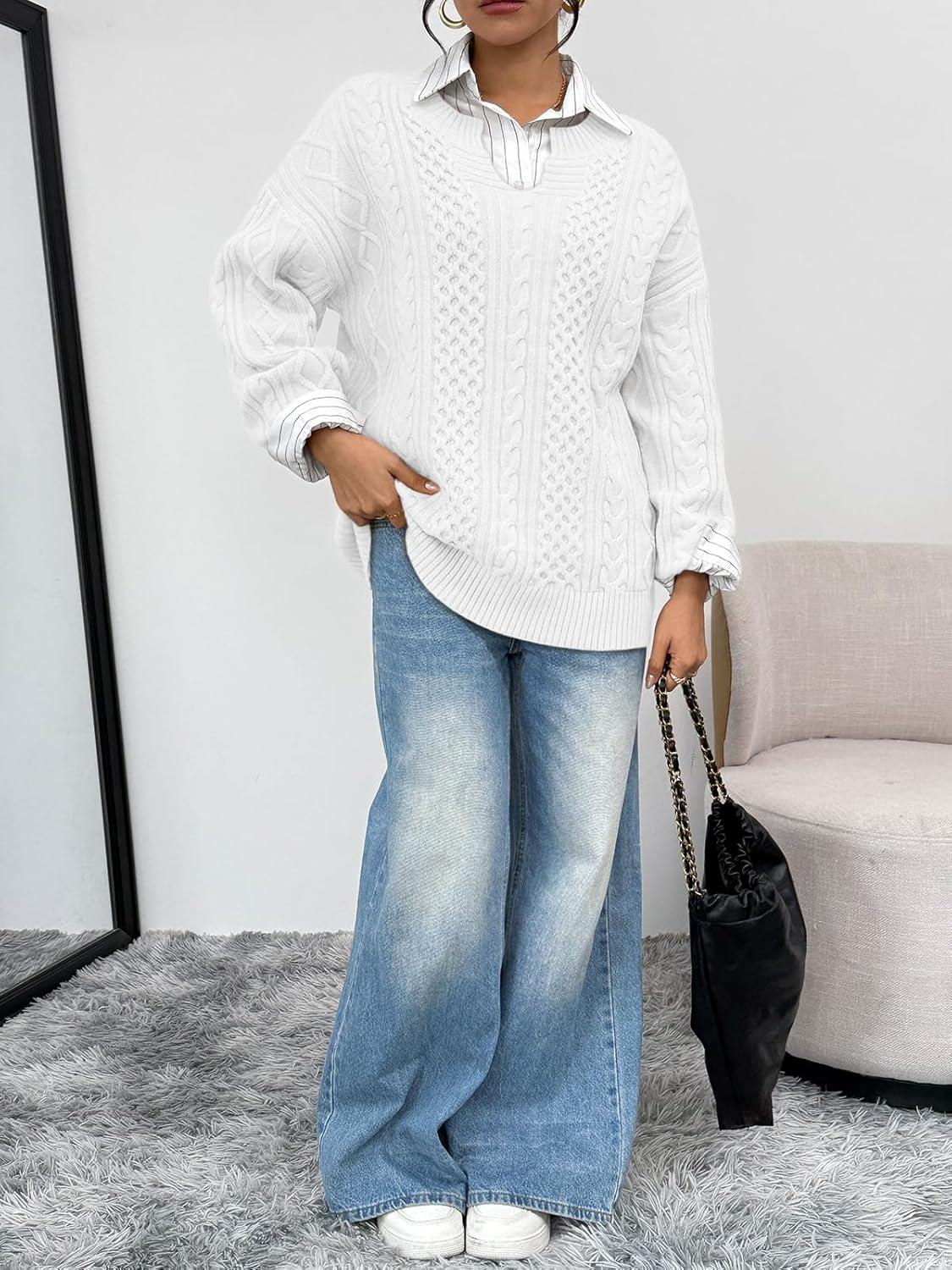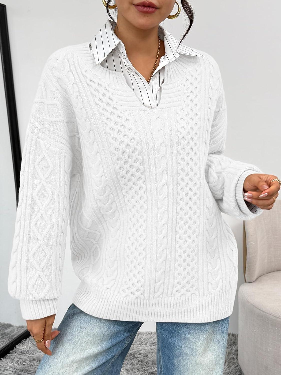 Trendy Queen V Neck Oversized Cable Knit Sweaters for Women Trendy 2025 Fall Fashion Outfits Clothes Winter Clothing(White)