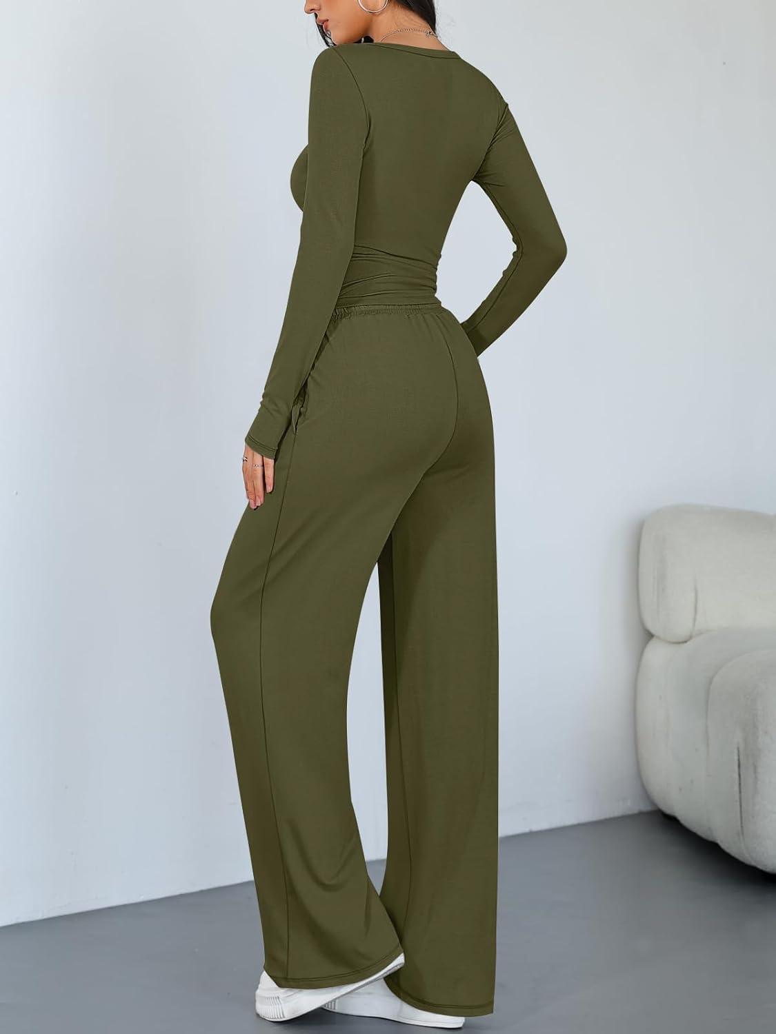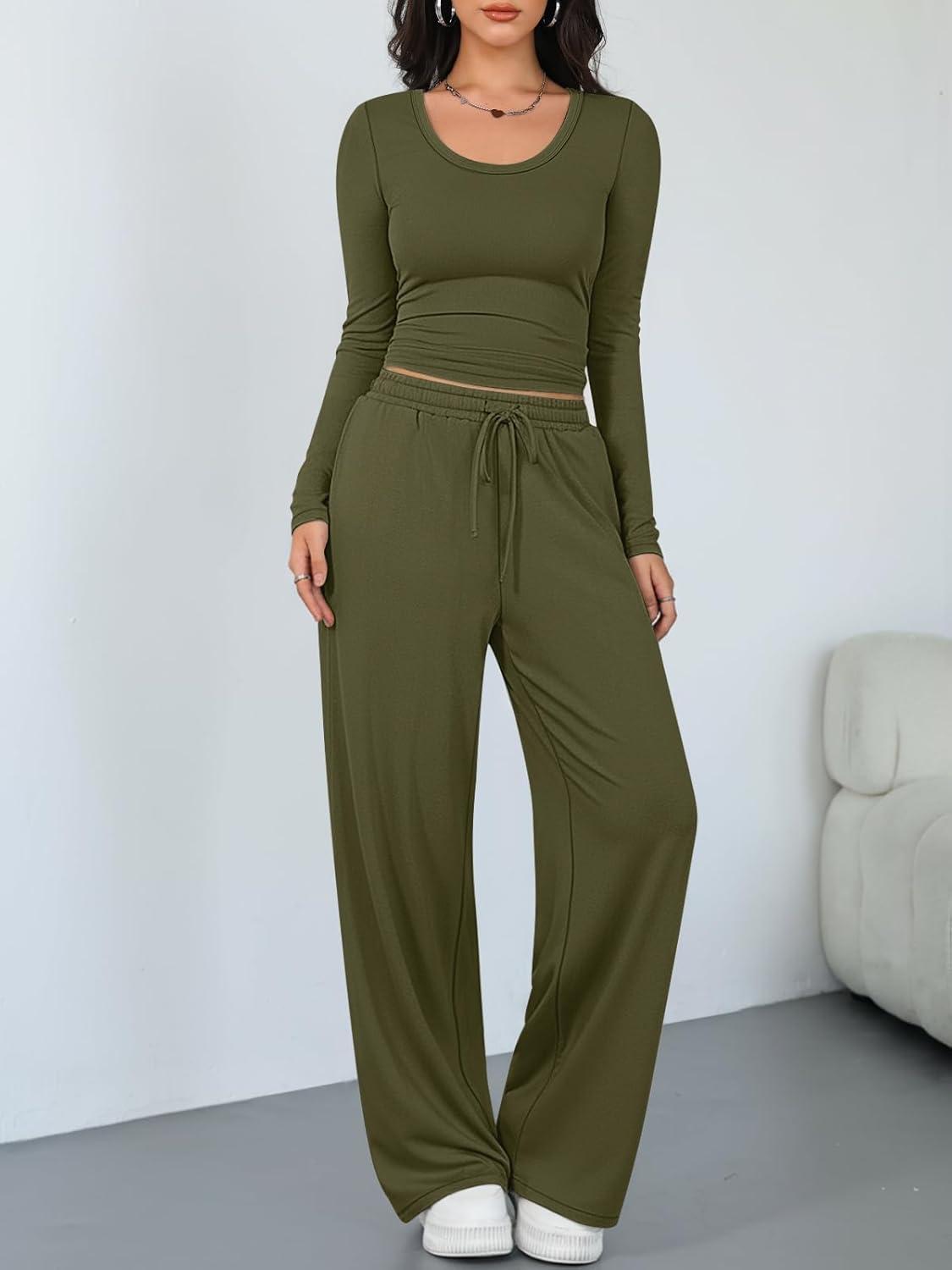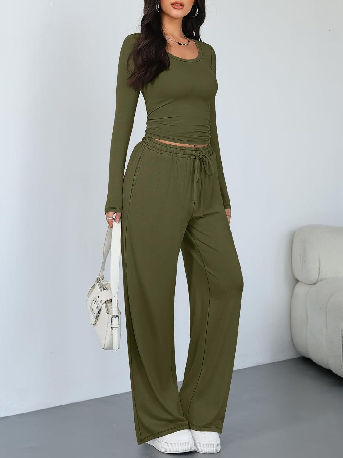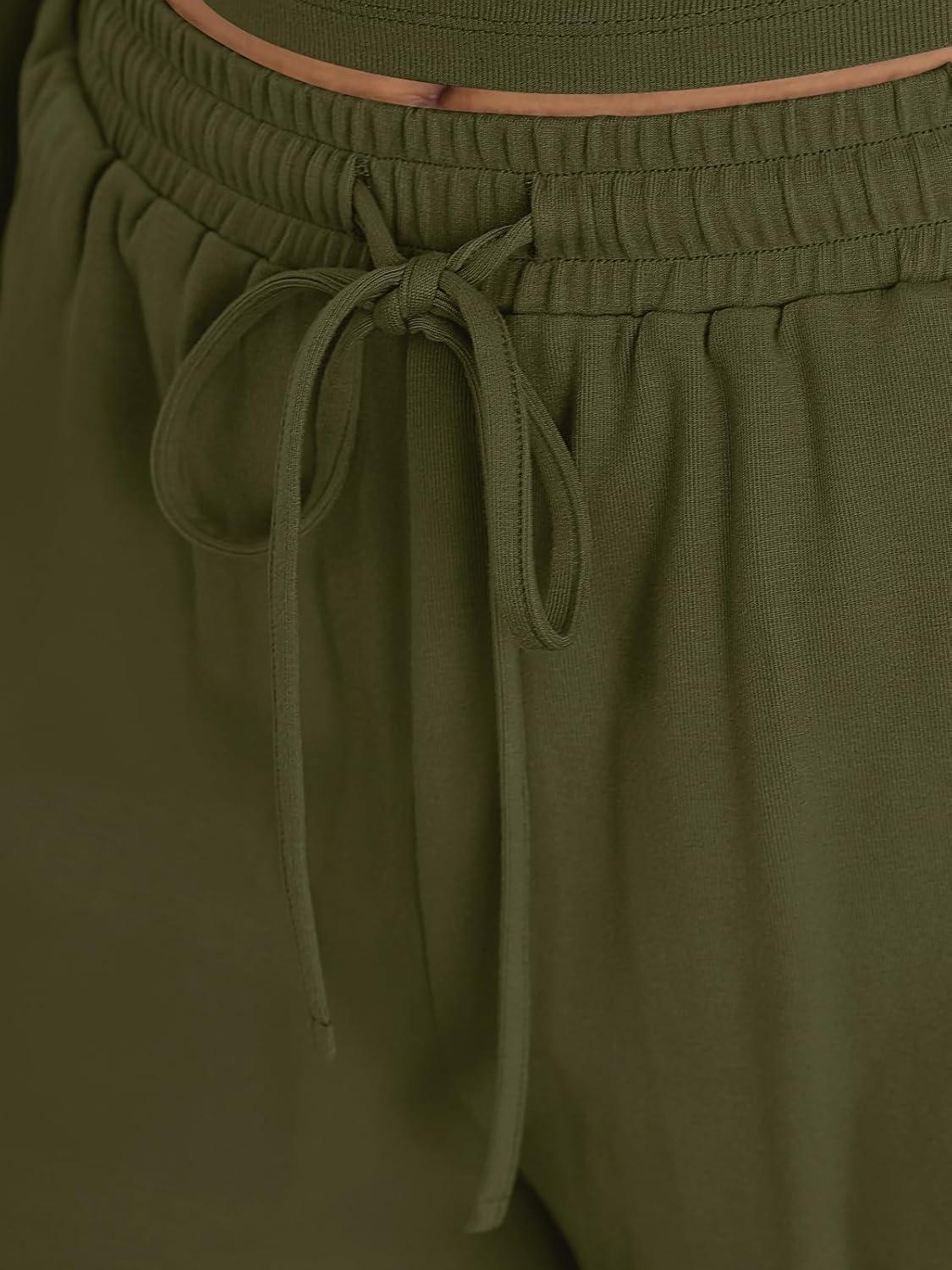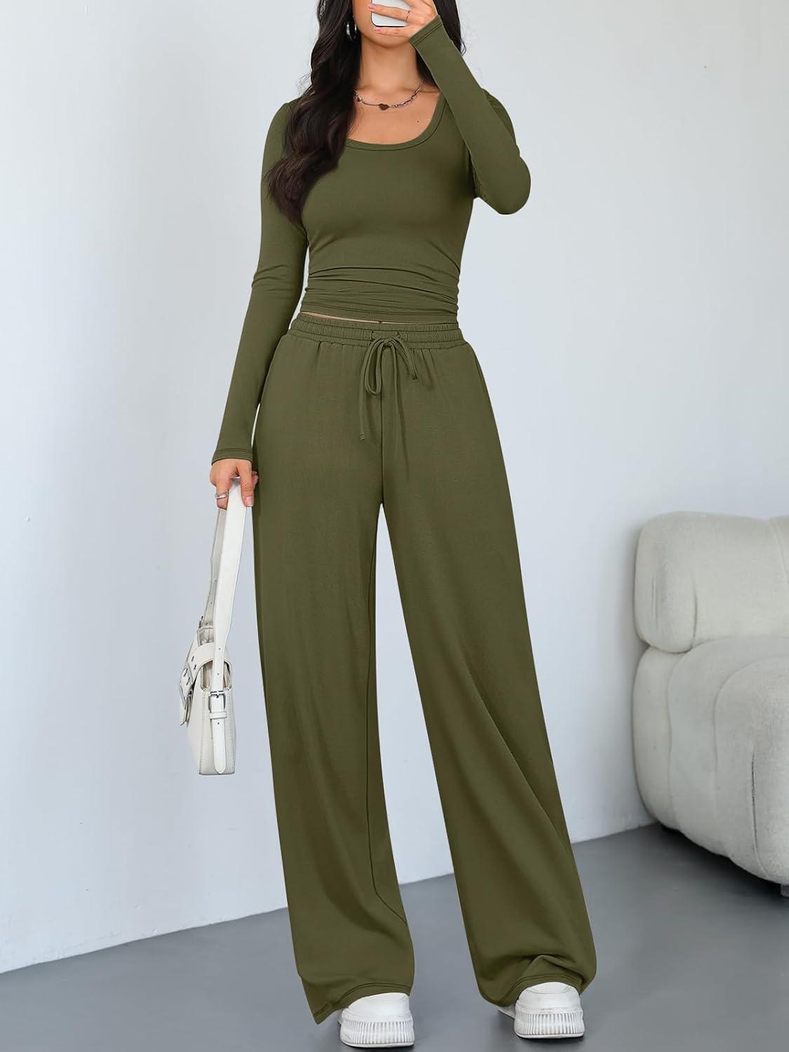 Trendy Queen Women 2 Piece Matching Lounge Sets Clothing Wide Leg Pants 2026 Y2K Sweatsuits Spring Travel Airport Outfit(Army)