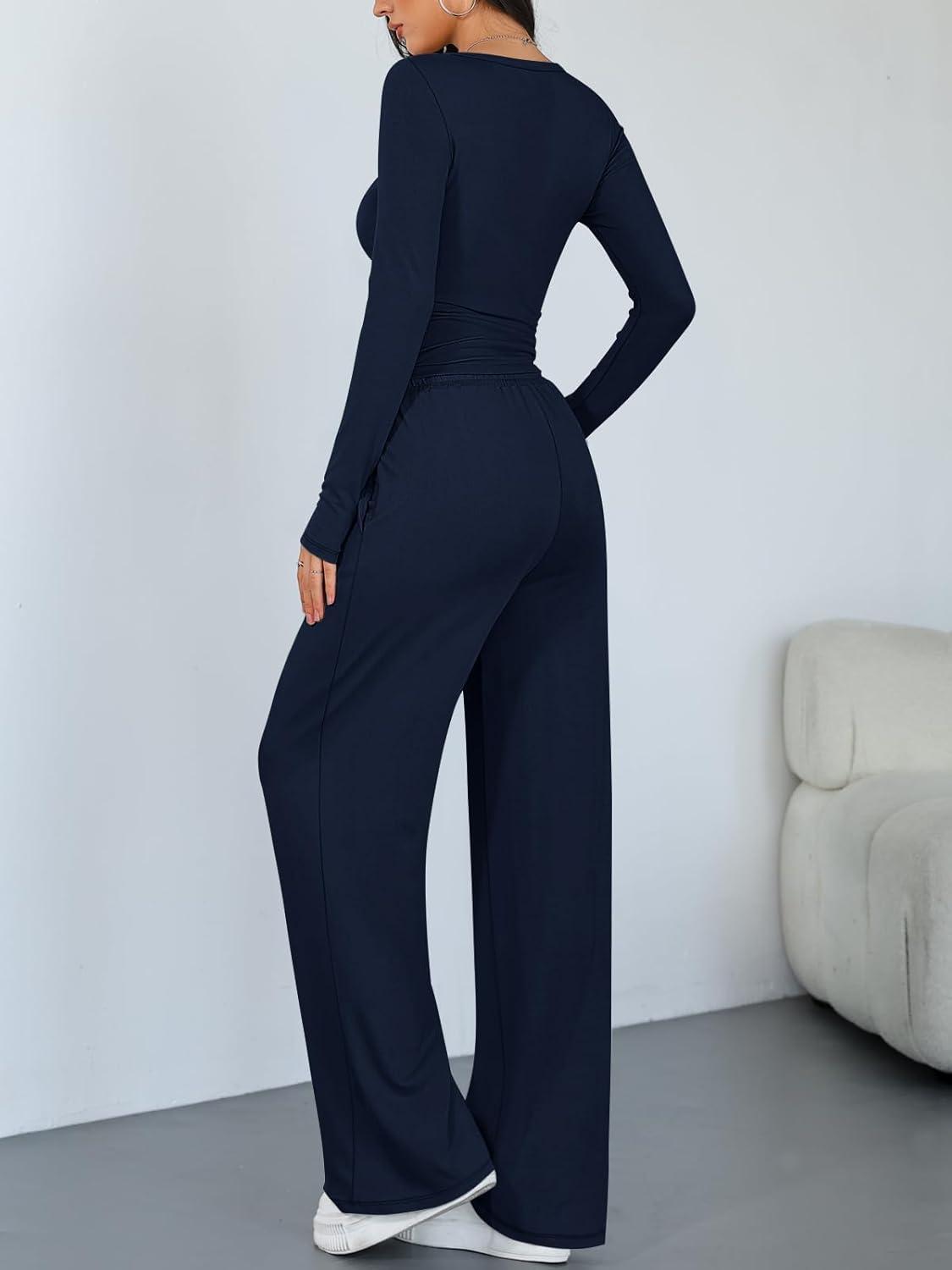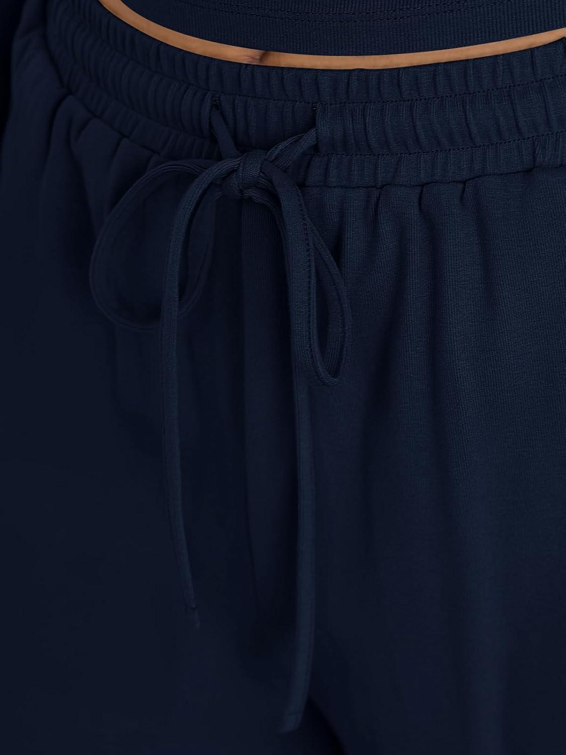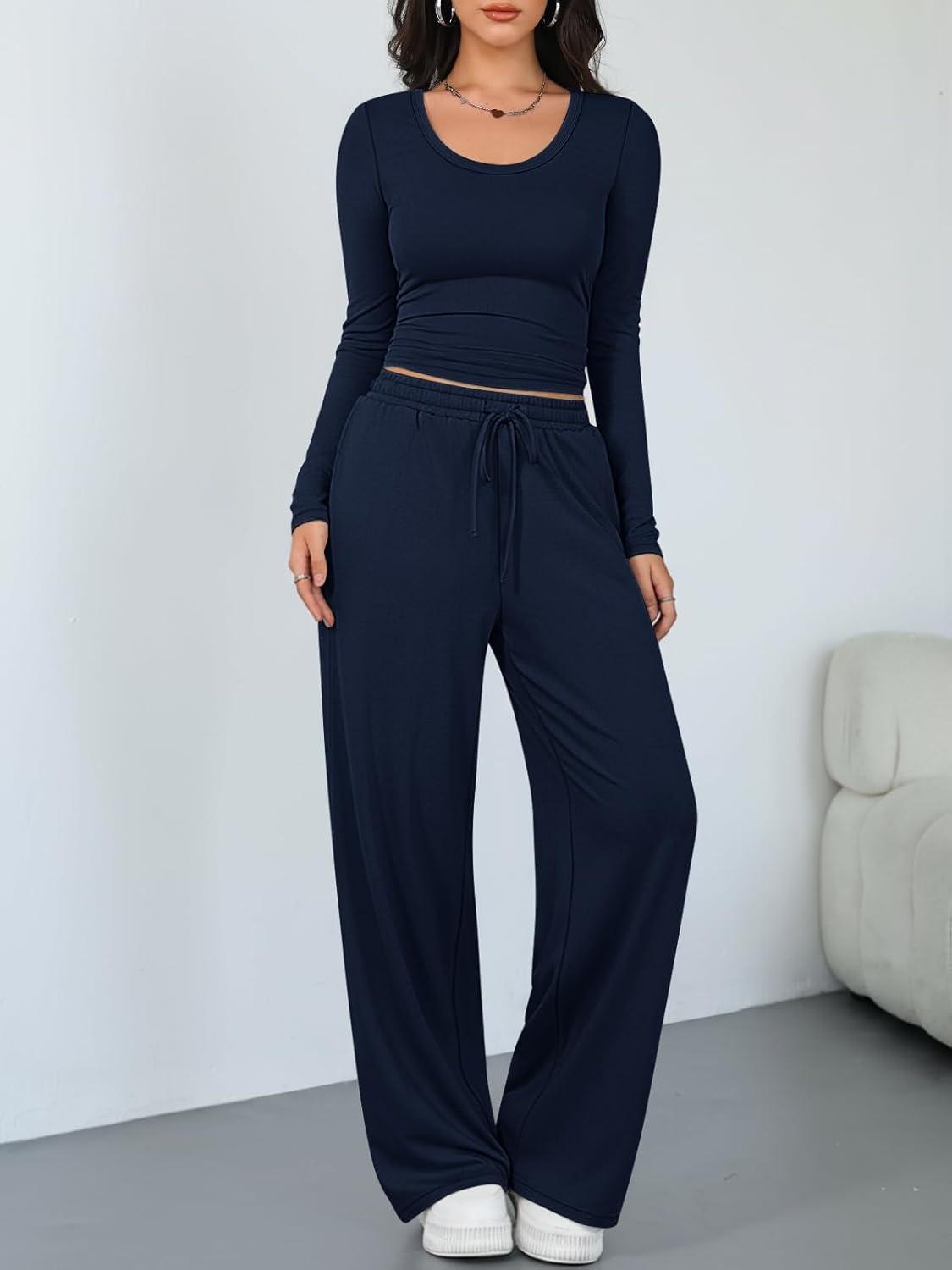 Trendy Queen Women 2 Piece Matching Lounge Sets Clothing Wide Leg Pants 2026 Y2K Sweatsuits Spring Travel Airport Outfit(Navy)