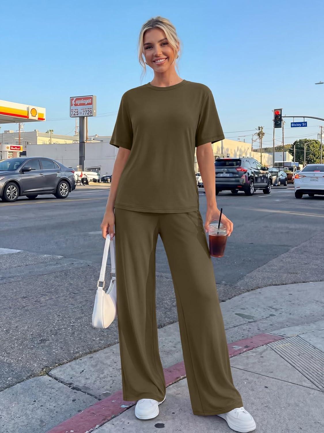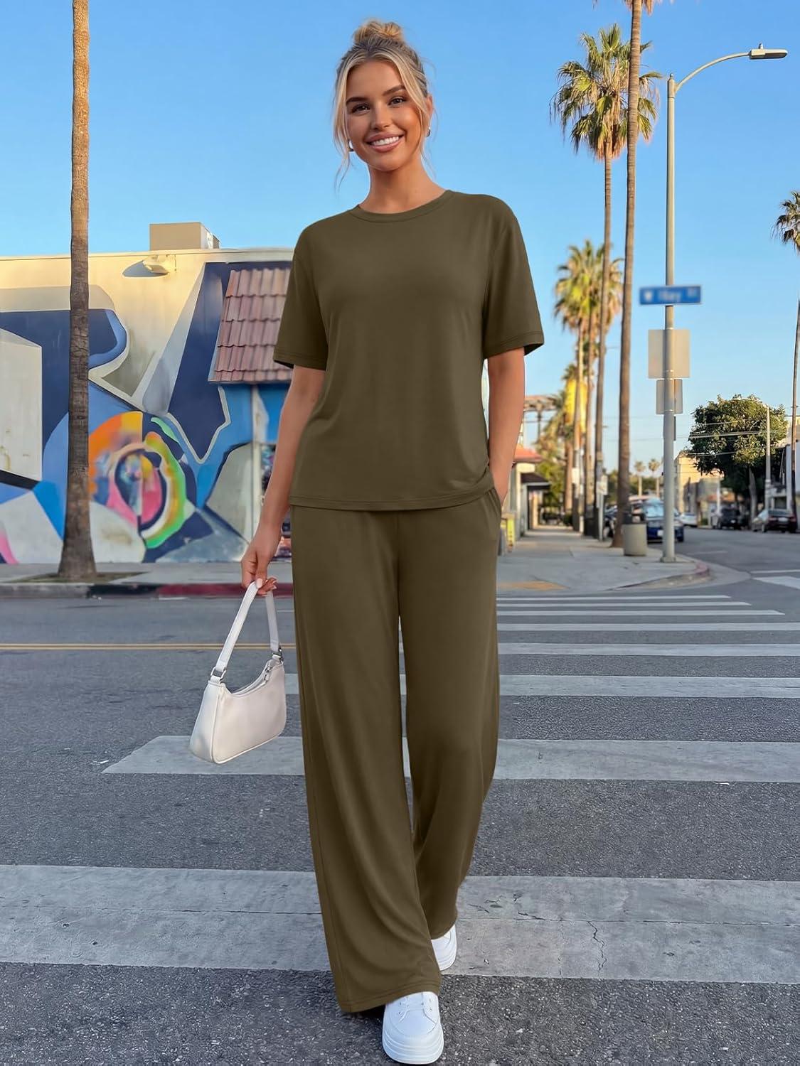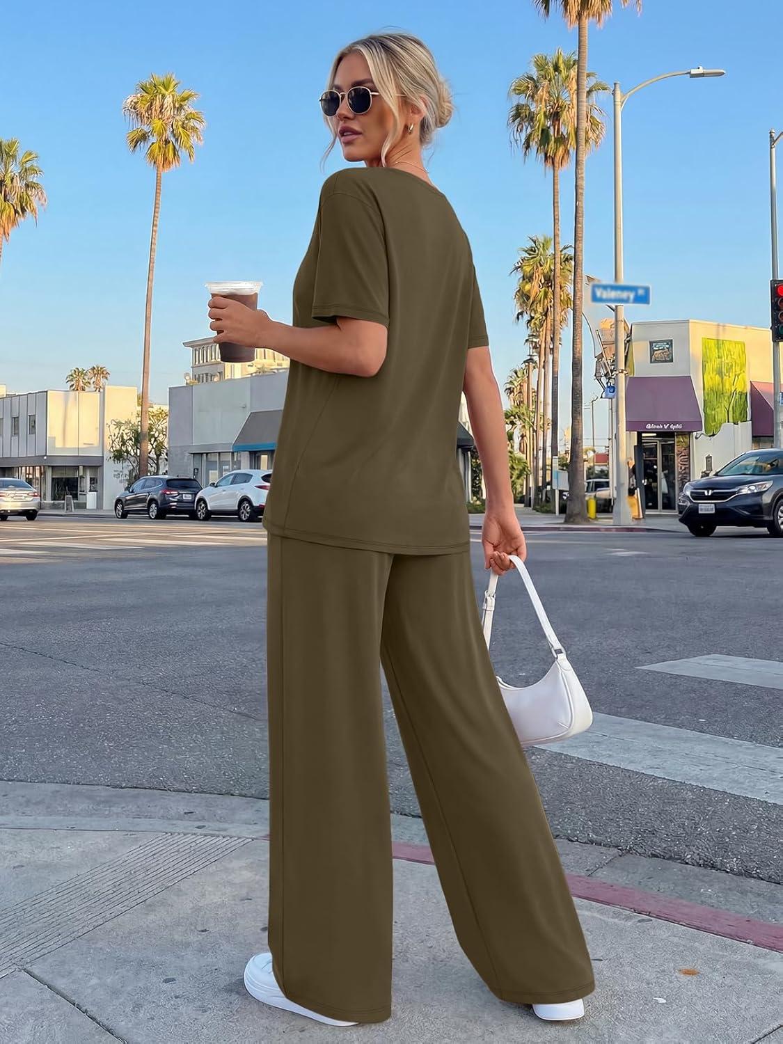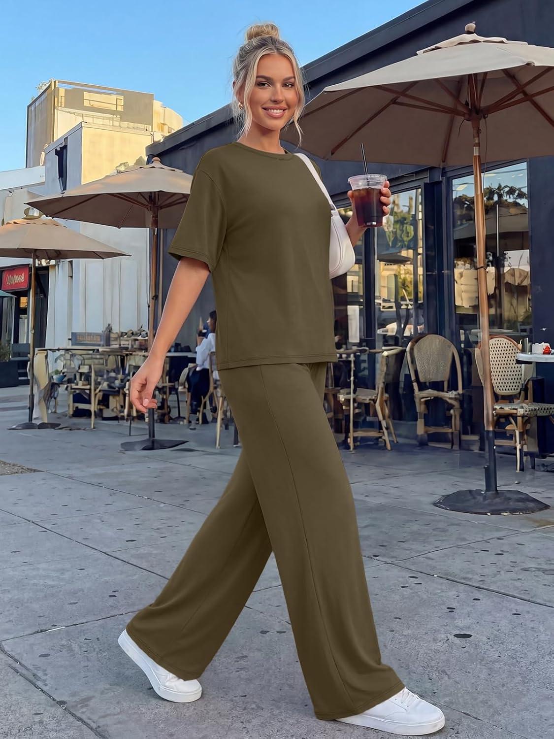 Trendy Queen Women 2 Piece Matching Summer Lounge Sets Clothing 2026 Short Sleeve Oversized Shirts & Pants Travel Outfit(Army)