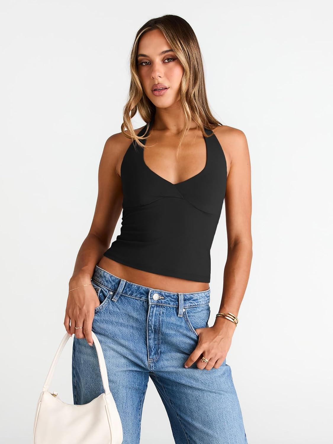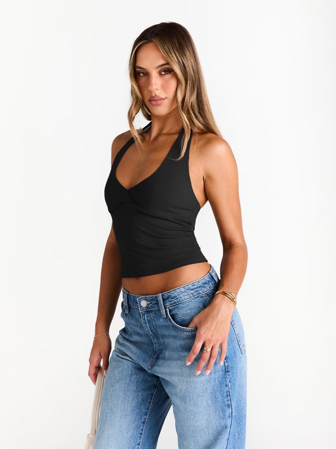 Trendy Queen Women Halter Tops Going Out Deep V Neck Summer 2025 Sleeveless Blackless Sexy Cute Crop Fashion Clothes(Black)