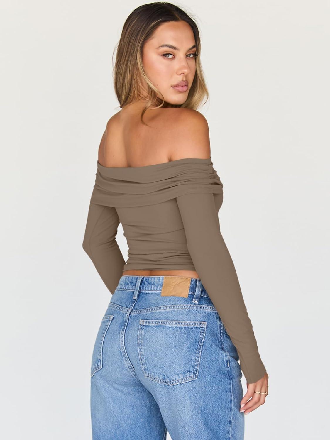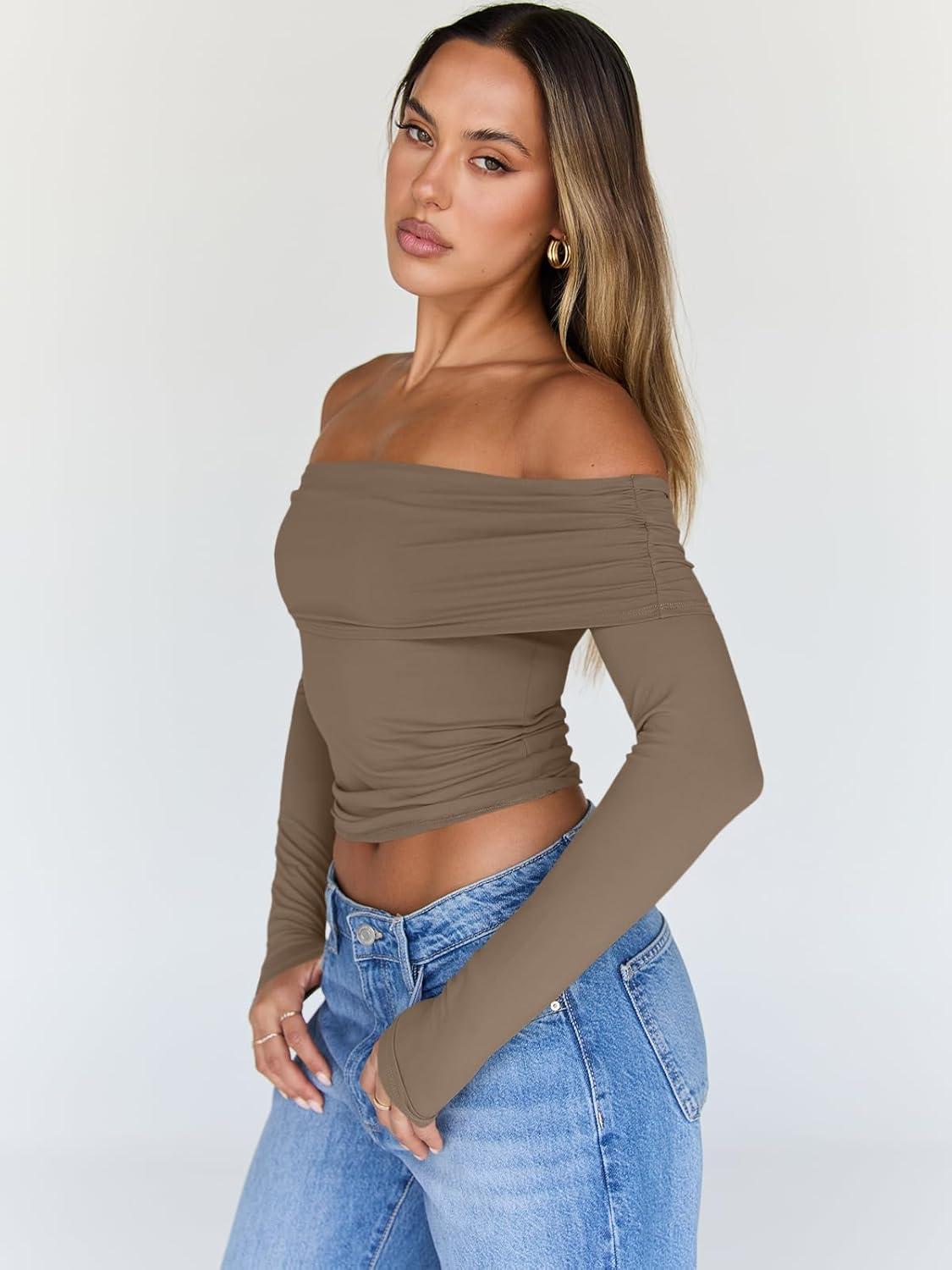 Trendy Queen Women Long Sleeve Shirts Off Shoulder Tops Going Out Crop Sexy Slim Fitted Y2K Fall Outfits 2025 Fashion Clothes(Coffee)