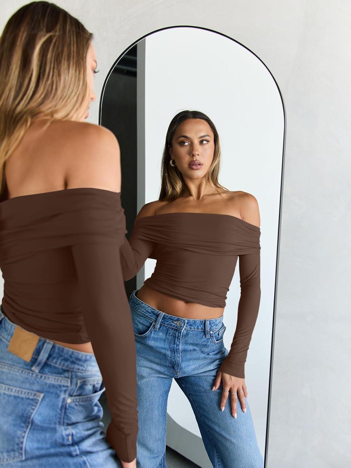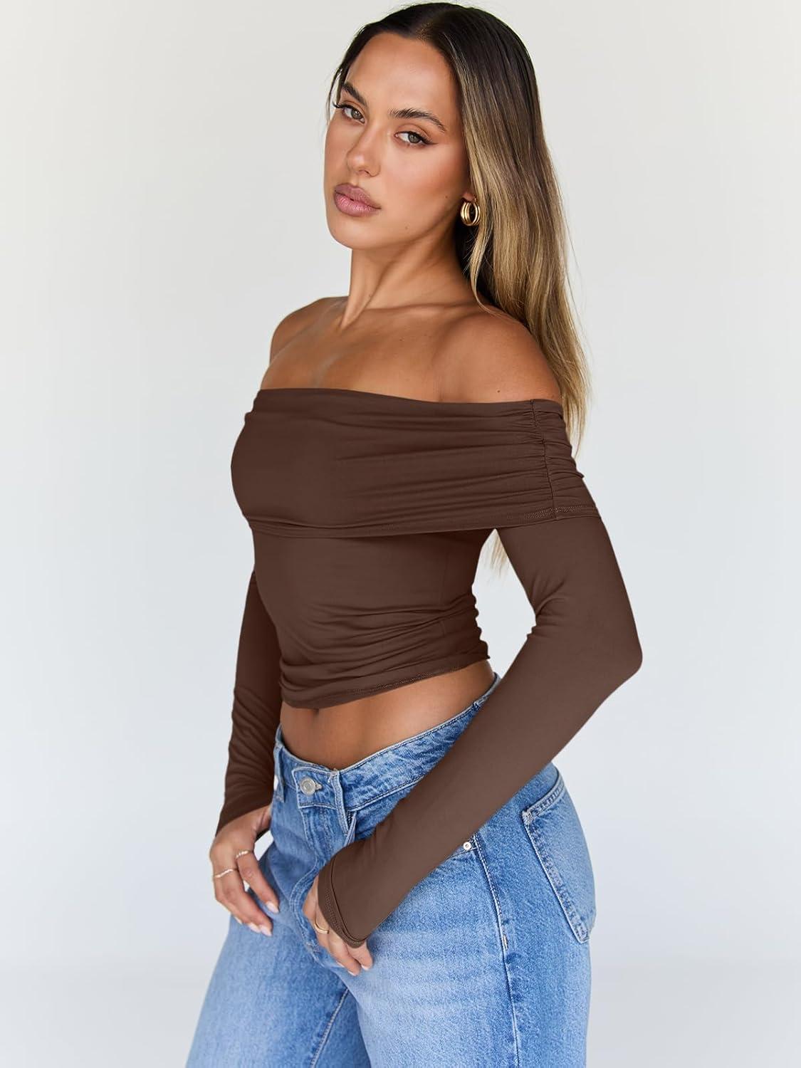 Trendy Queen Women Long Sleeve Shirts Off Shoulder Tops Going Out Crop Sexy Slim Fitted Y2K Fall Outfits 2026 Fashion Clothes(Coffee)