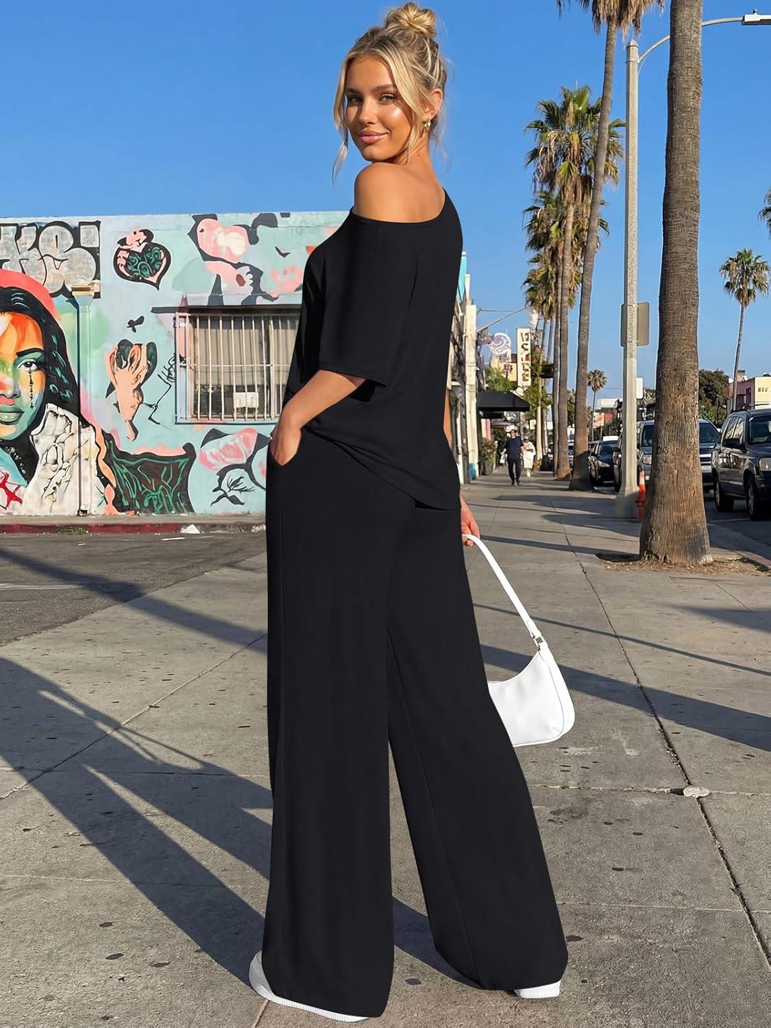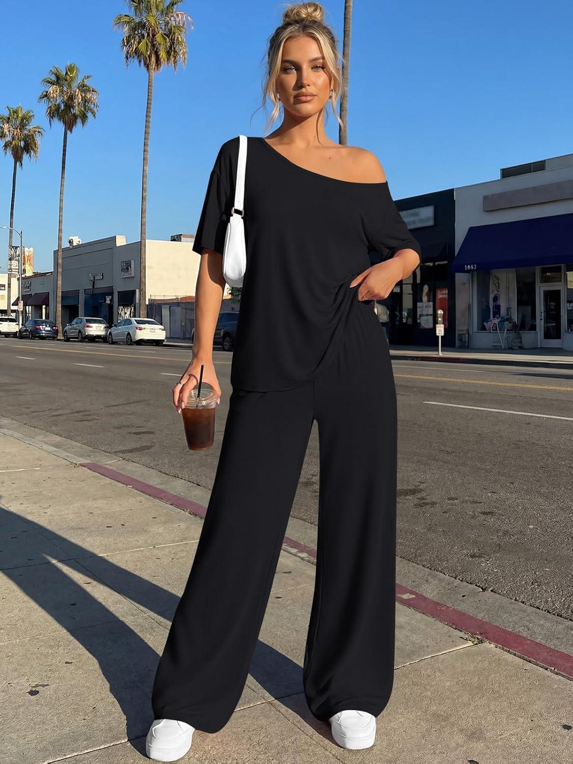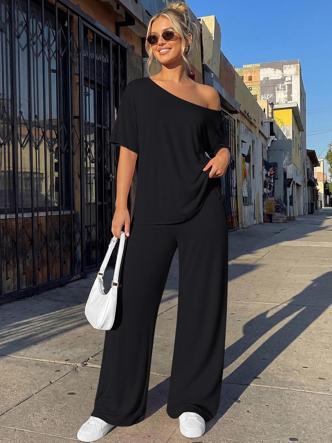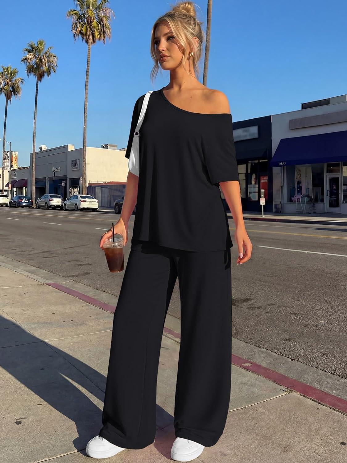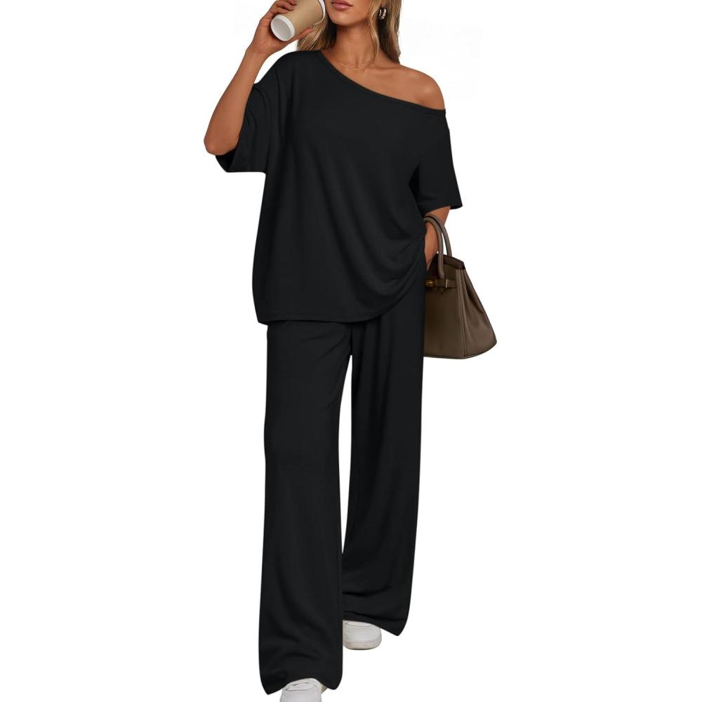 Trendy Queen Womens 2 Piece Lounge Sets Airport Travel Casual Outfits Off Shoulder Oversized Tshirts and Wide Leg Pants 2026(Black)