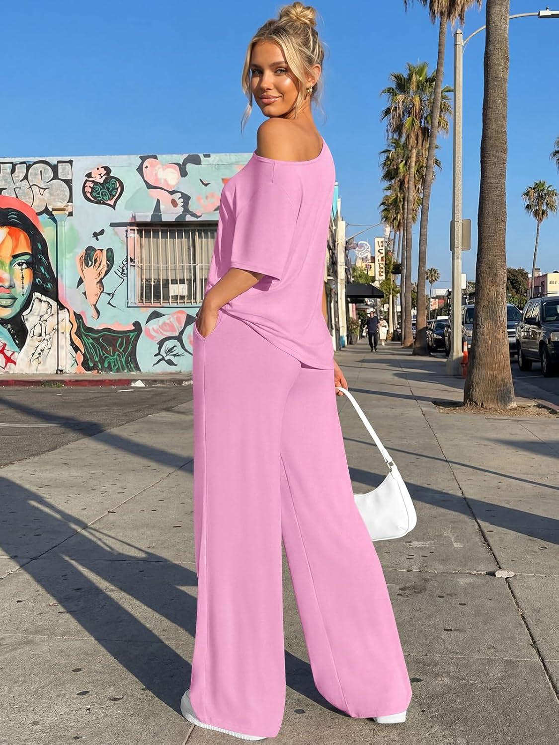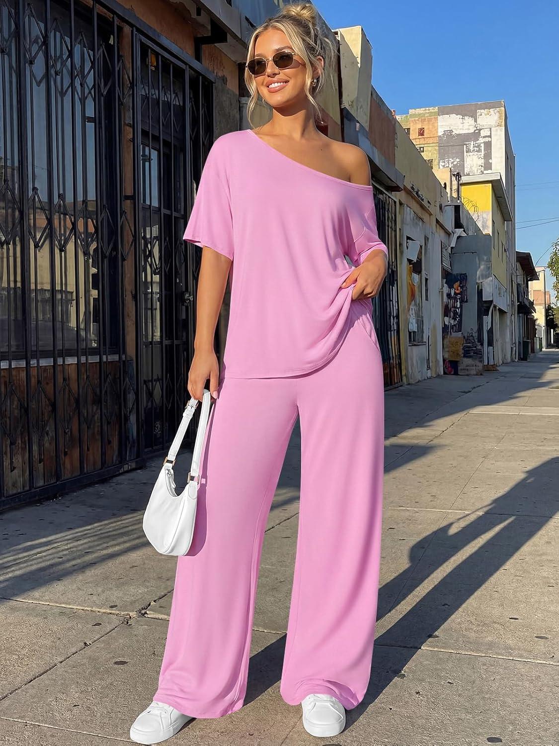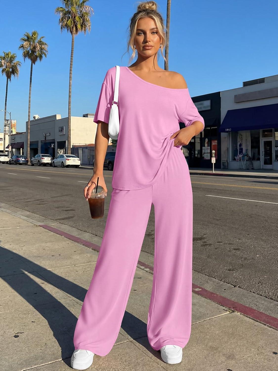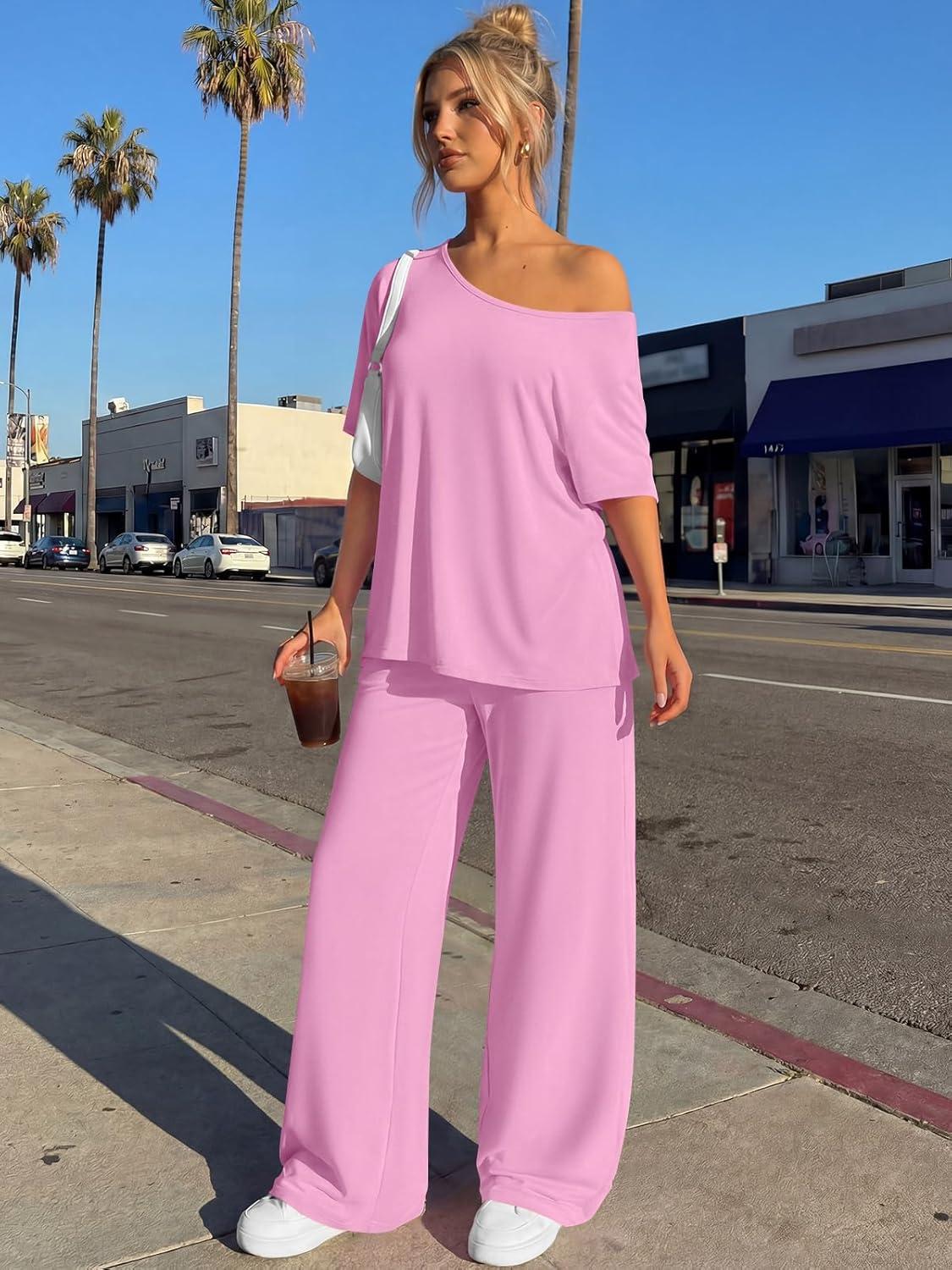 Trendy Queen Womens 2 Piece Lounge Sets Airport Travel Casual Outfits Off Shoulder Oversized Tshirts and Wide Leg Pants 2026(Pink)
