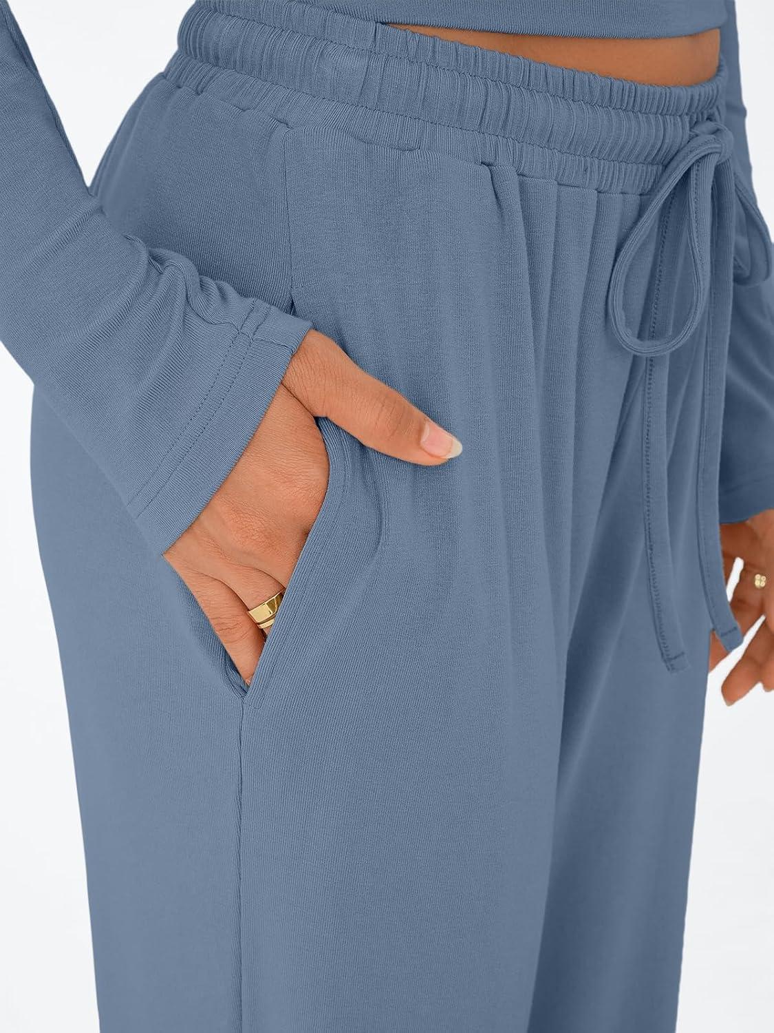 Trendy Queen Women's 2 Piece Matching Lounge Set Long Sleeve Slightly Crop Top Wide Leg Pants Casual Sweatsuit(Dusty Blue)