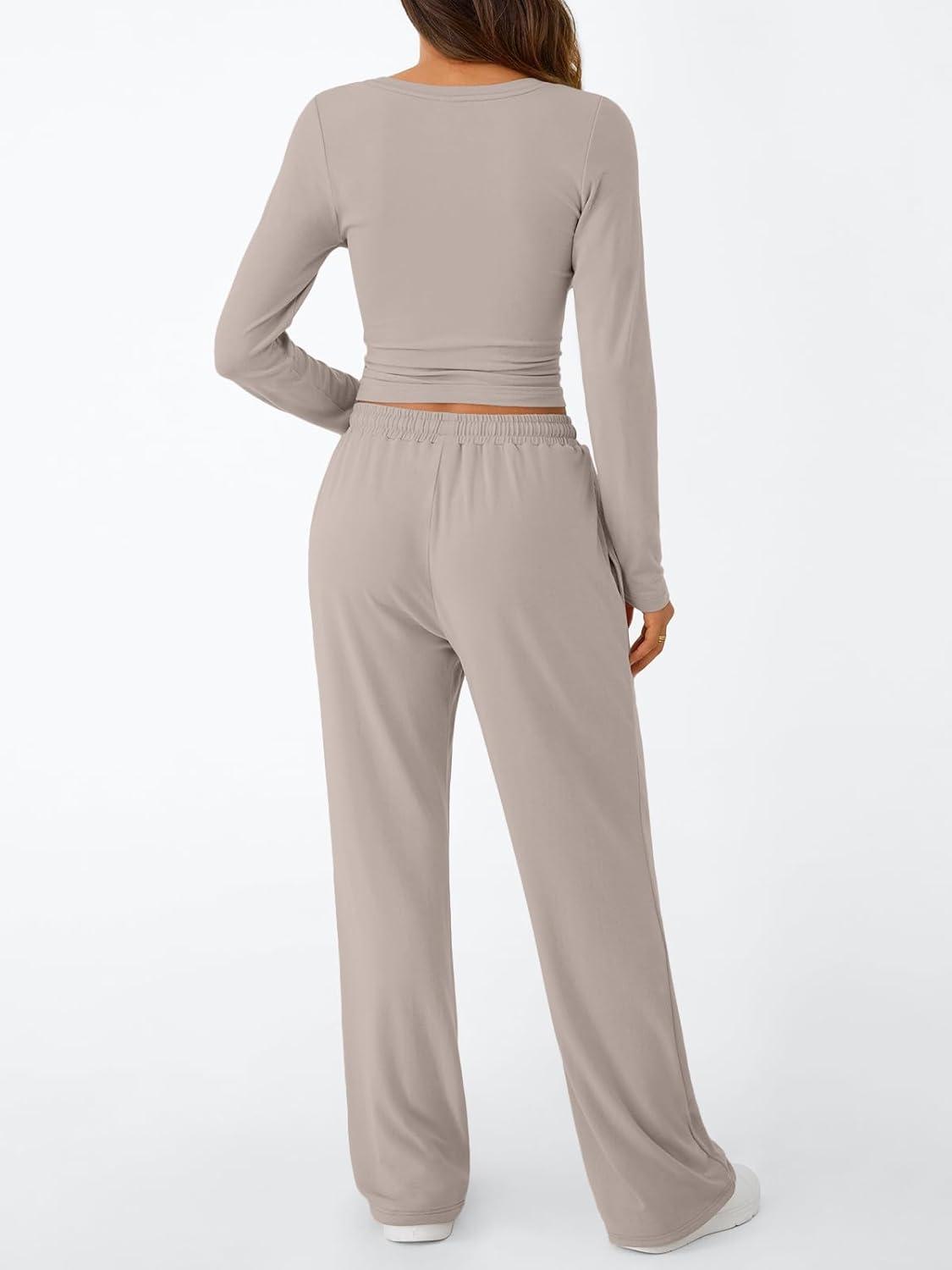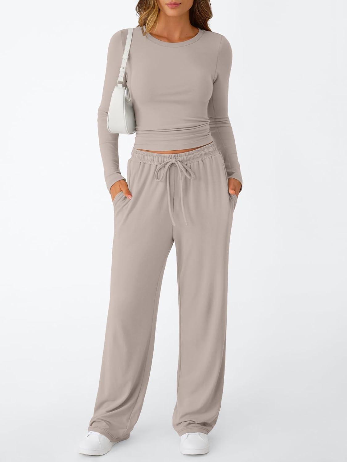 Trendy Queen Women's 2 Piece Matching Lounge Set Long Sleeve Slightly Crop Top Wide Leg Pants Casual Sweatsuit(Smoke)