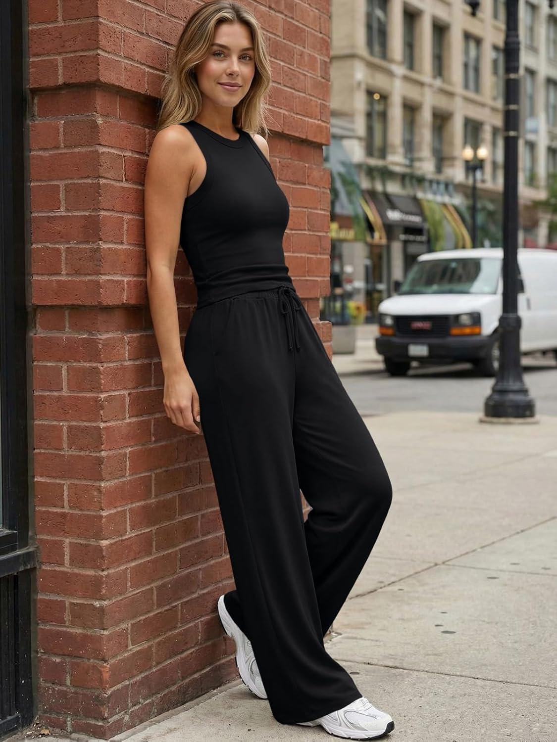 Trendy Queen Womens 2 Piece Sweatsuits Lounge Sets Track Suits Tank Tops Wide Leg Pants Spring Matching Outfits 2026(Black)