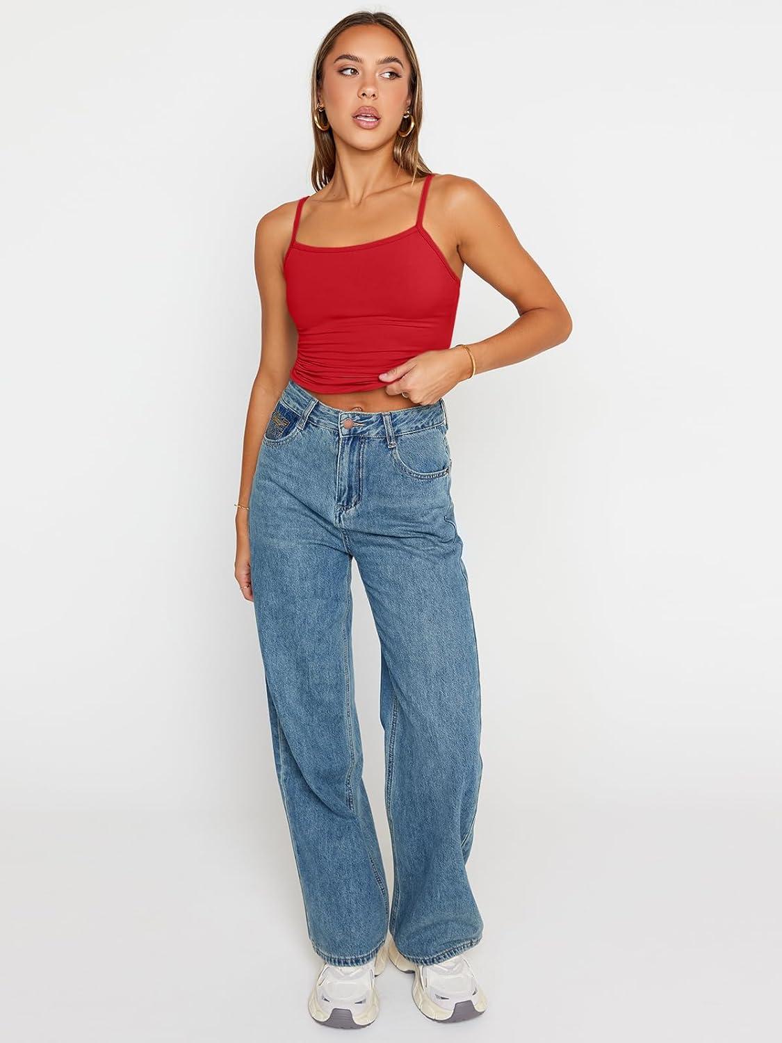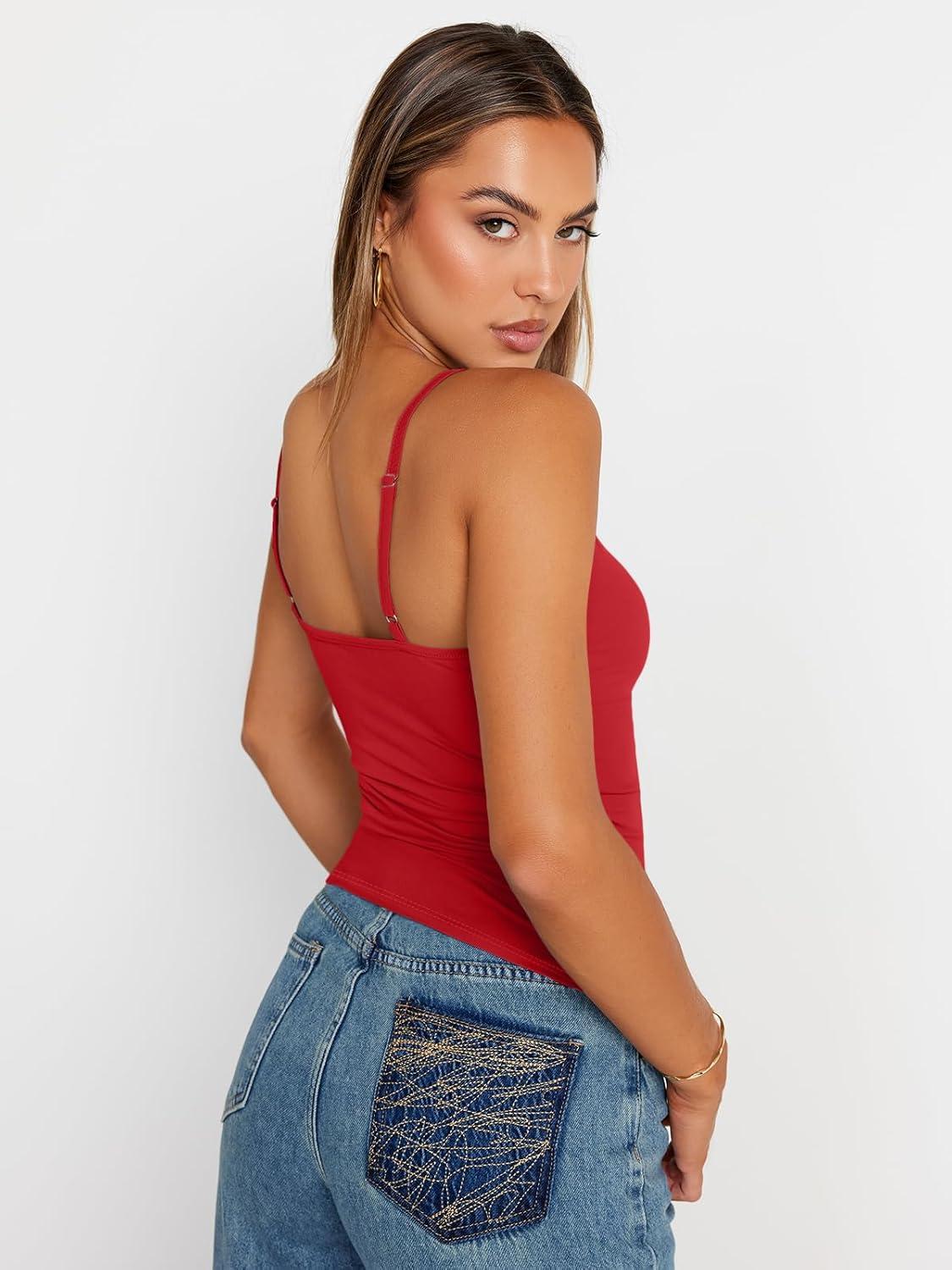 Trendy Queen Womens Adjustable Camisole Sleeveless Square Neck Spaghetti Strap Tank Tops Basic Shirt(Red)