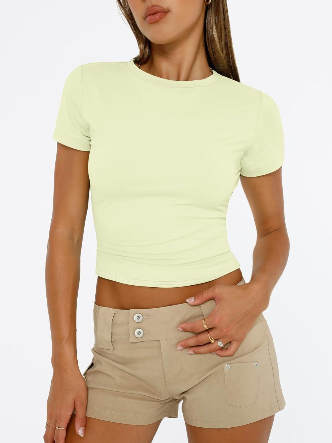 Trendy Queen Womens Basic T Shirts Summer Tops 2025 Short Sleeve Crop Tops Slim Fit Gym Workout Y2k Clothes(Lemon Yellow)