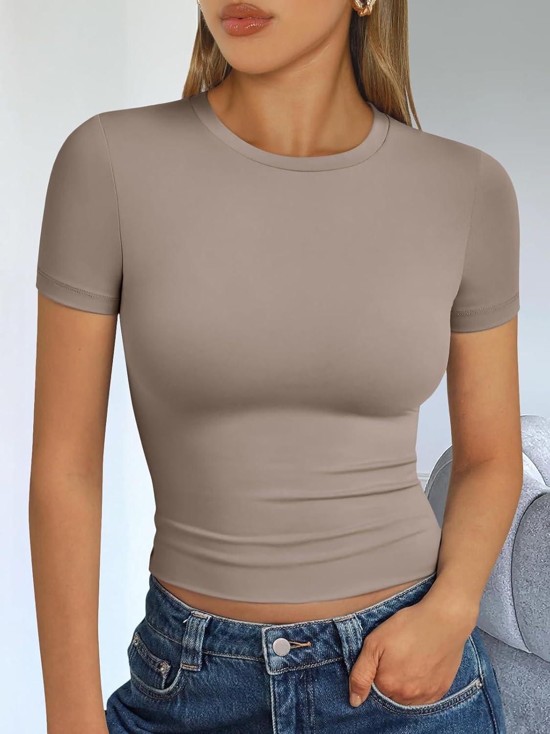 Trendy Queen Womens Basic T Shirts Summer Tops 2025 Short Sleeve Crop Tops Slim Fit Gym Workout Y2k Clothes(Taupe)